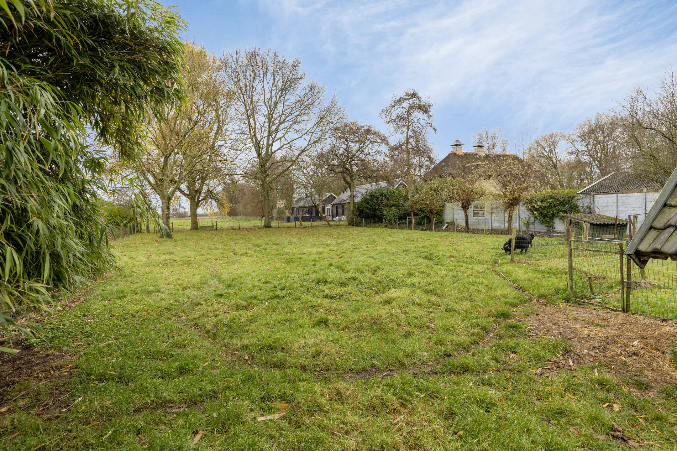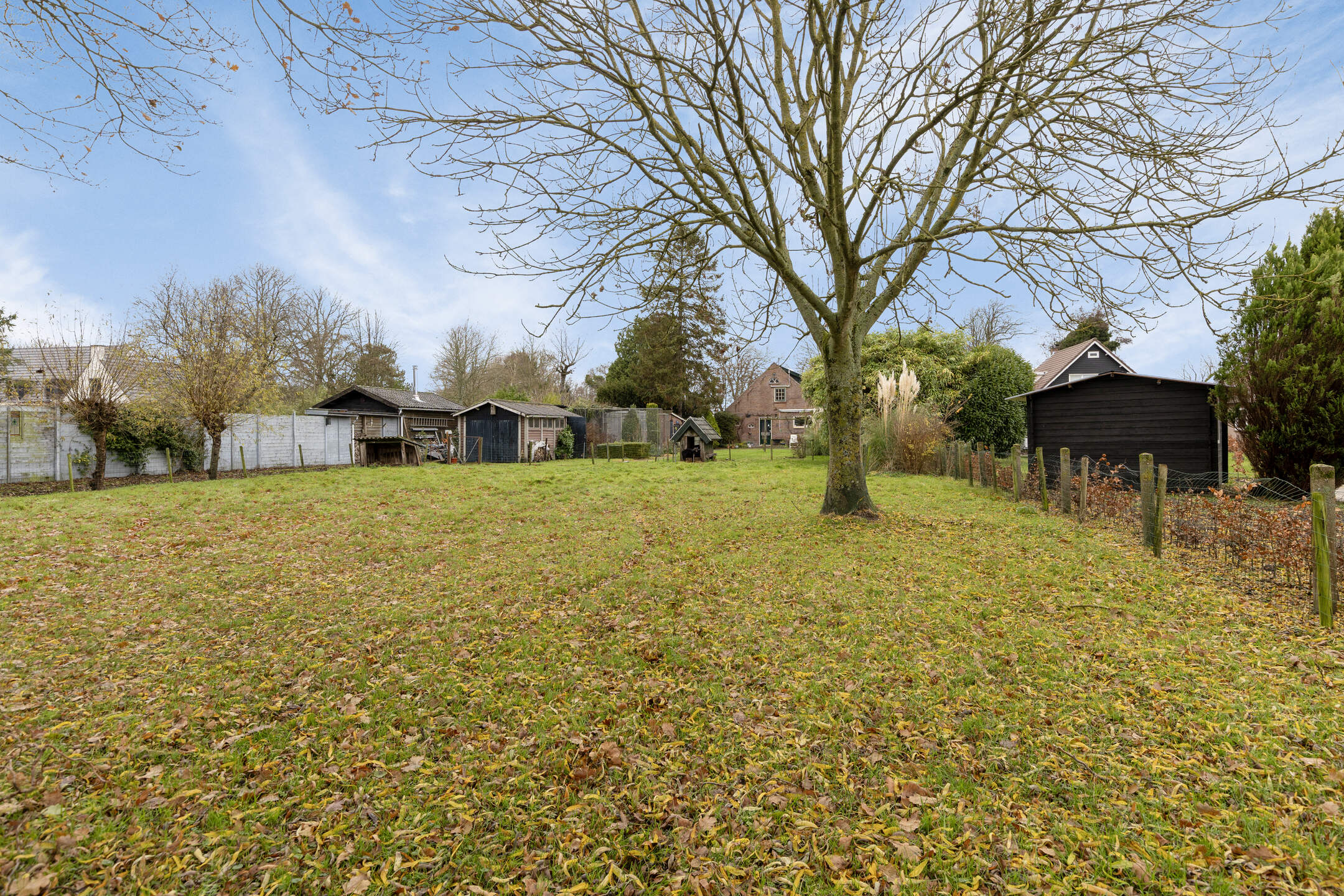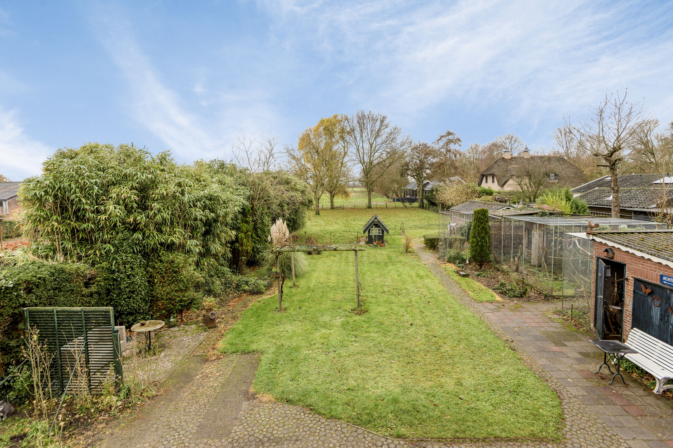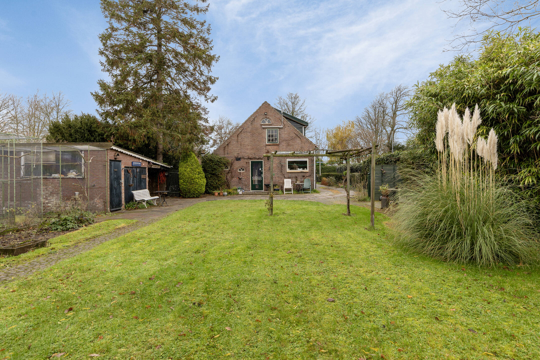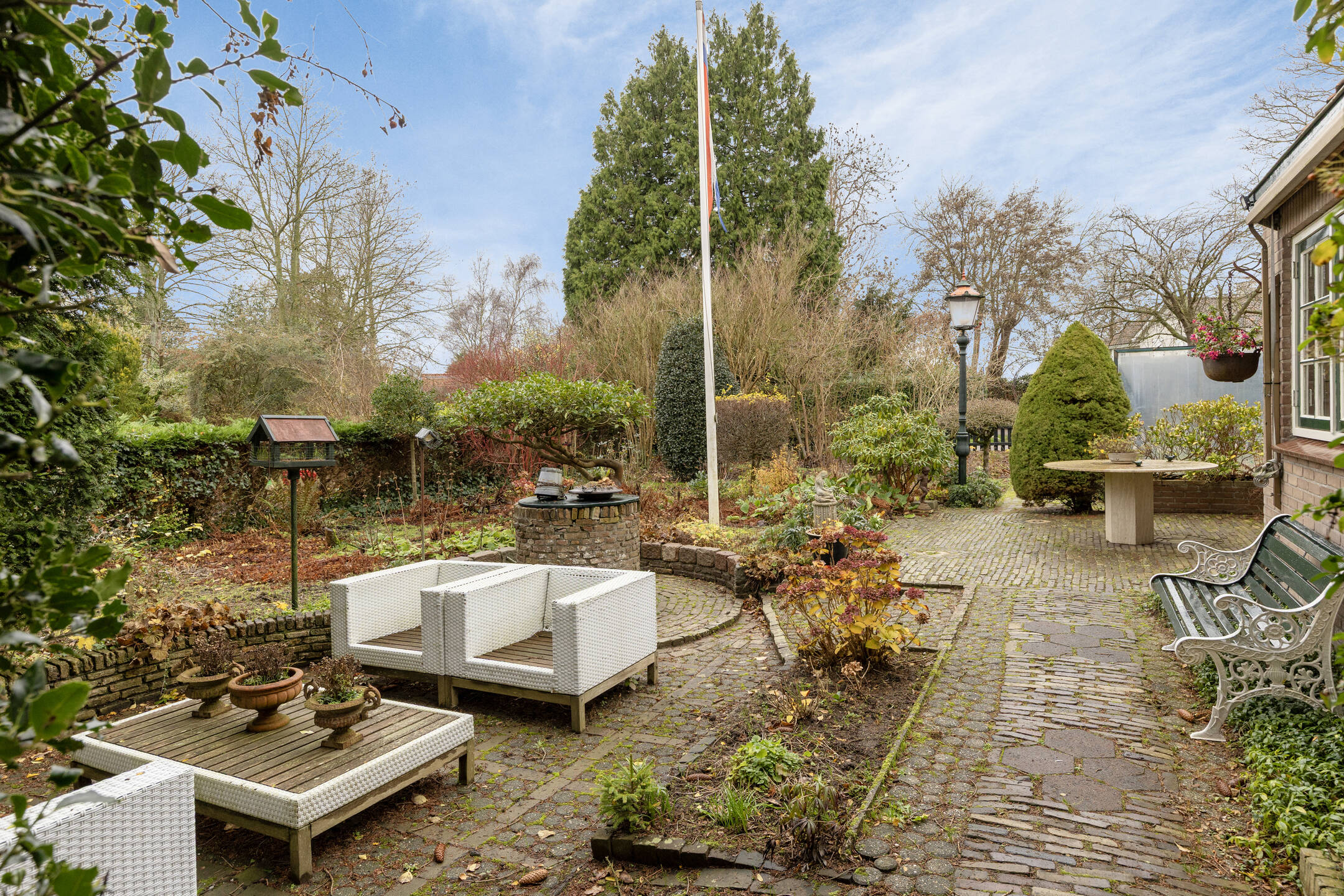 De royale tuin beschikt over diverse terrassen, borders, gras en hagen. Het achterste deel van het perceel is wei met geitenhok. Verder is er een eenvoudige overkapping/ carport, volière en 2 schuren. De diepe tuin is gelegen op het zuiden en heeft vrij uitzicht.