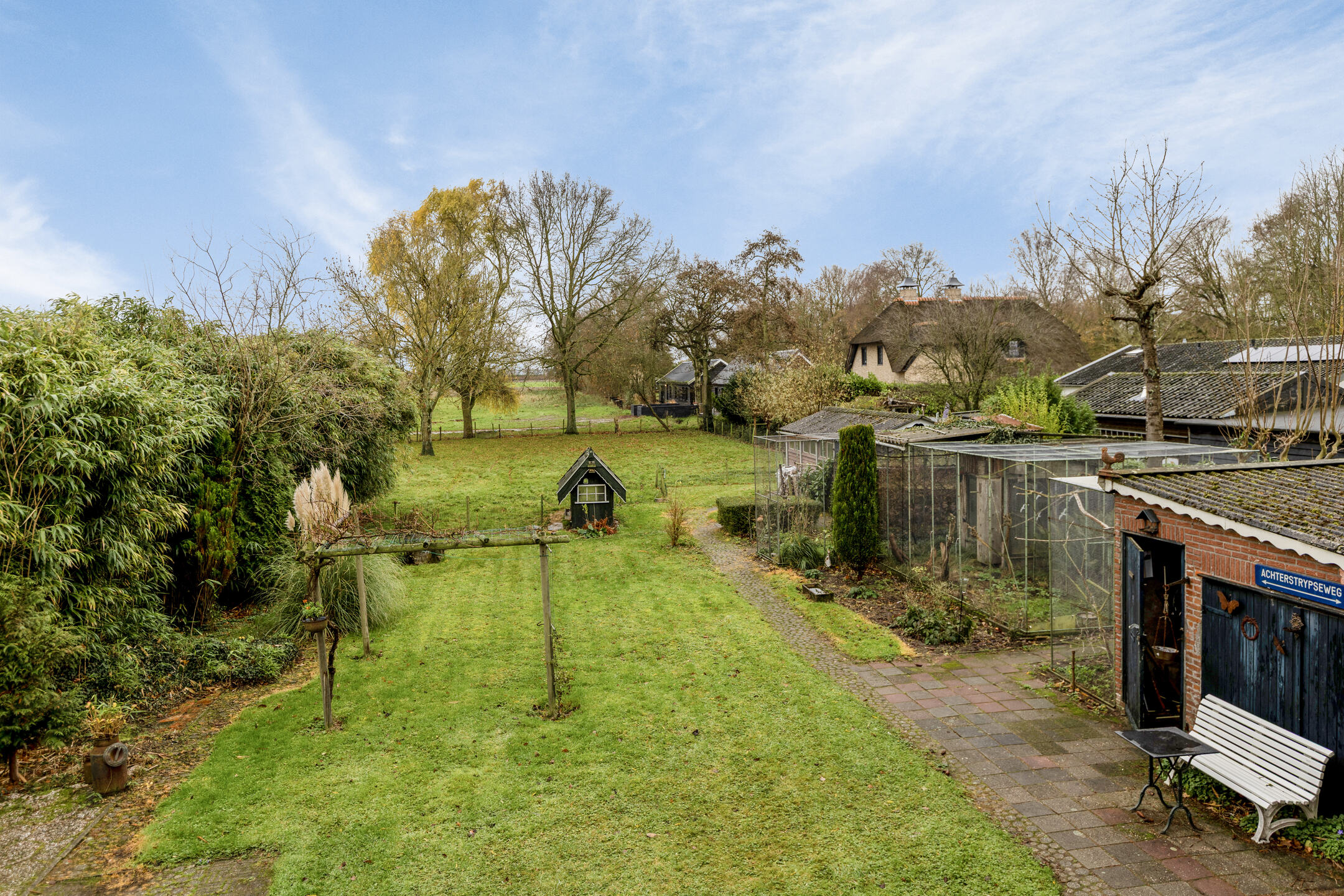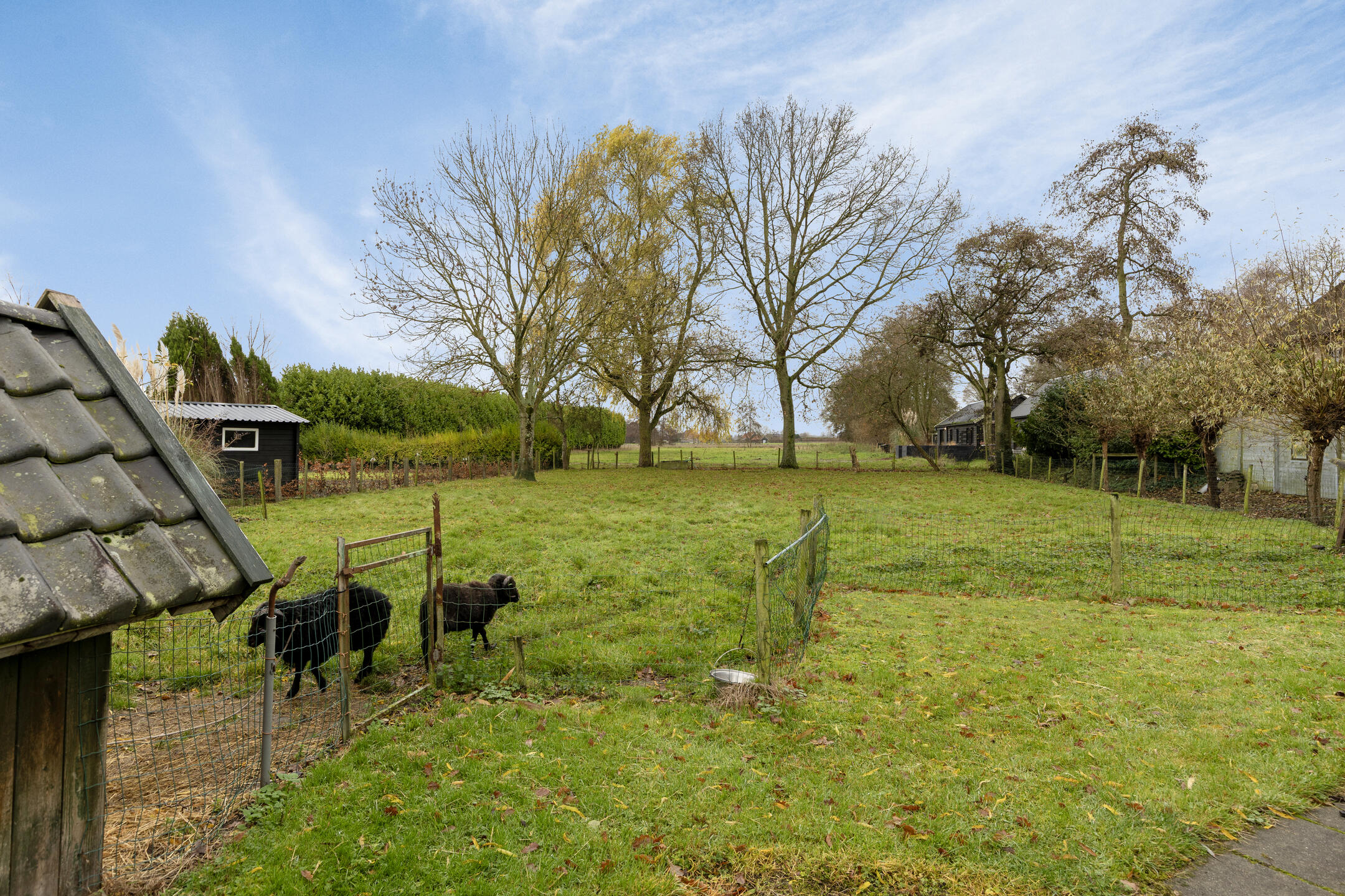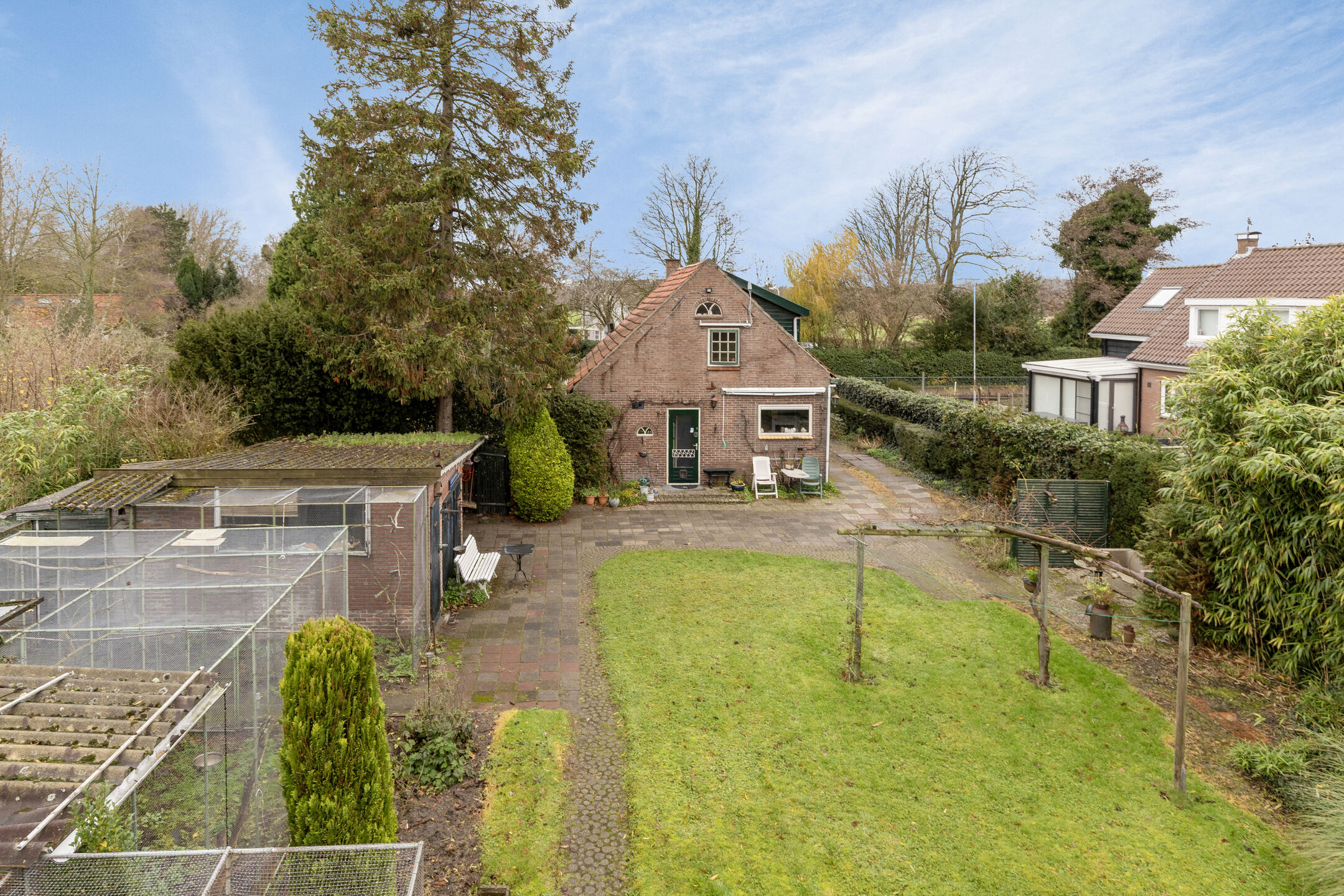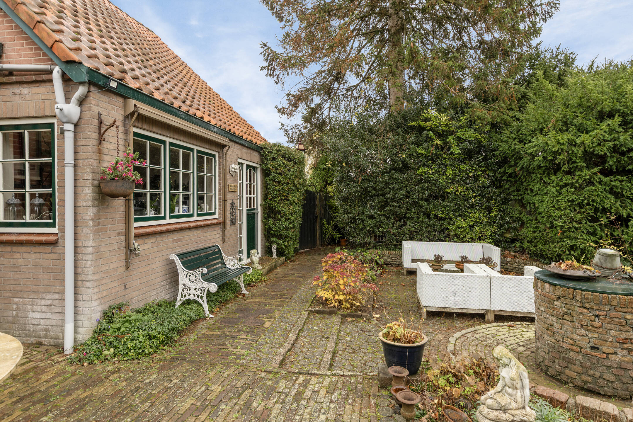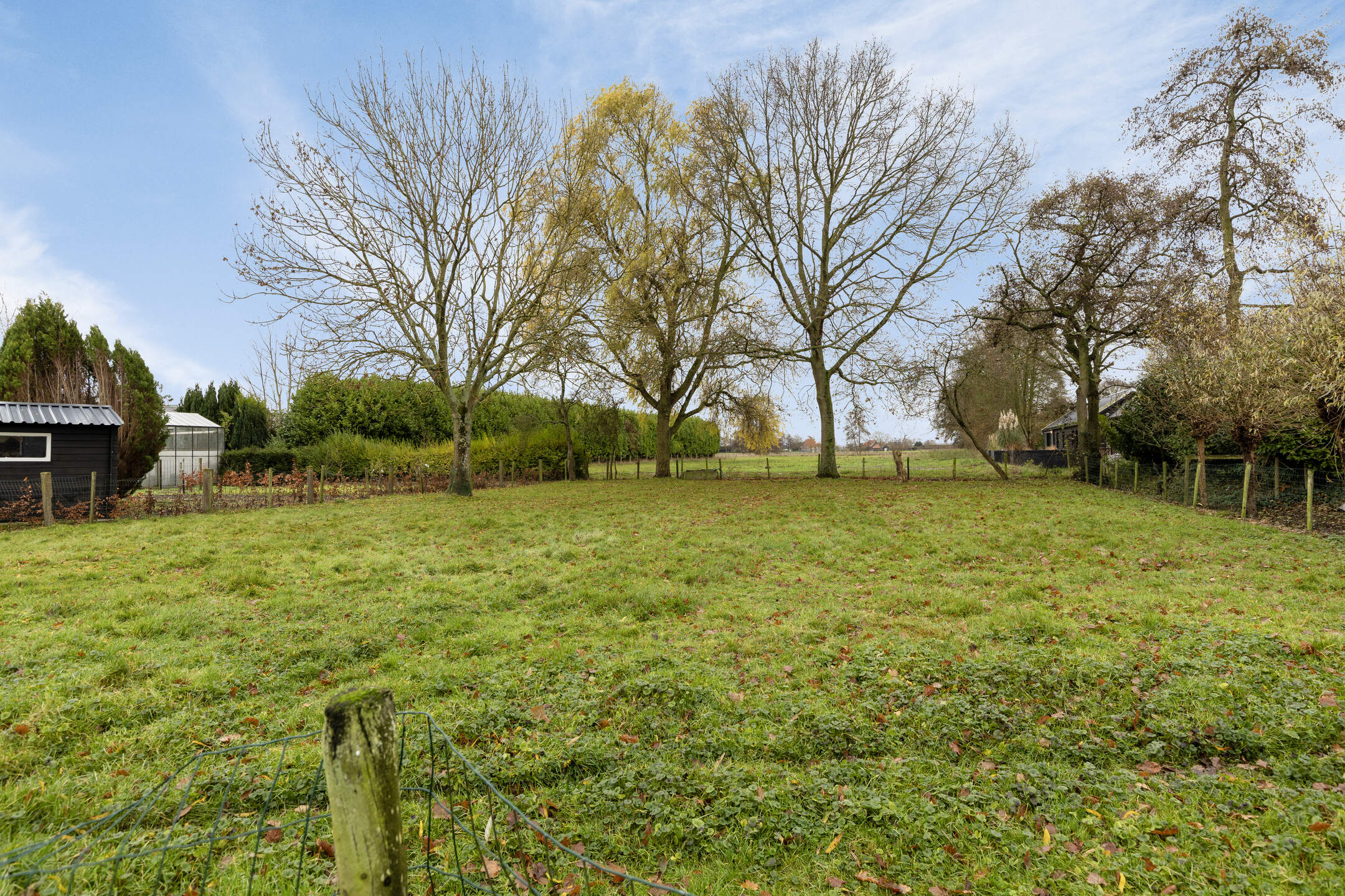 De royale tuin beschikt over diverse terrassen, borders, gras en hagen. Het achterste deel van het perceel is wei met geitenhok. Verder is er een eenvoudige overkapping/ carport, volière en 2 schuren. De diepe tuin is gelegen op het zuiden en heeft vrij uitzicht.
