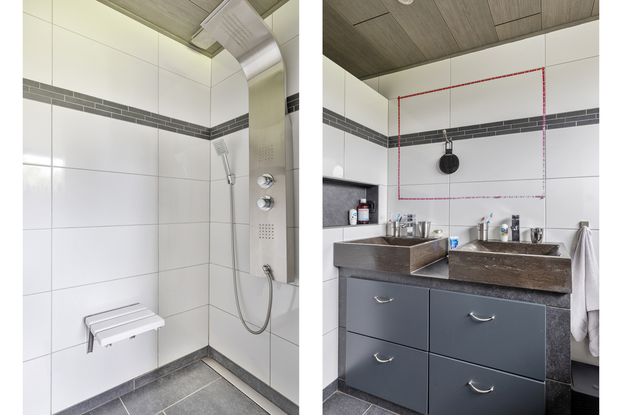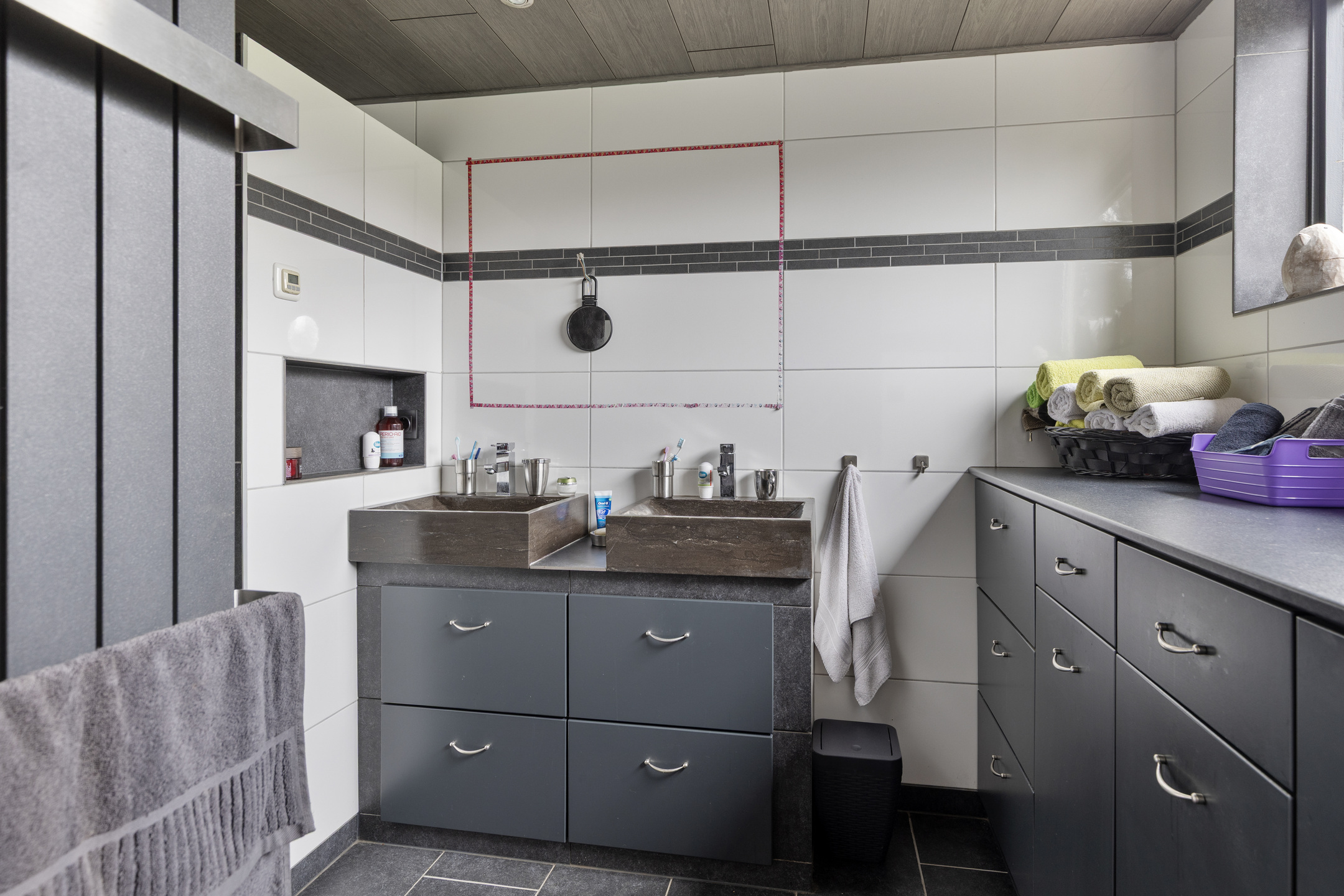 Vanuit de bijkeuken heeft u toegang tot de badkamer. Deze is voorzien van inloopdouche, dubbele wastafel, radiator en elektrische vloerverwarming.