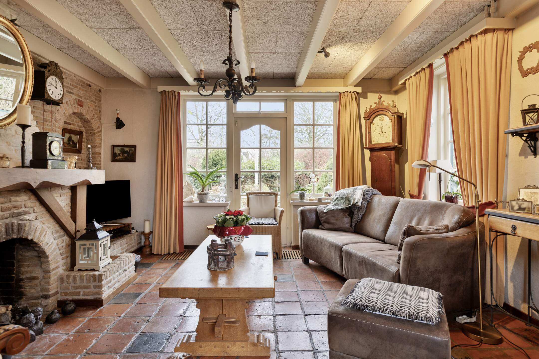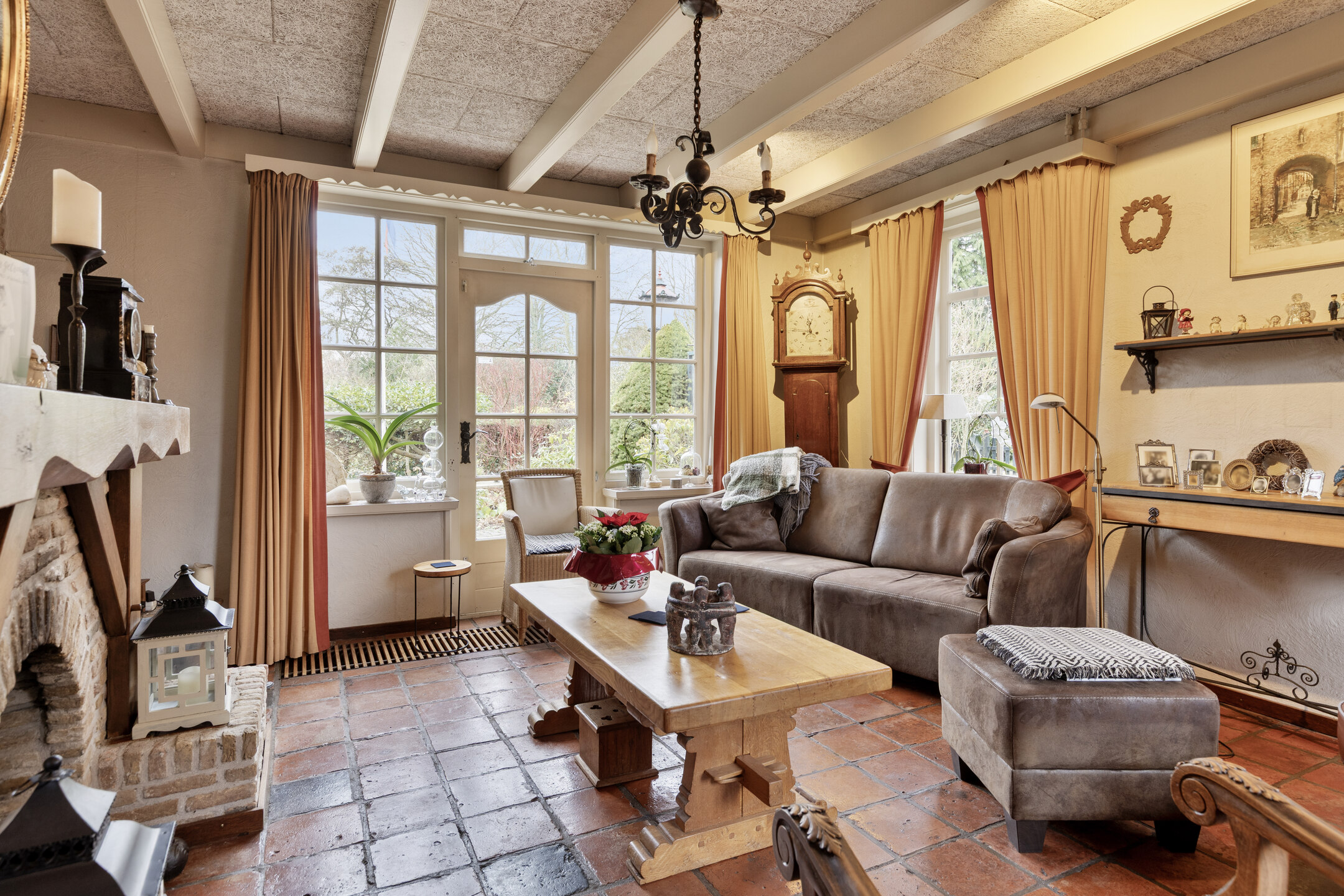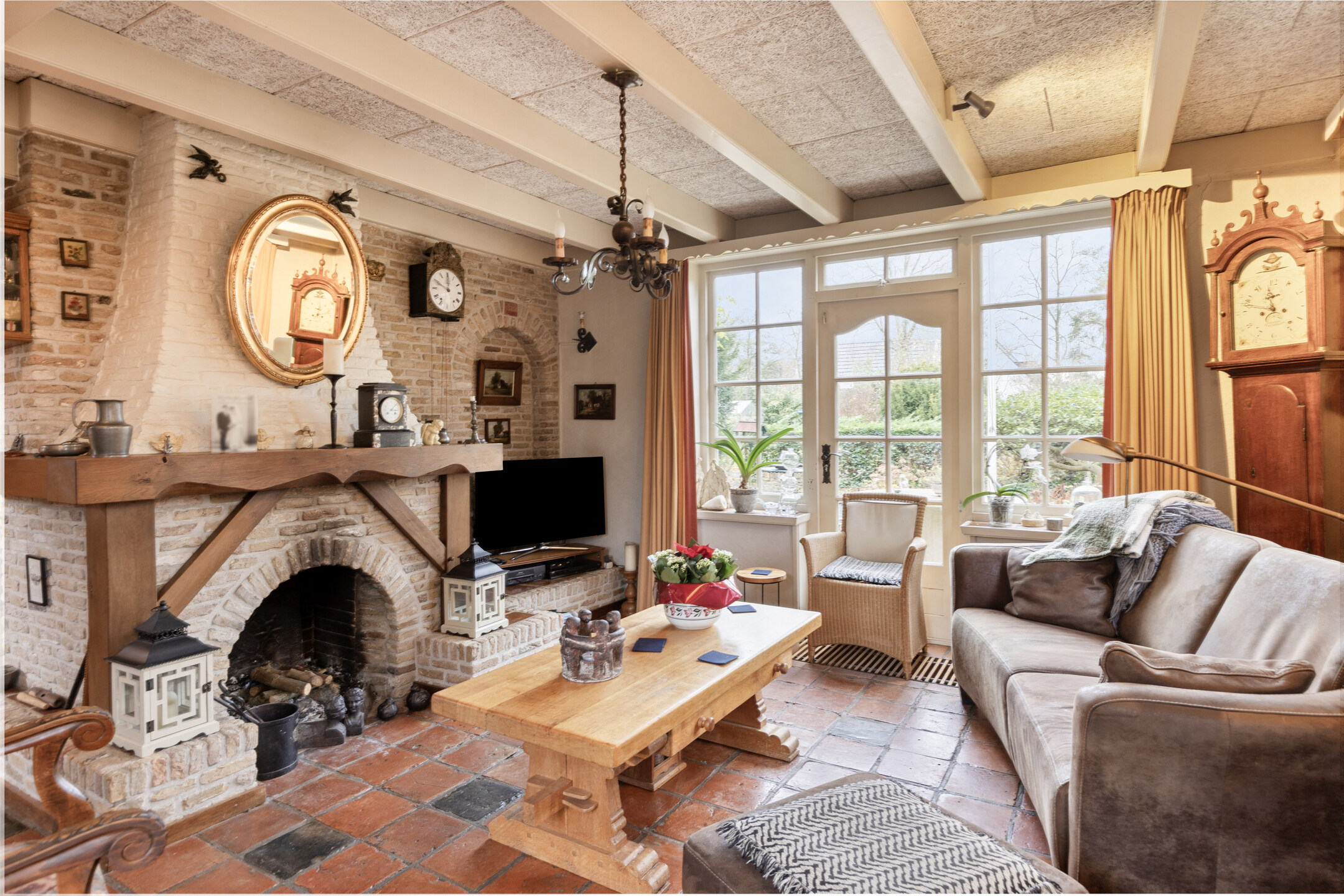 De sfeervolle woonkamer is gelegen aan de voorzijde en voorzien van een plavuizenvloer met vloerverwarming en schouw met openhaard. Tevens bevindt zich hier een terrasdeur naar de tuin.