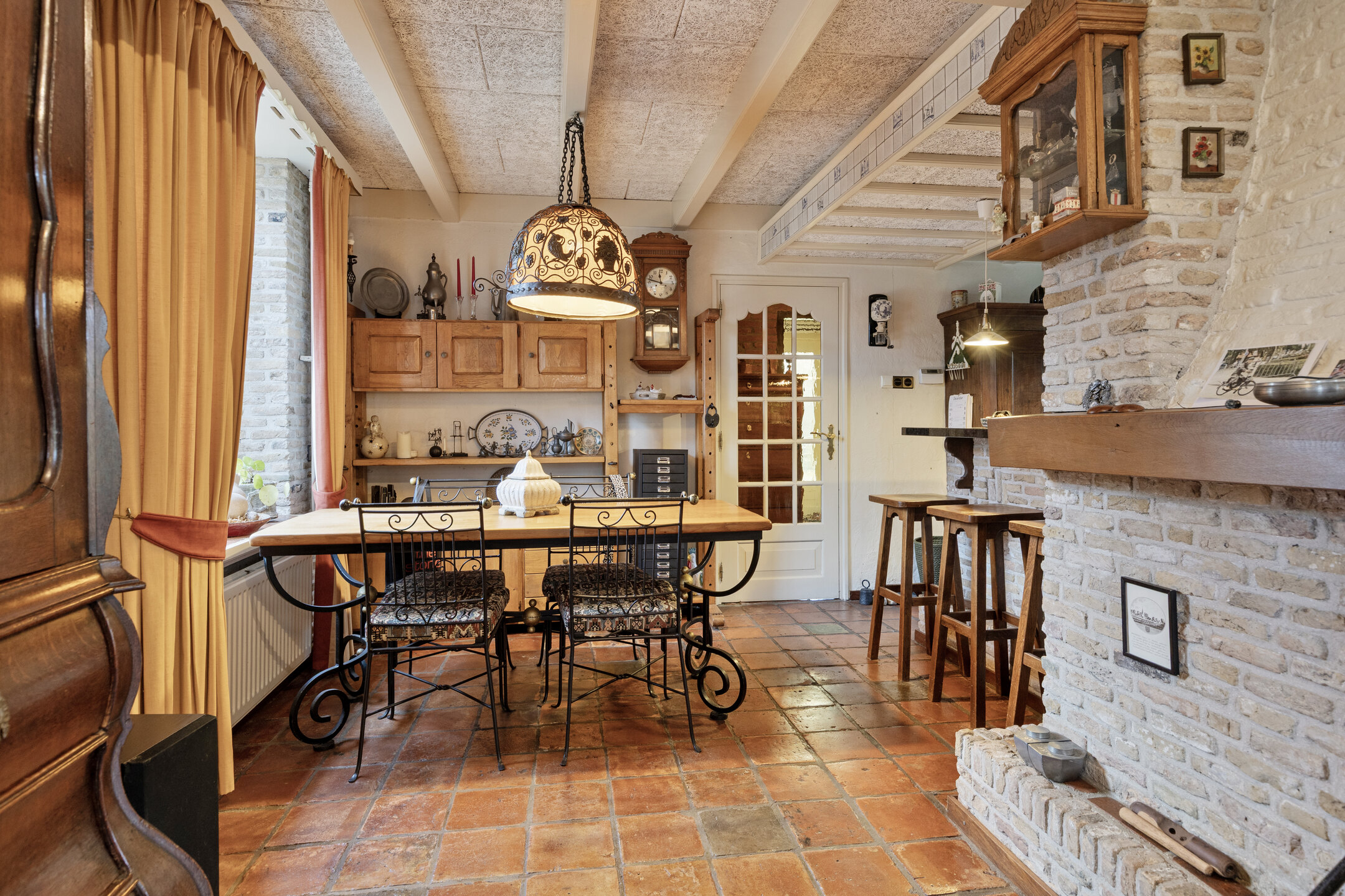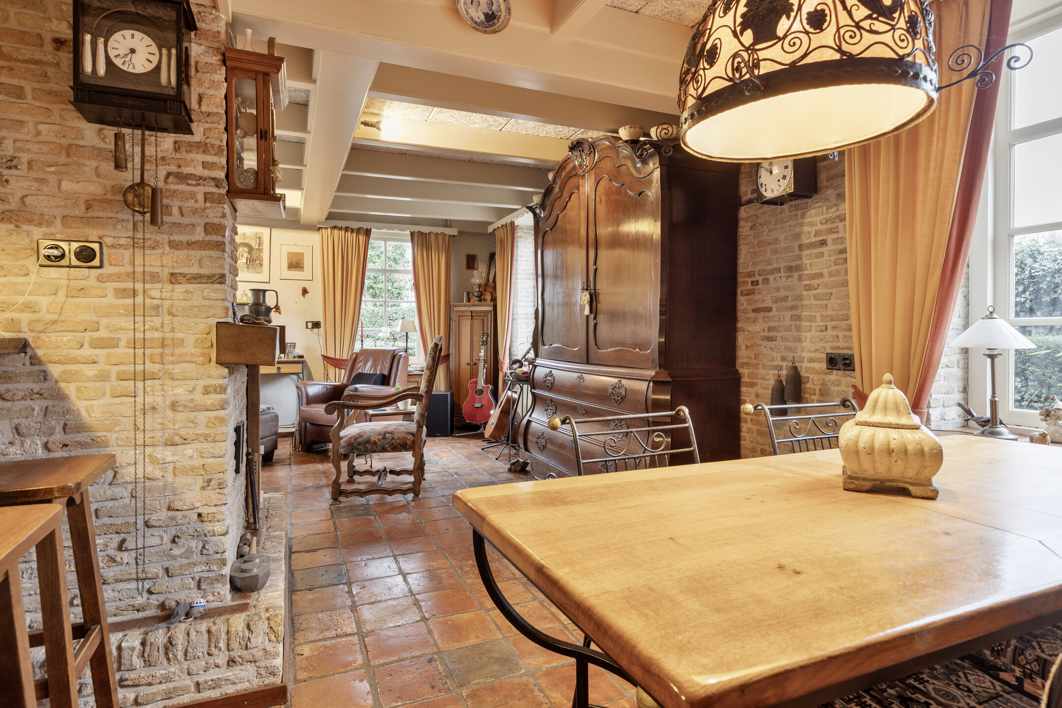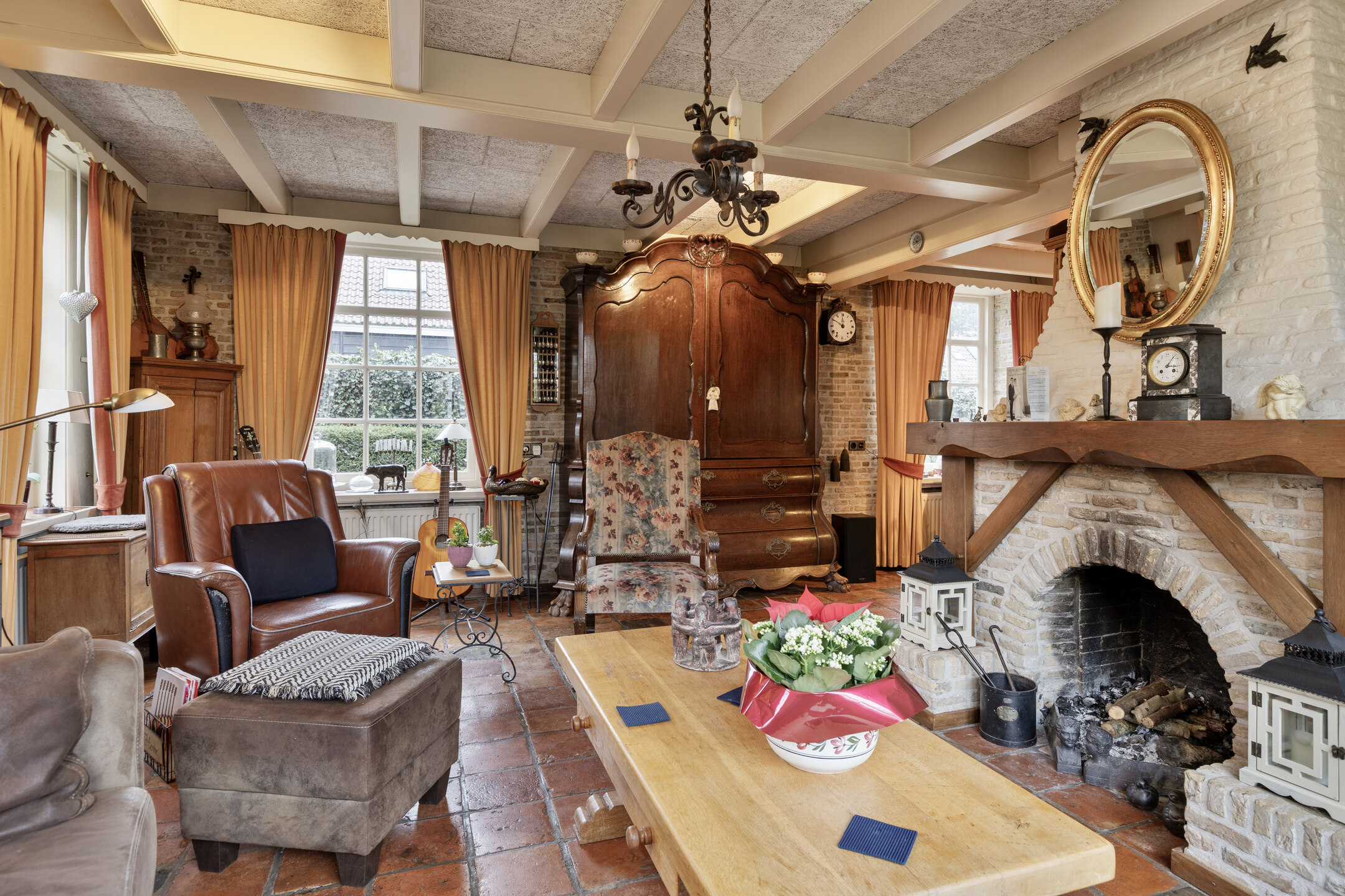 De sfeervolle woonkamer is gelegen aan de voorzijde en voorzien van een plavuizenvloer met vloerverwarming en schouw met openhaard. Tevens bevindt zich hier een terrasdeur naar de tuin.