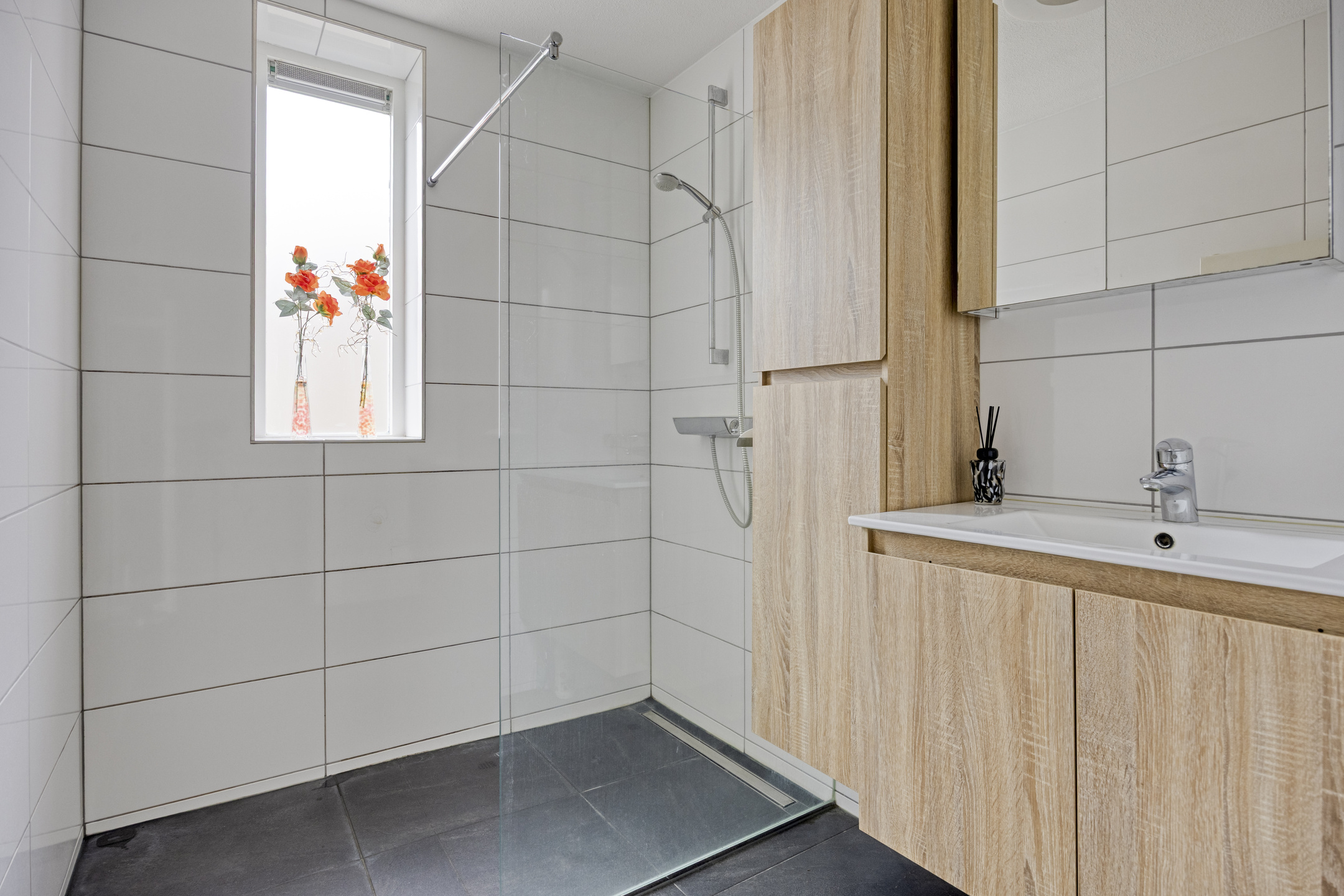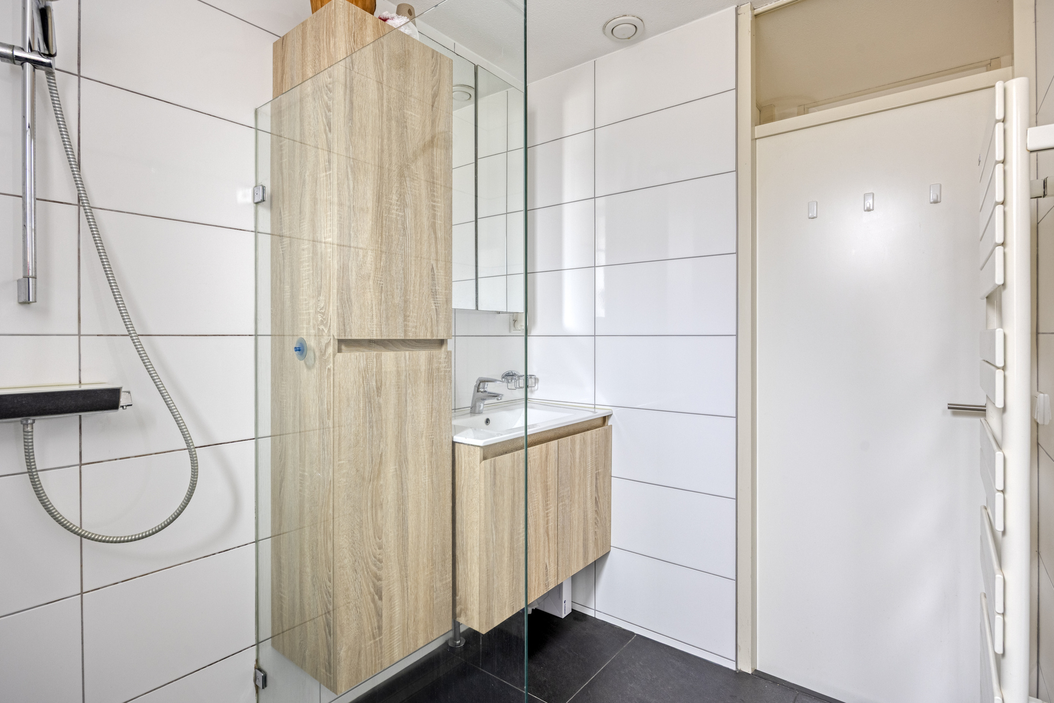 Moderne betegelde badkamer in wit/ grijs uitgevoerd met inloopdouche, wastafelmeubel en designradiator. De ruimte beschikt over daglicht middels het gevelraam.