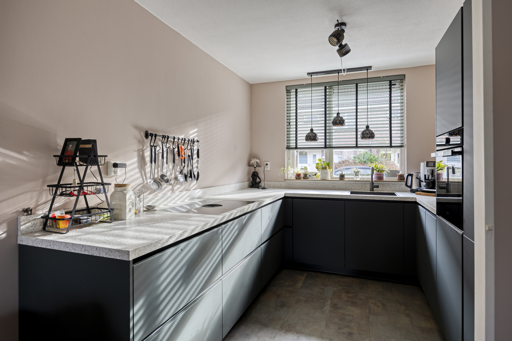 De prachtige open keuken in moderne U-opstelling bevindt zich aan de voorzijde van het appartement. Deze is uitgevoerd met greeploze kastjes, een mooi werkblad met spoelunit, Bora inductieplaat met afzuiging, oven, vaatwasmachine en grote koelkast.