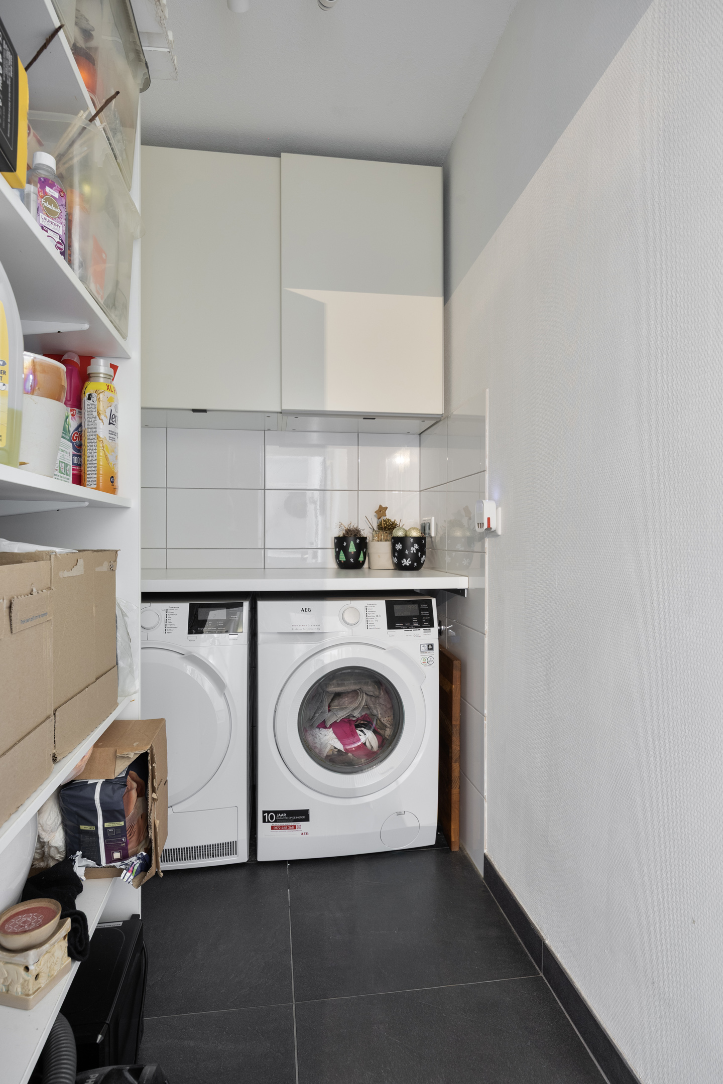 Separate, betegelde wasruimte voor de opstelplaats van de wasmachine en wasdroger. De ruimte met plavuizen vloer biedt tevens bergruimte.