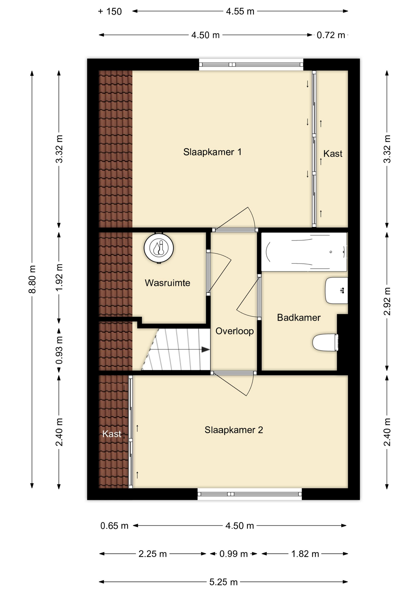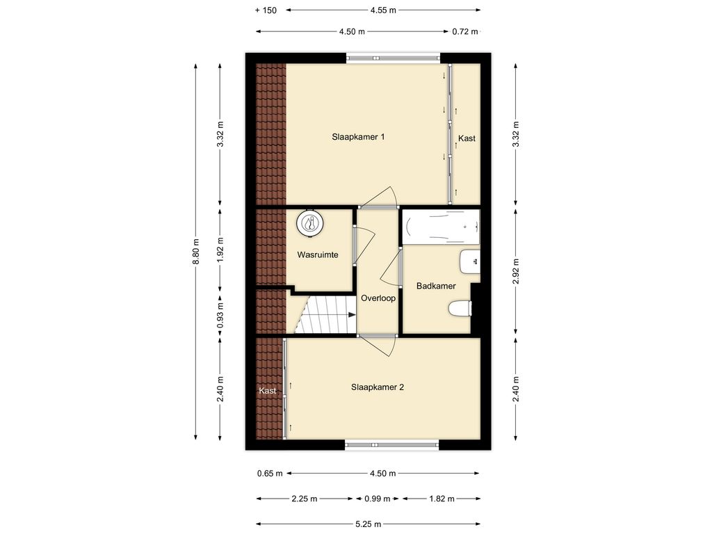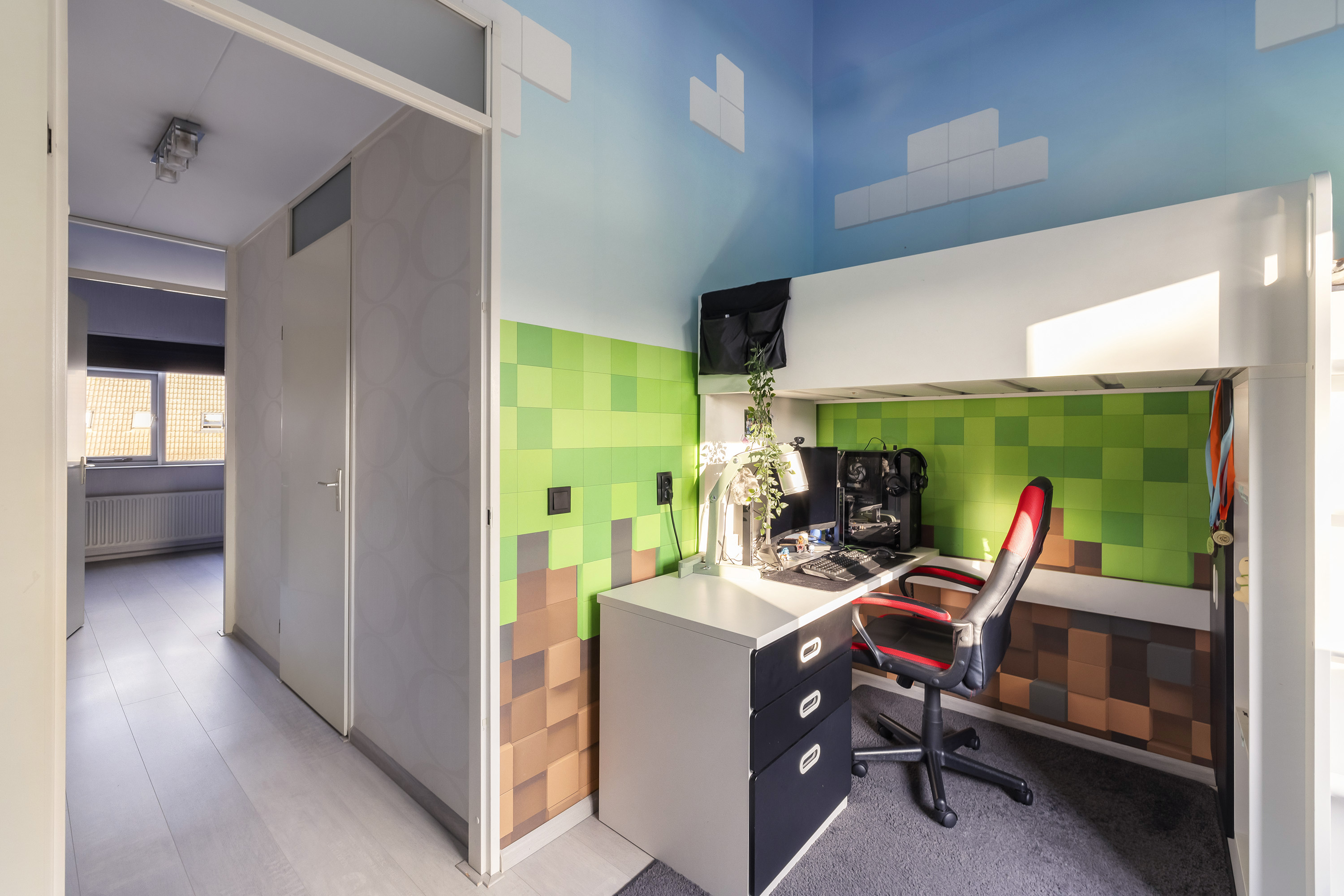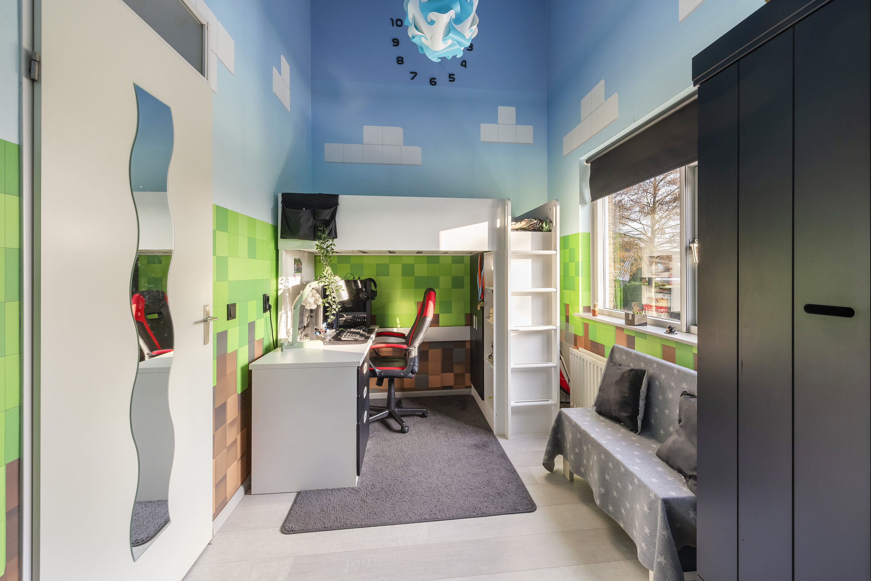 De overloop biedt toegang tot twee slaapkamers, de badkamer en de technische ruimte. De hoofdslaapkamer is gelegen aan de achterzijde van de woning en beschikt over een vaste schuifdeurkast. Vanuit deze slaapkamer is de bergvliering in de nok bereikbaar, waar de mechanische ventilatie-unit is opgesteld. De tweede slaapkamer ligt aan de voorzijde van de woning en is voorzien van knieschotbergruimte. De badkamer is voorzien van een ligbad met douche voorziening, toilet en wastafel. In de technische ruimte bevinden zich de warmtepomp met boiler (6 kW, 250 liter Daikin, 2024). De verdieping is afgewerkt met een laminaat vloer.