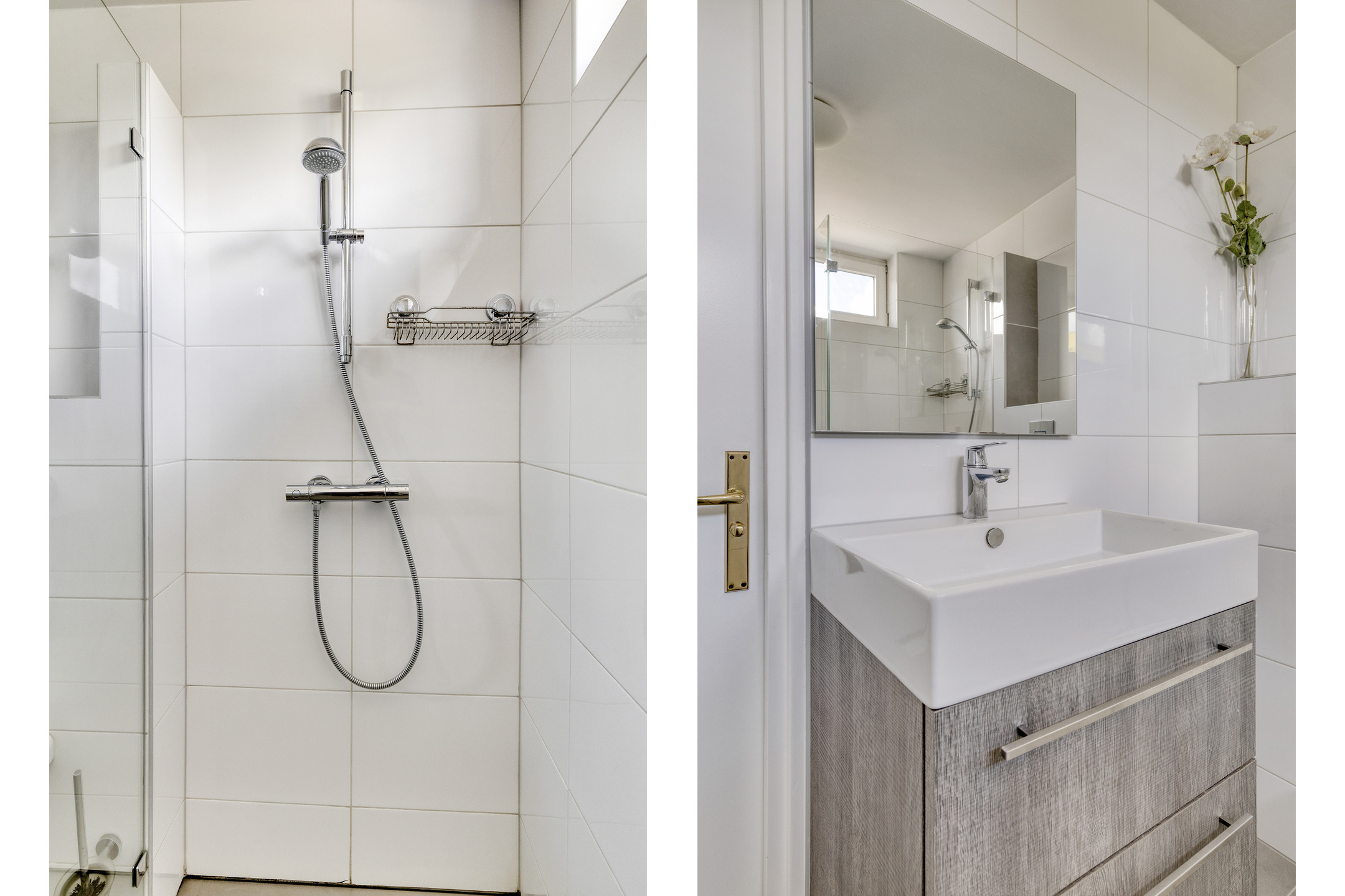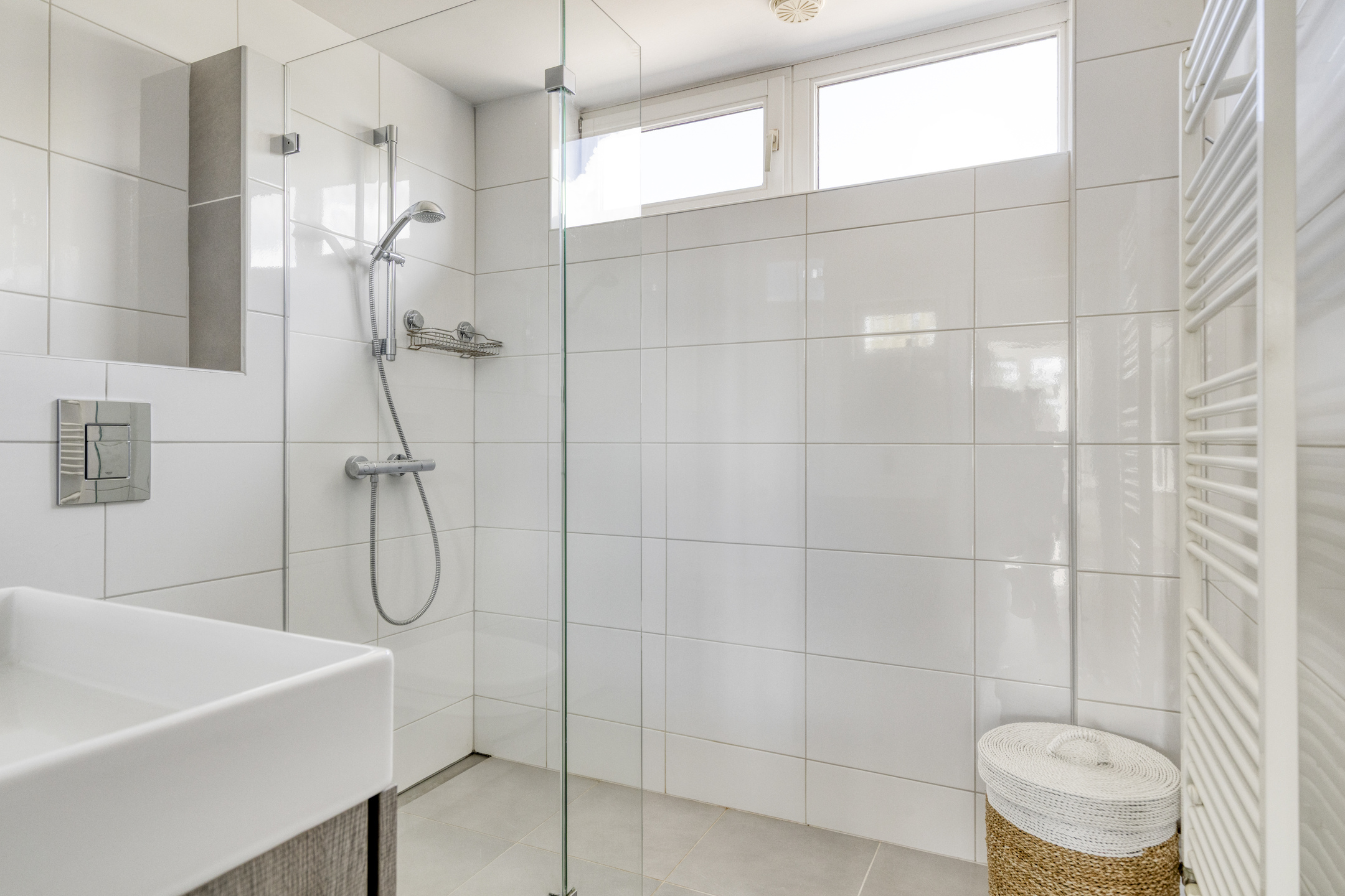 De moderne badkamer (ca. 2019) is gelegen aan de voorzijde van de woning en beschikt over een inloopdouche, wastafelmeubel, 2e toilet en daglicht.
