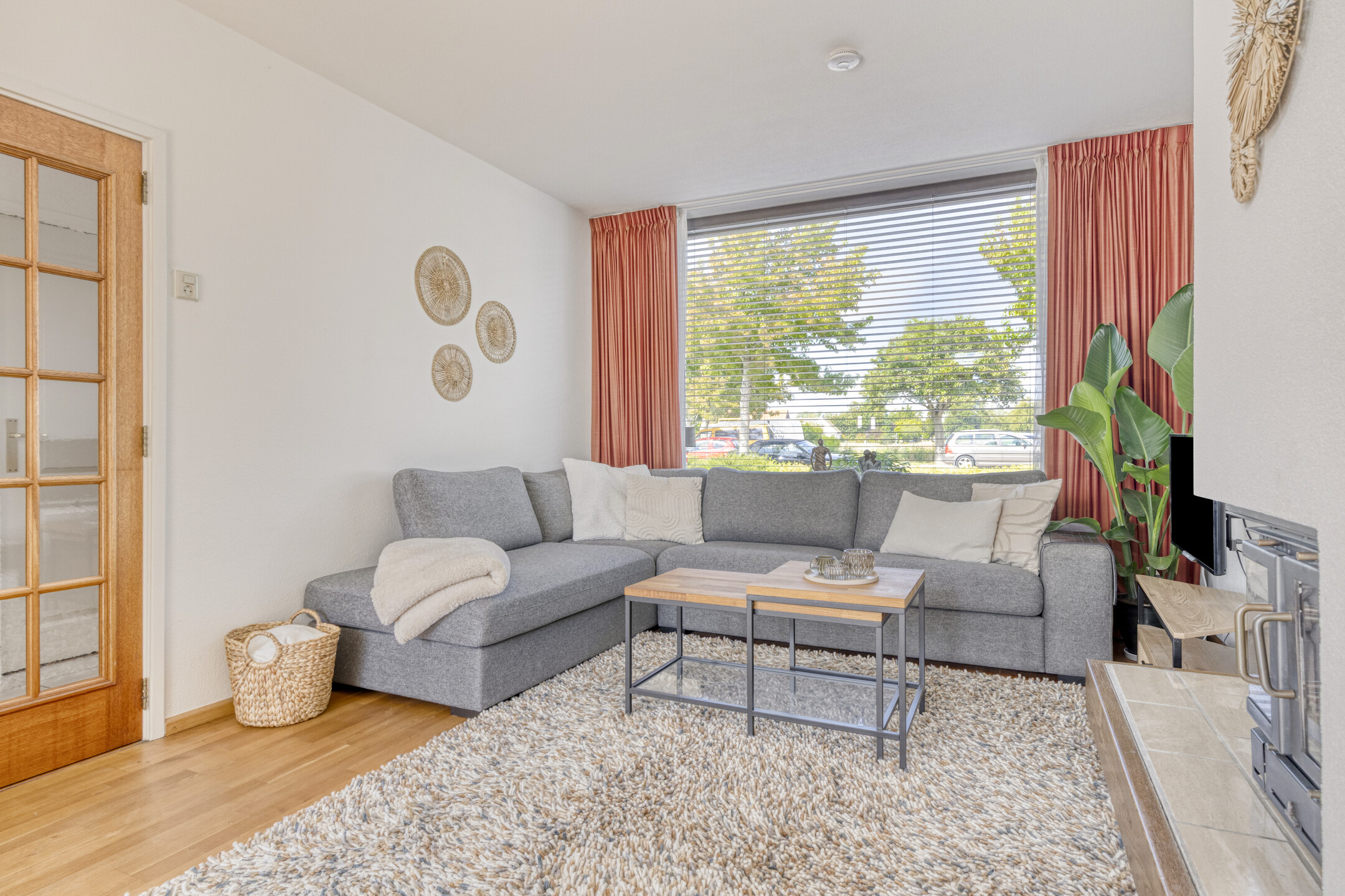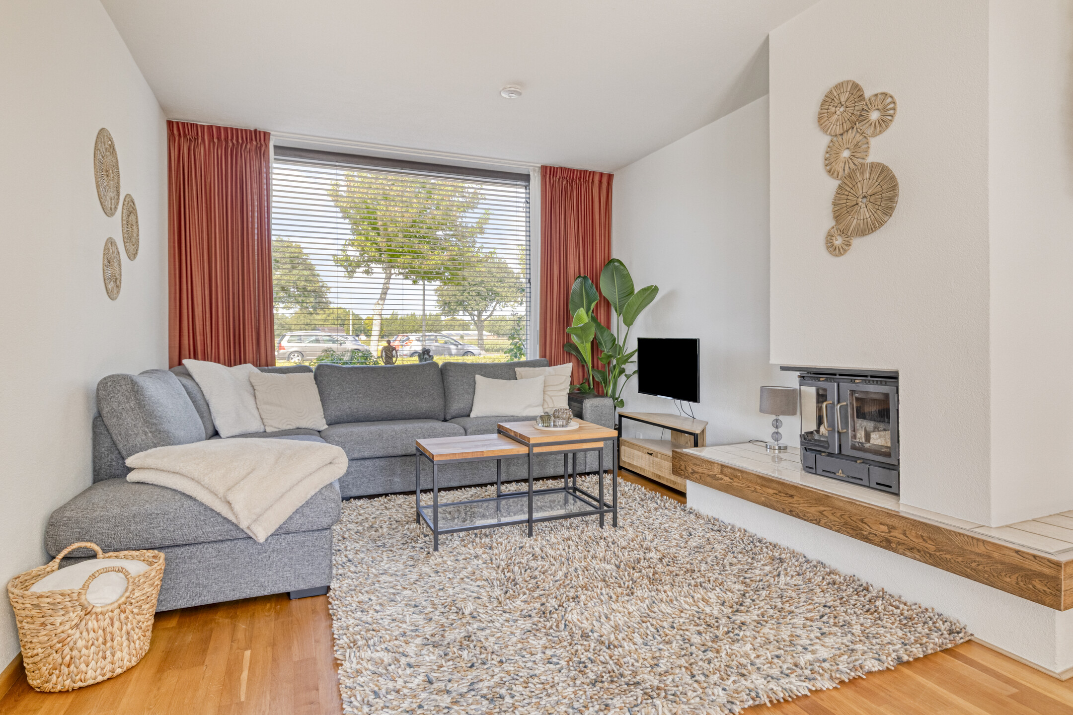 De doorzonwoonkamer is door de grote raampartijen heerlijk licht en heeft openslaande deuren naar de tuin. De vloer is v.v. eiken vloerdelen, spachtelputz wanden en heeft een sfeervolle Barbas houthaard.