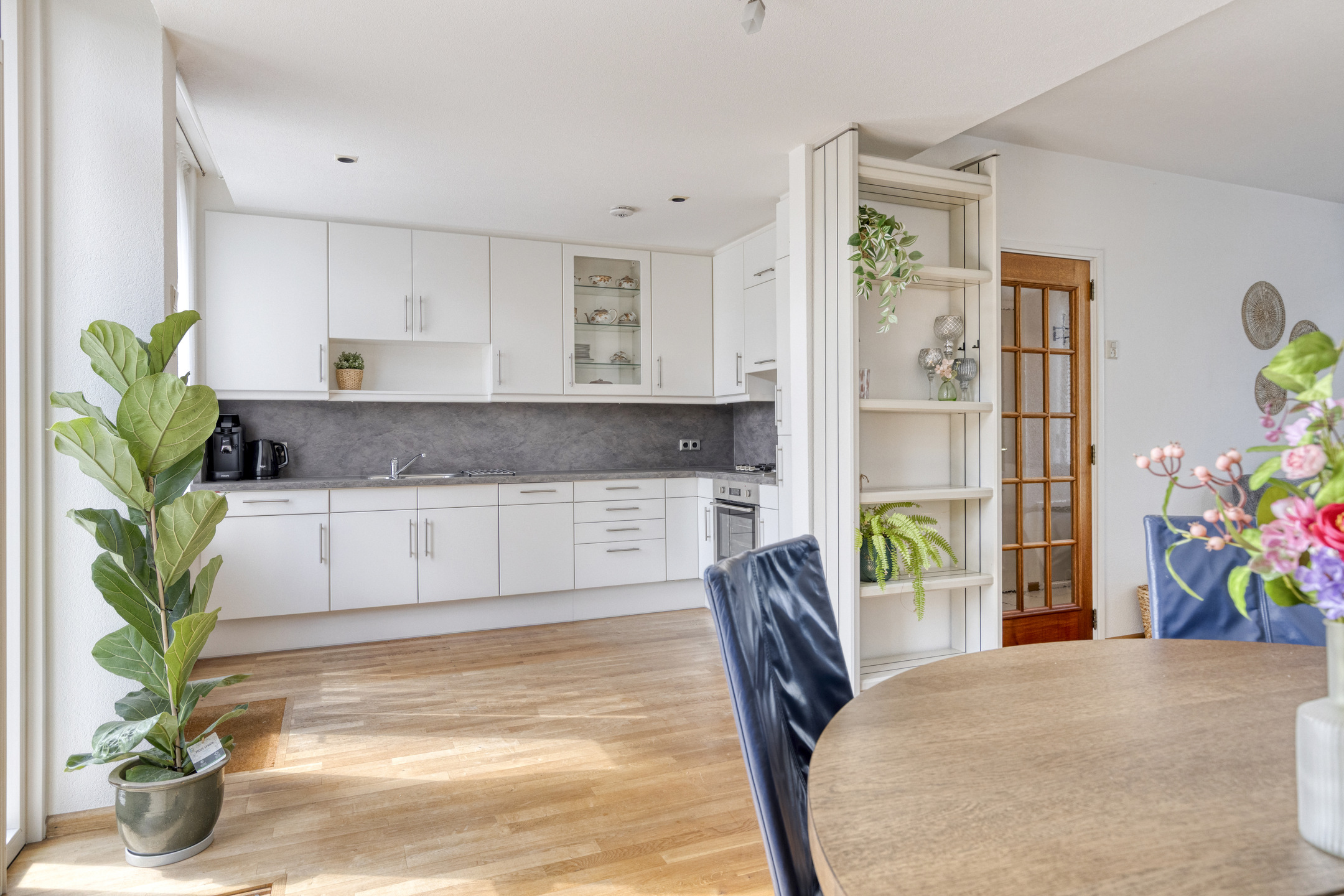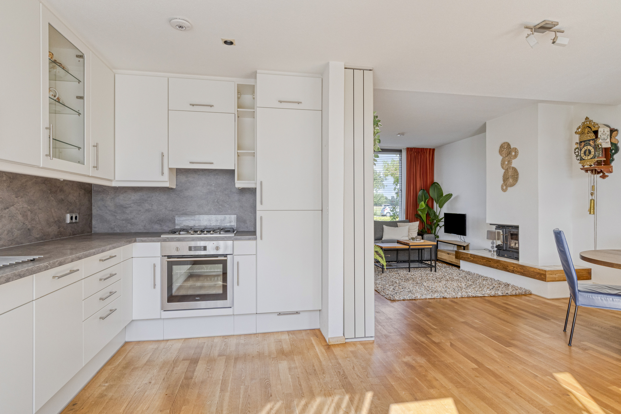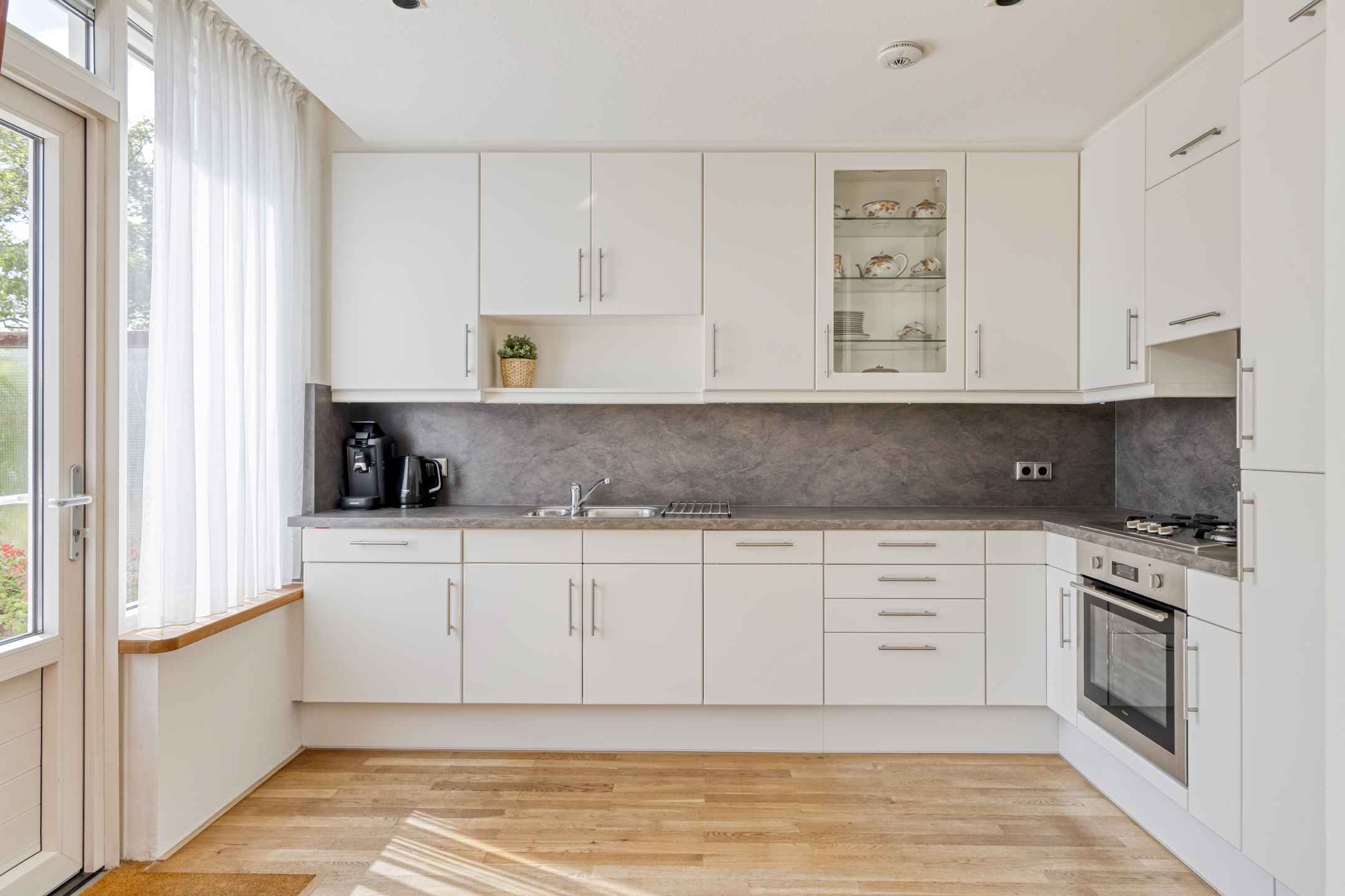 De open keuken in hoekopstelling bevindt zich aan de achterzijde van de woning en is v.v. spoelunit, vaatwasmachine, oven, 4 -pits gaskookplaat, afzuigkap, en koel-vriescombinatie. Via de achterdeur is er toegang tot de tuin.