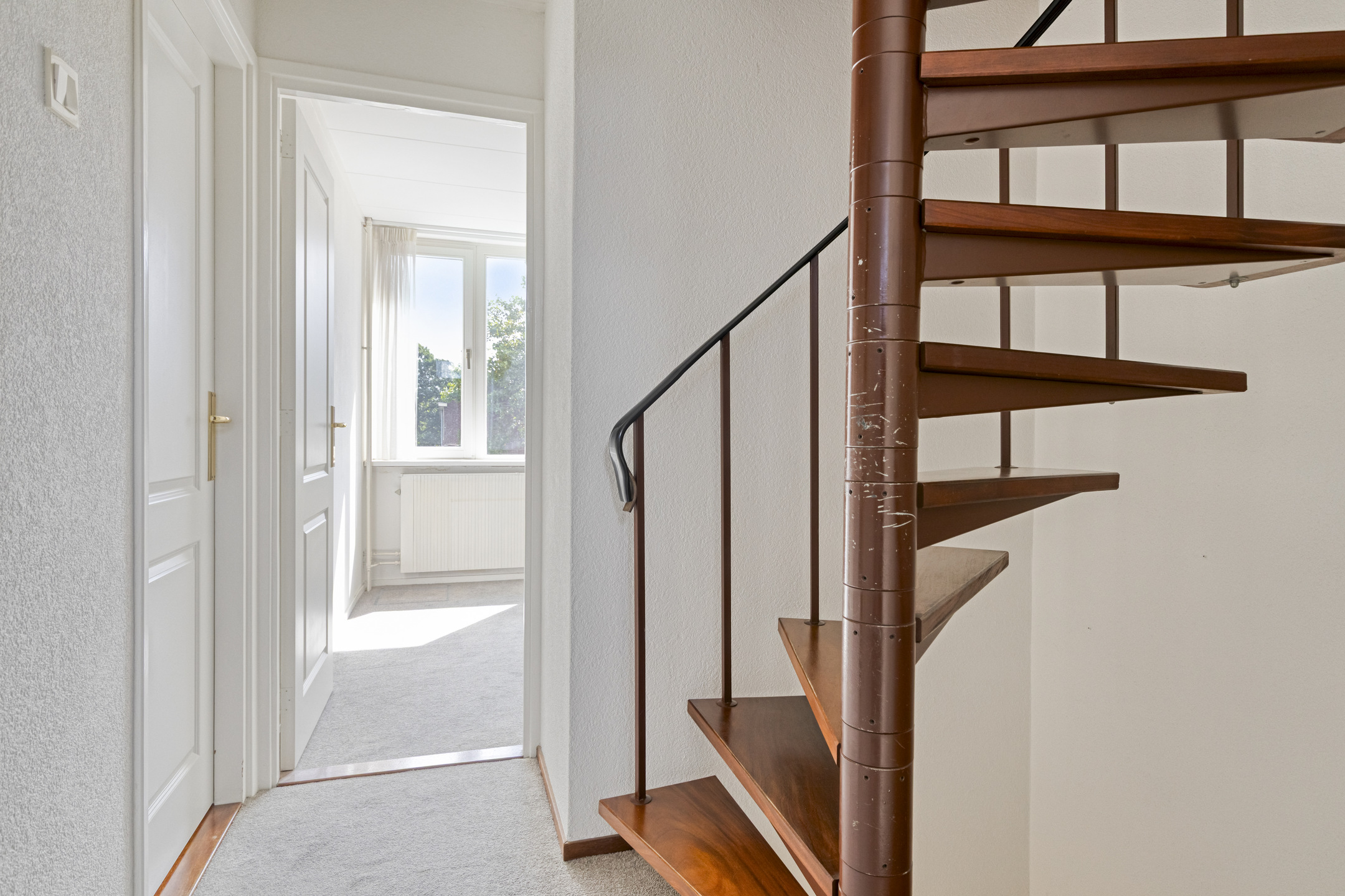 Overloop met vaste trap naar de 2e verdieping. De gehele verdieping is voorzien van tapijt.