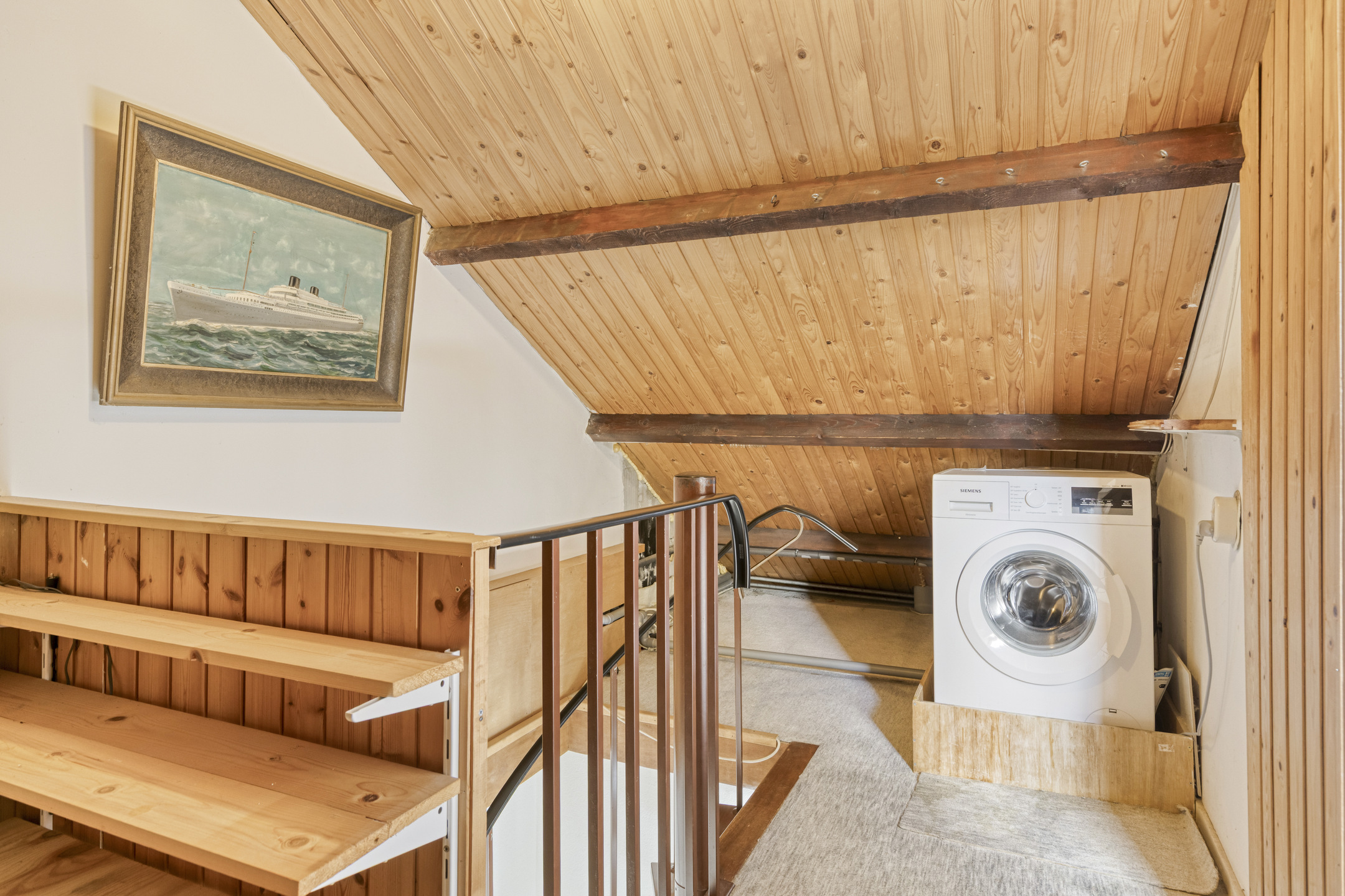 Overloop met opstelplaats van de cv-combiketel, wasmachineaansluiting en opbergruimte achter de knieschotten. De gehele verdieping is v.v. tapijt.