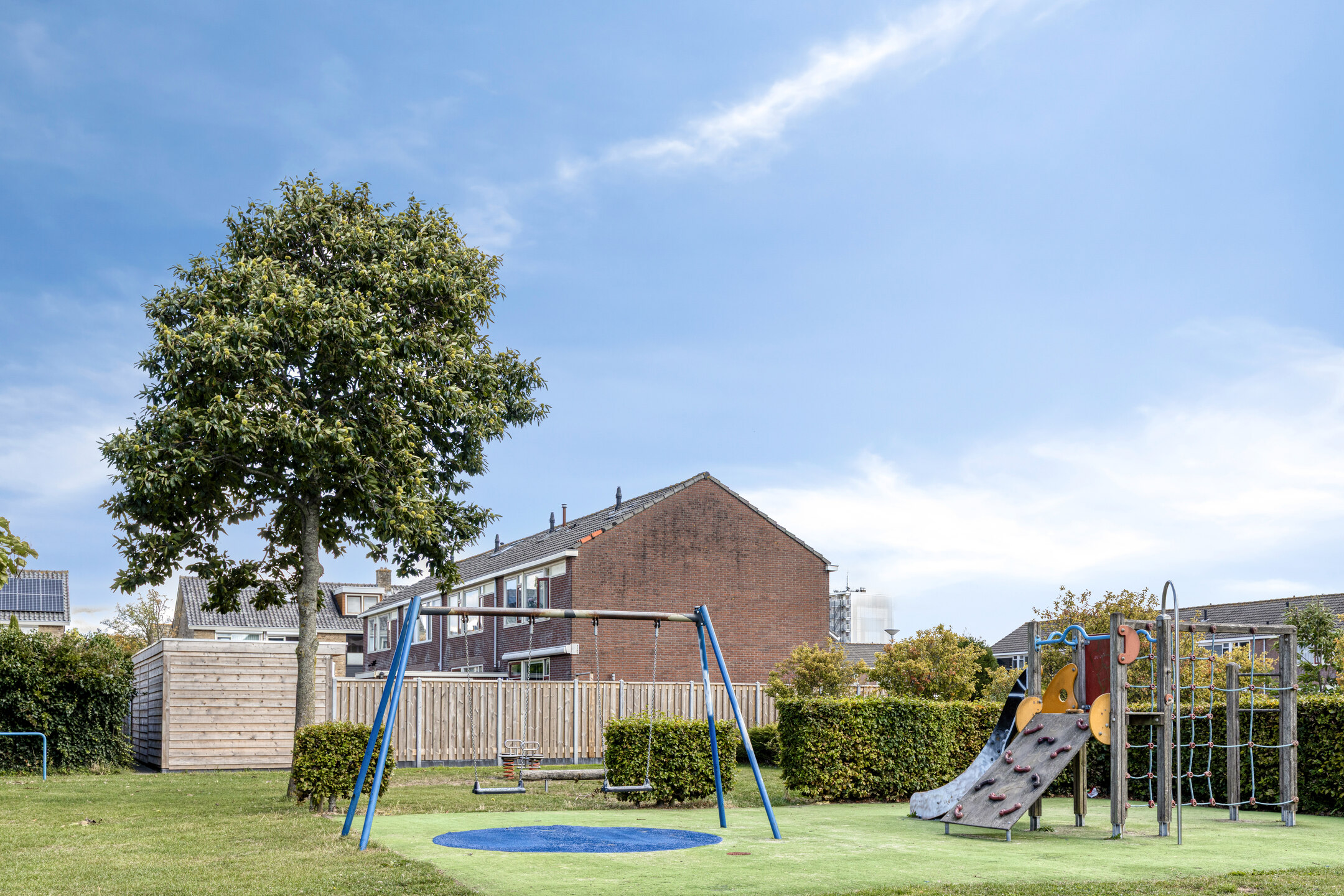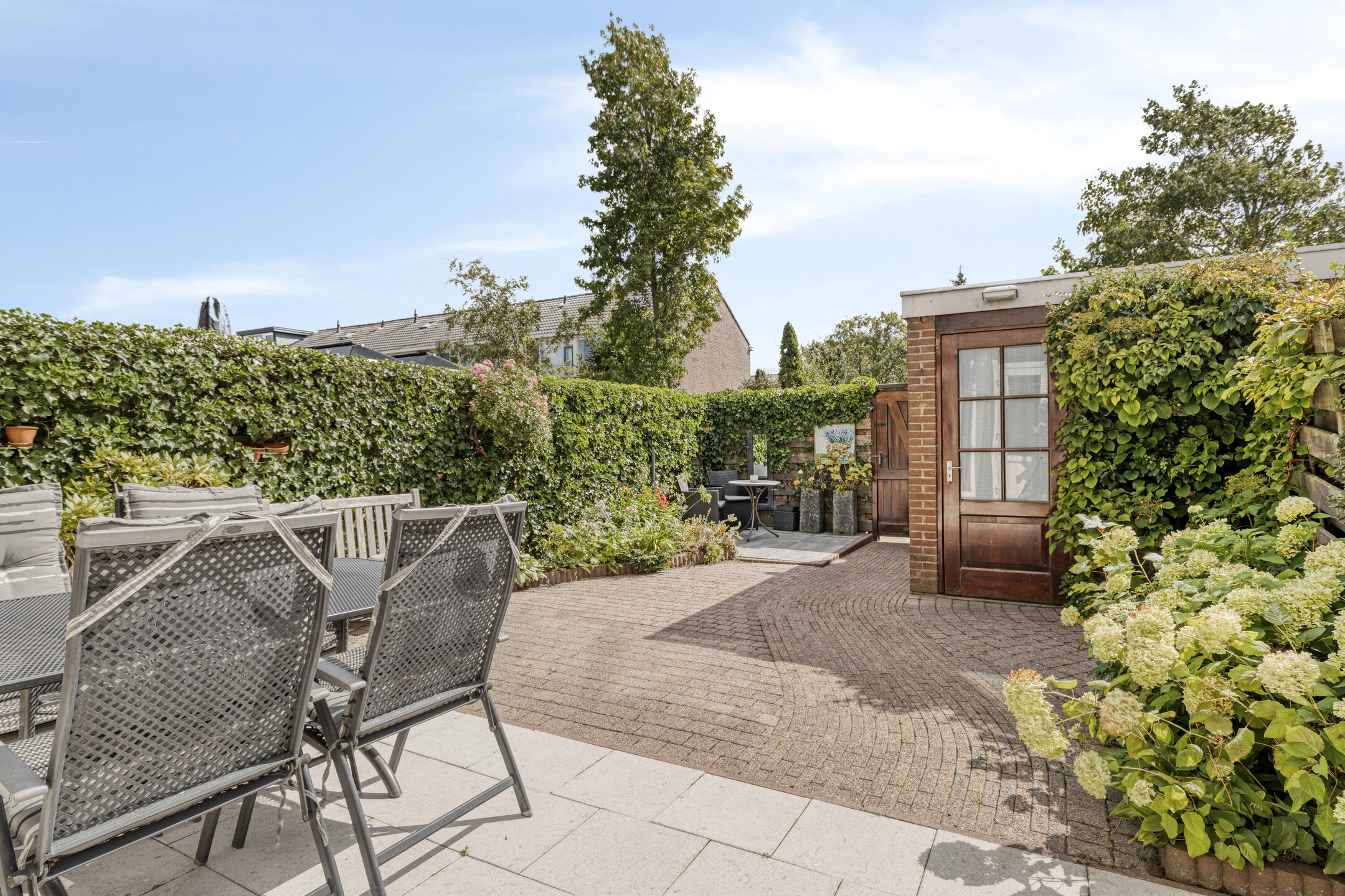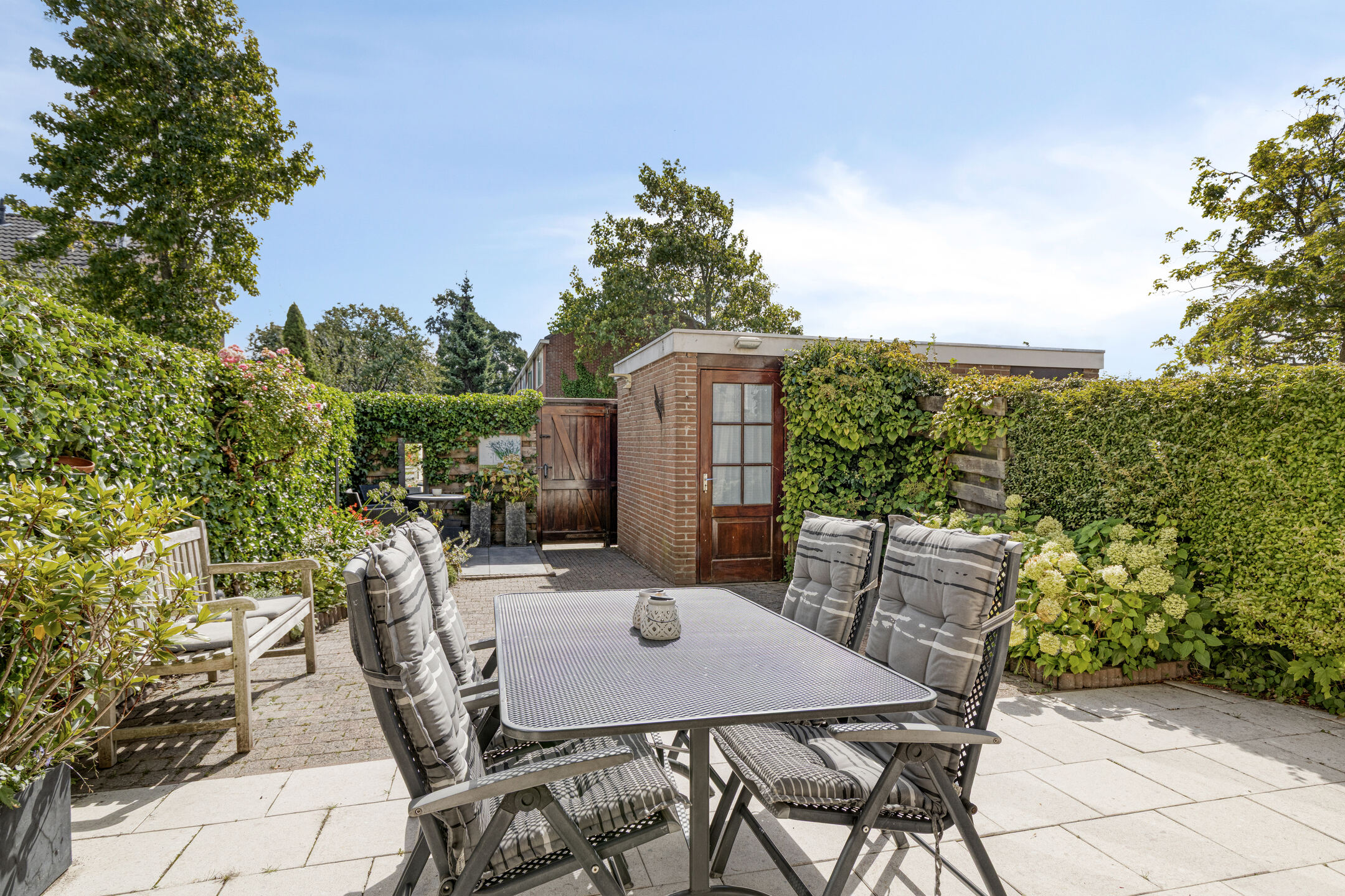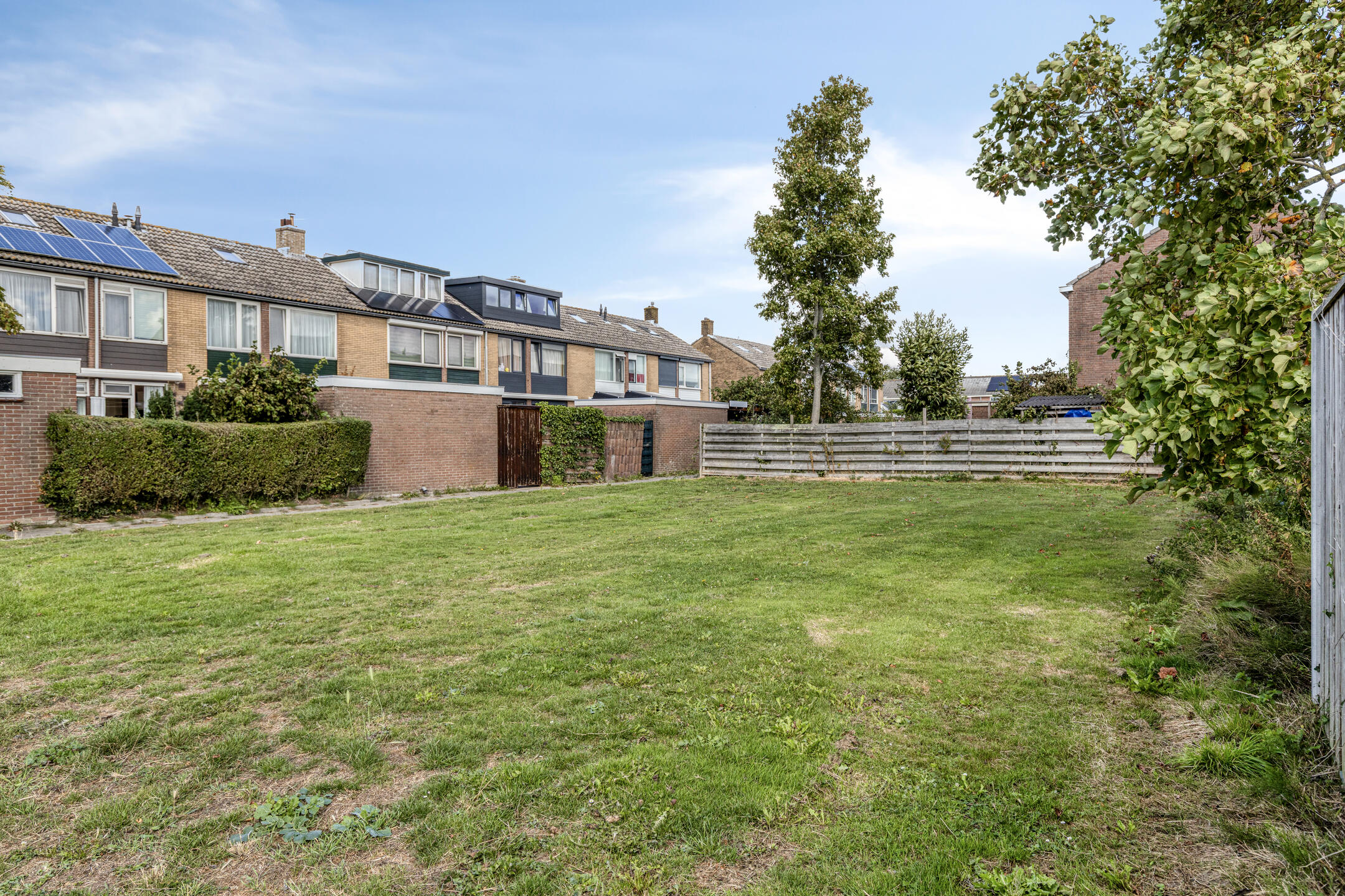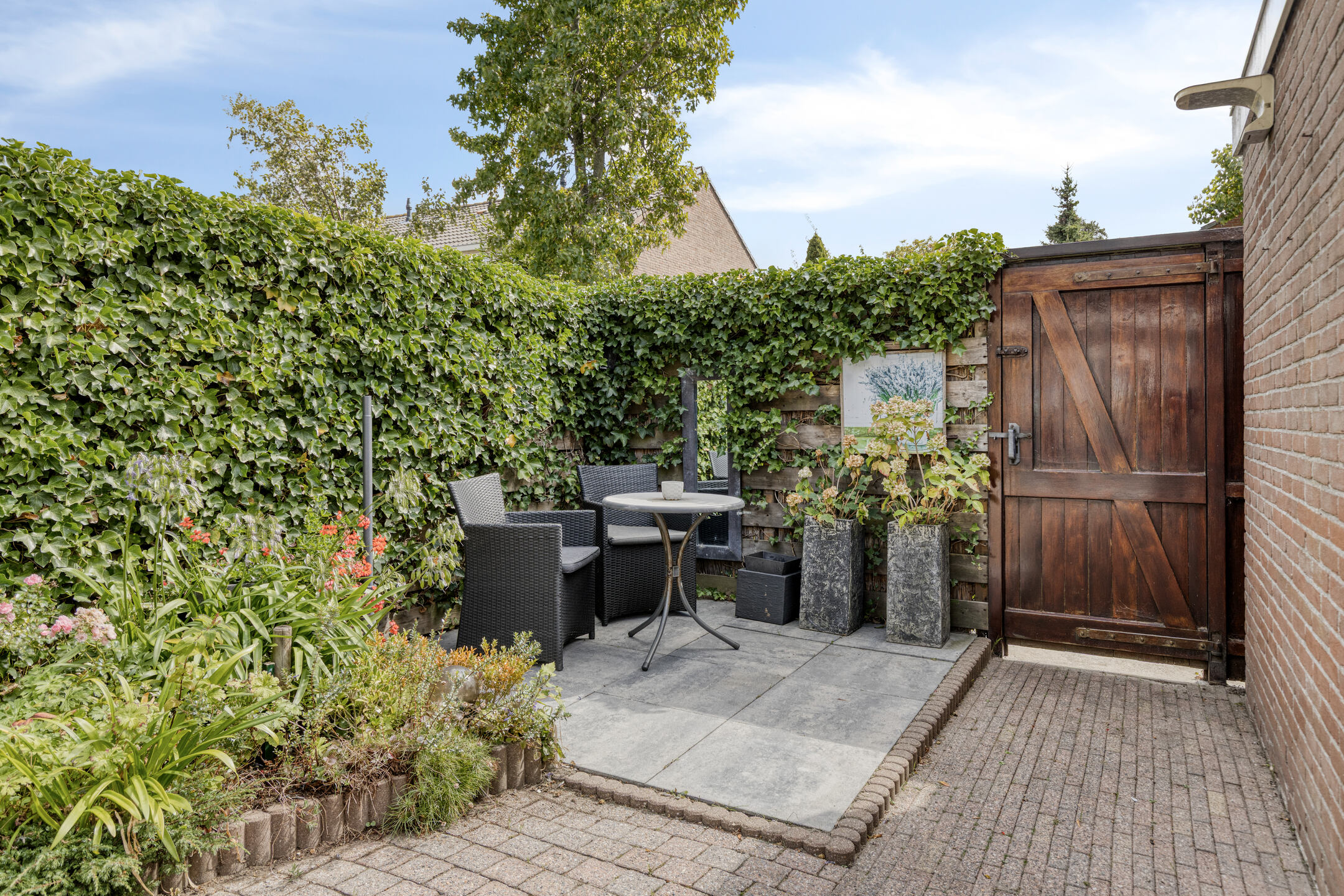 De zonnige achtertuin op het zuid-oosten beschikt over een terras, groene erfafscheiding, zonwering, stenen schuur en achterom. Direct achter de tuin bevindt zich een plantsoen, waardoor de tuin vrij ligt en een gevoel van ruimte geeft.