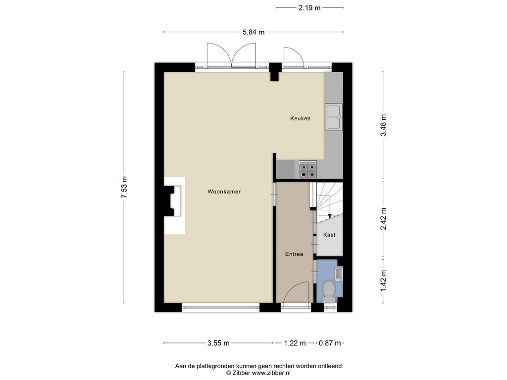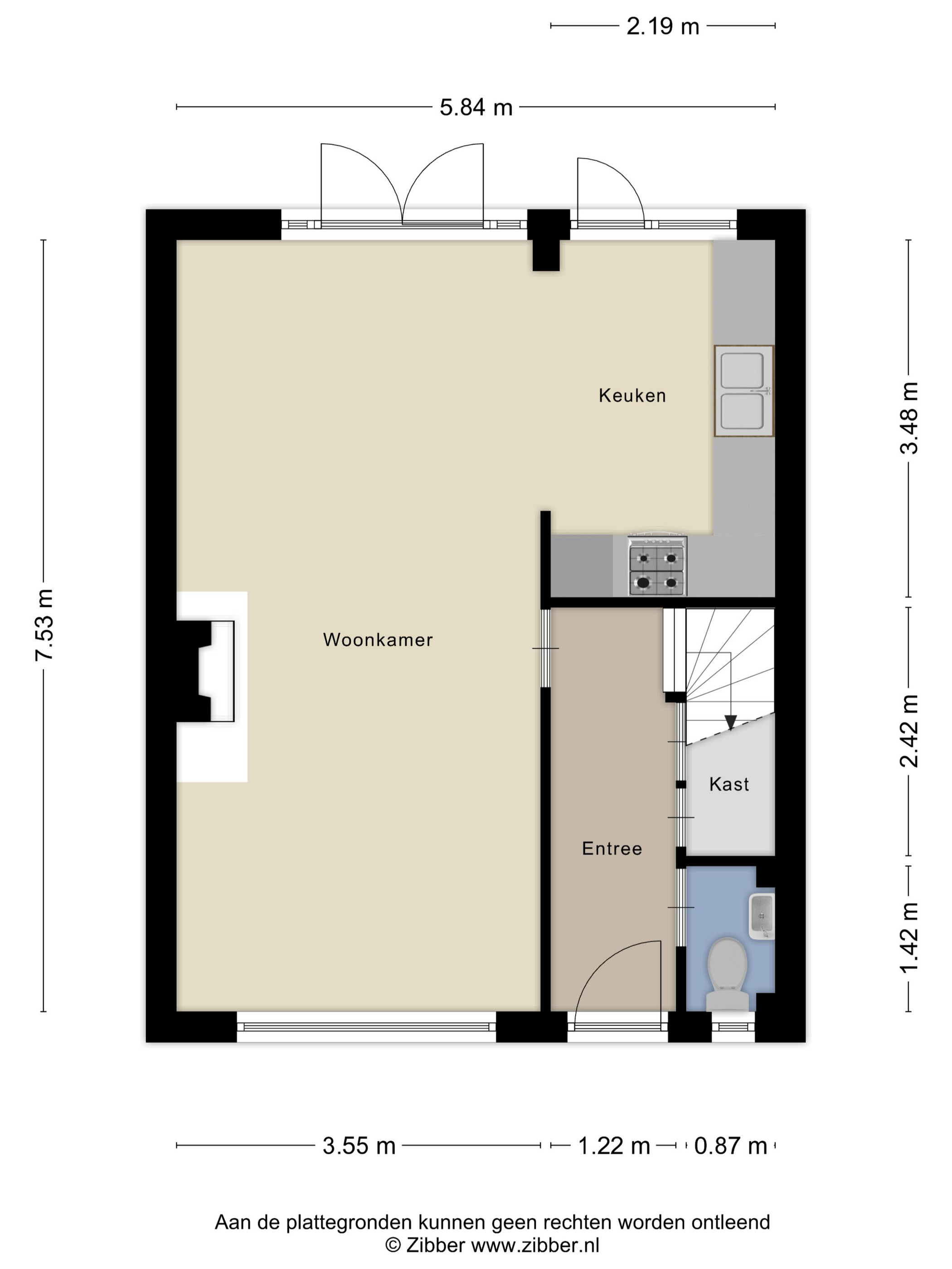 Entree/ hal met garderobe, betegeld toilet met fonteintje, meterkast met 4 groepen, trapkast, trapopgang naar 1e verdieping en toegang tot de woonkamer.