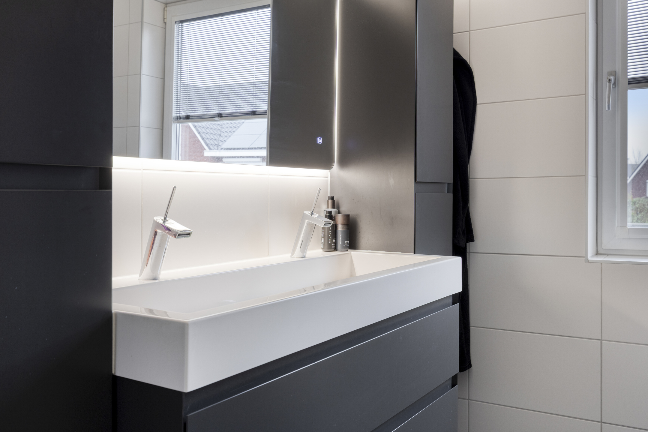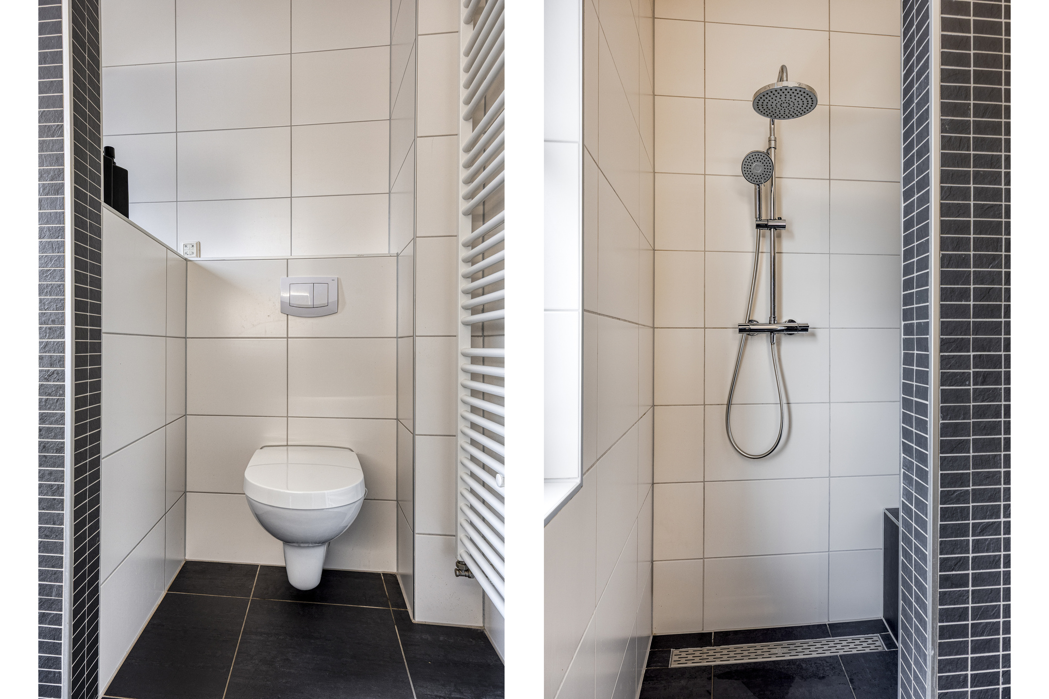 De modern betegelde badkamer is uitgevoerd met een inloopdouche, wastafelmeubel met dubbele wastafel en tweede toilet.