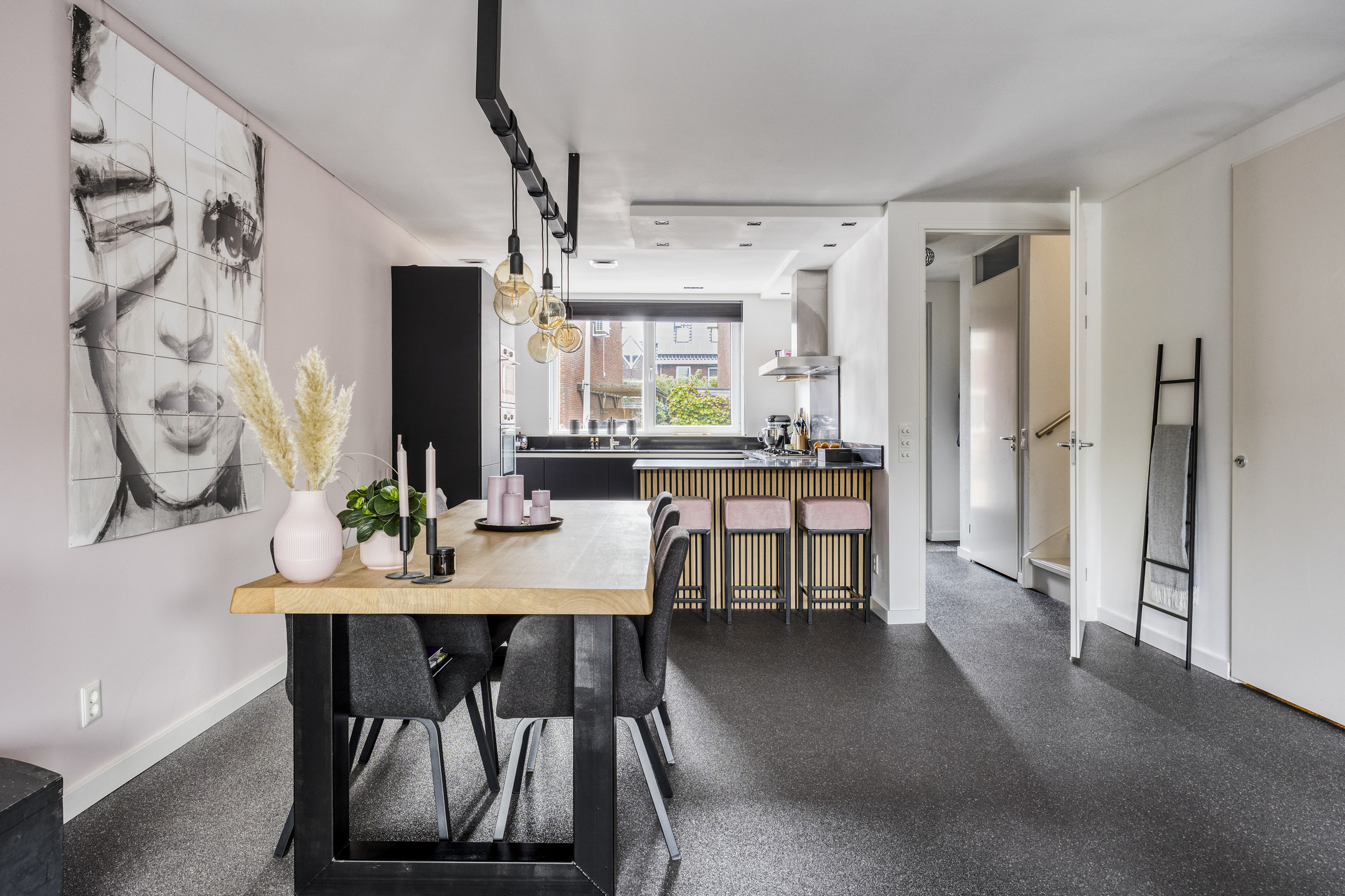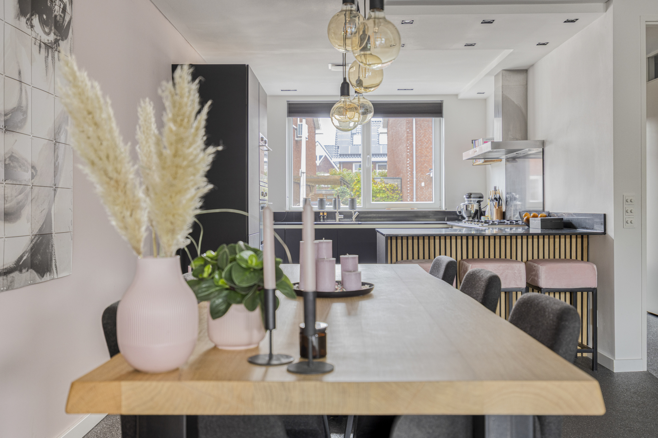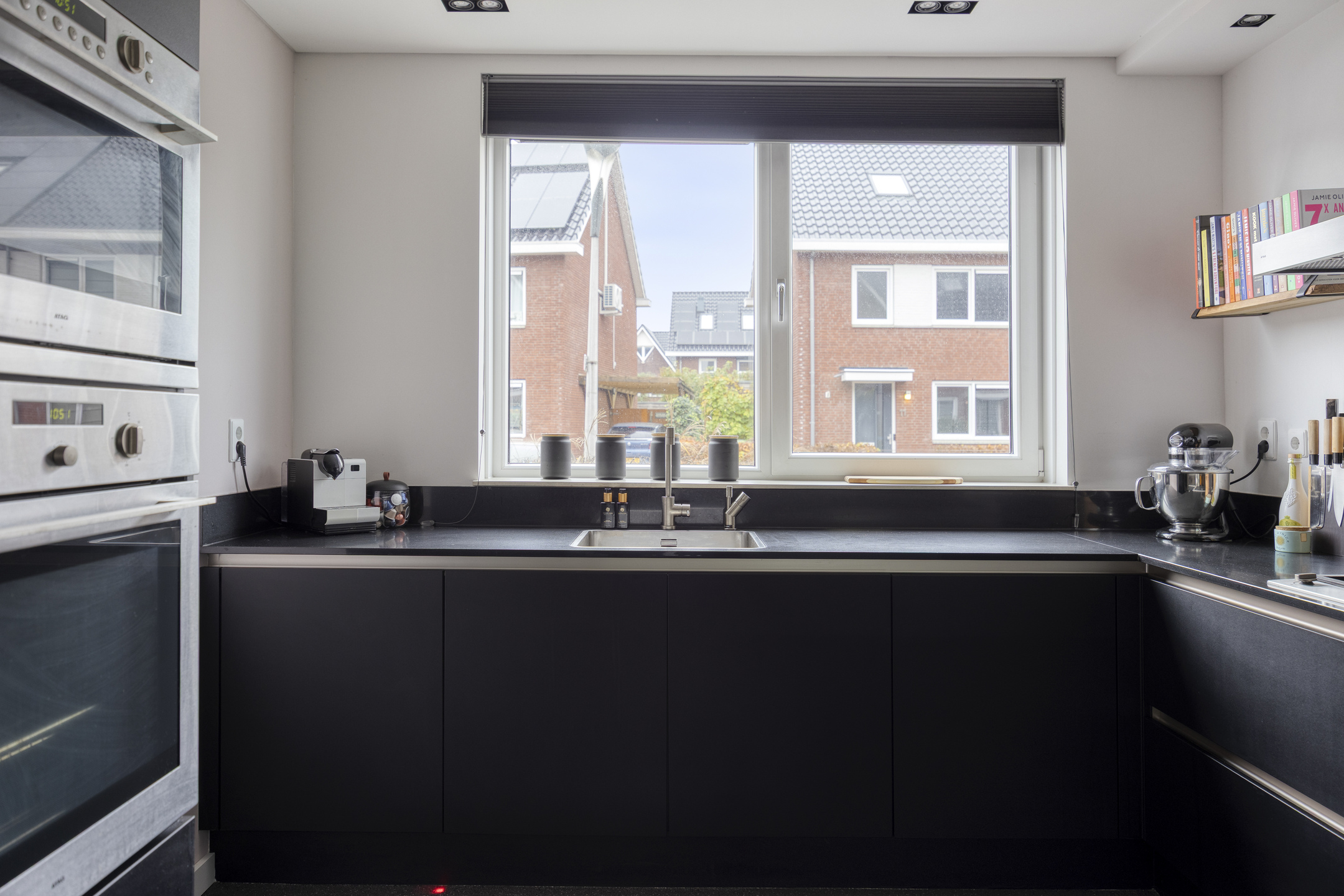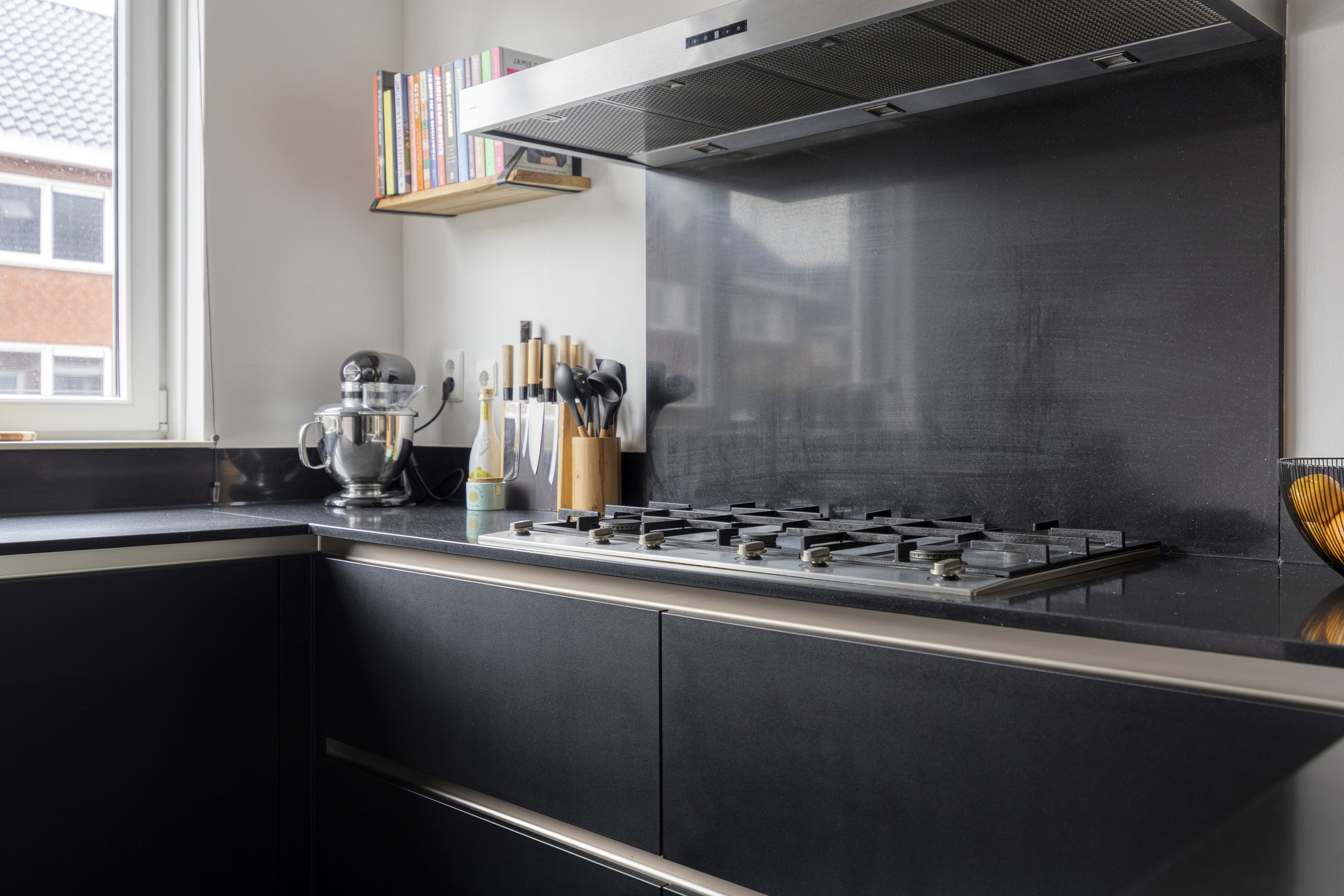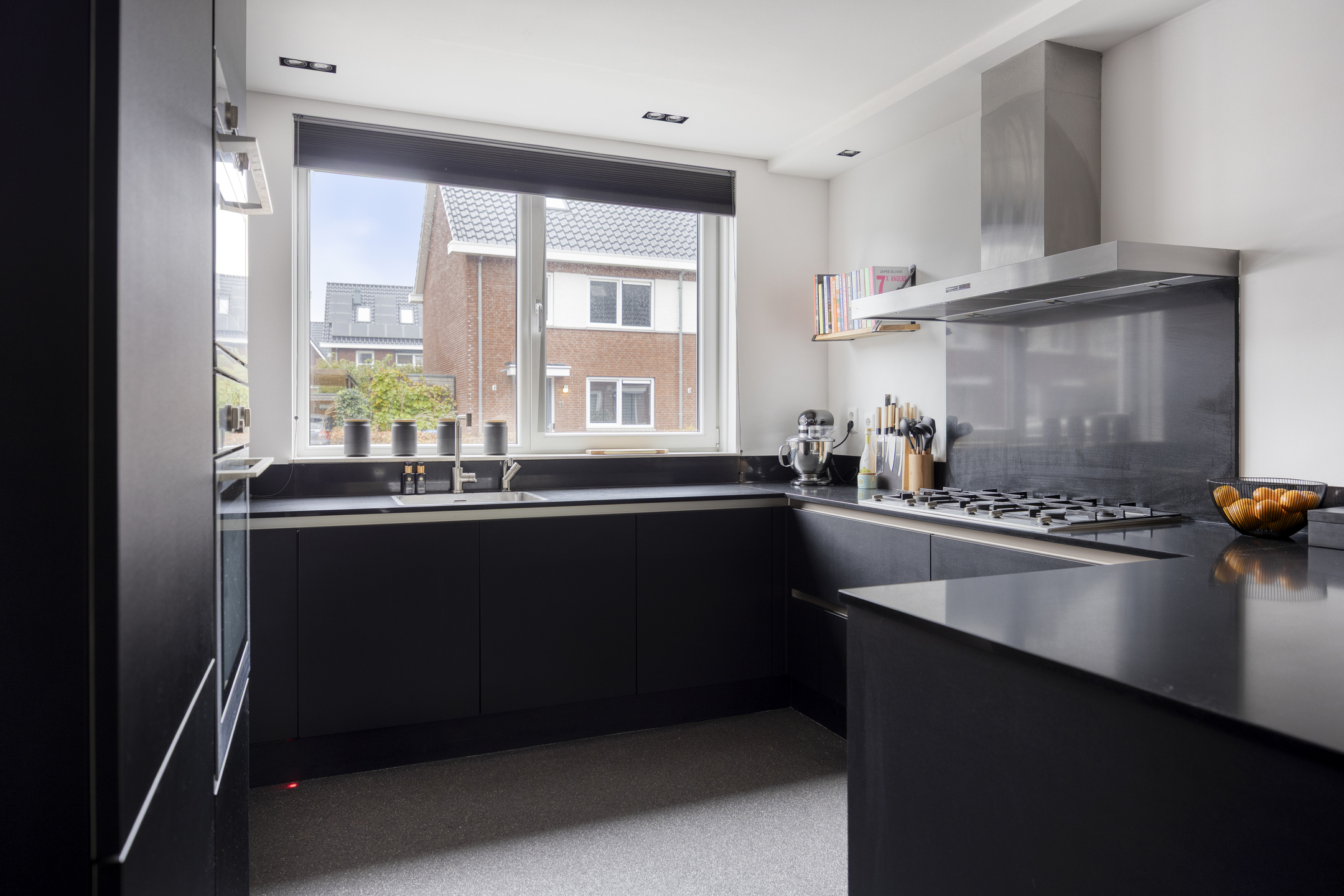 De open keuken bevindt zich aan de voorzijde van de woning en beschikt over een moderne zwarte U-hoekopstelling die is uitgevoerd met een hardstenen werkblad, spoelunit, Quooker, 6 pits gaskookplaat, afzuigkap, oven, combimagnetron, koelkast, vriezer, vaatwasmachine en ontbijtbar.