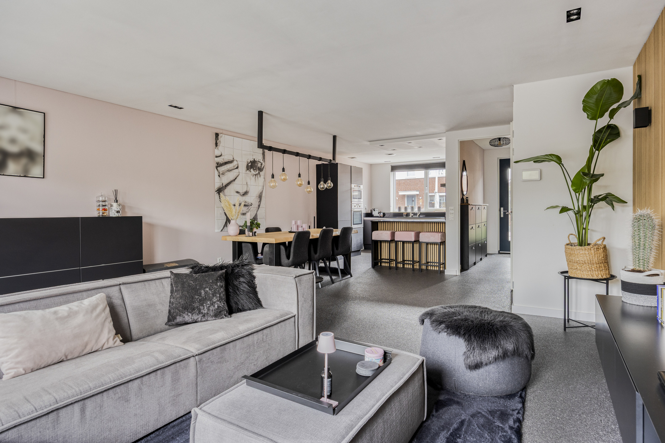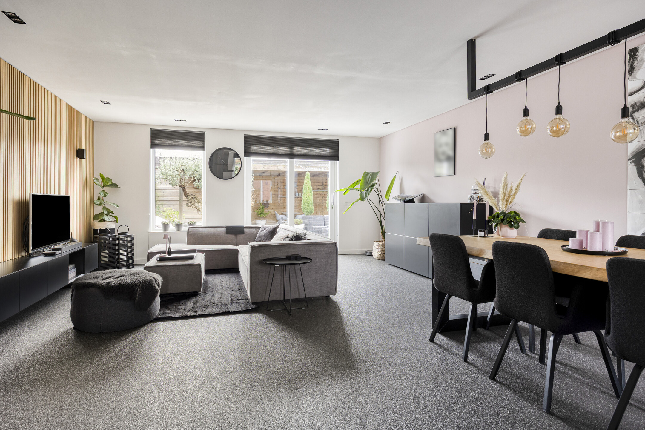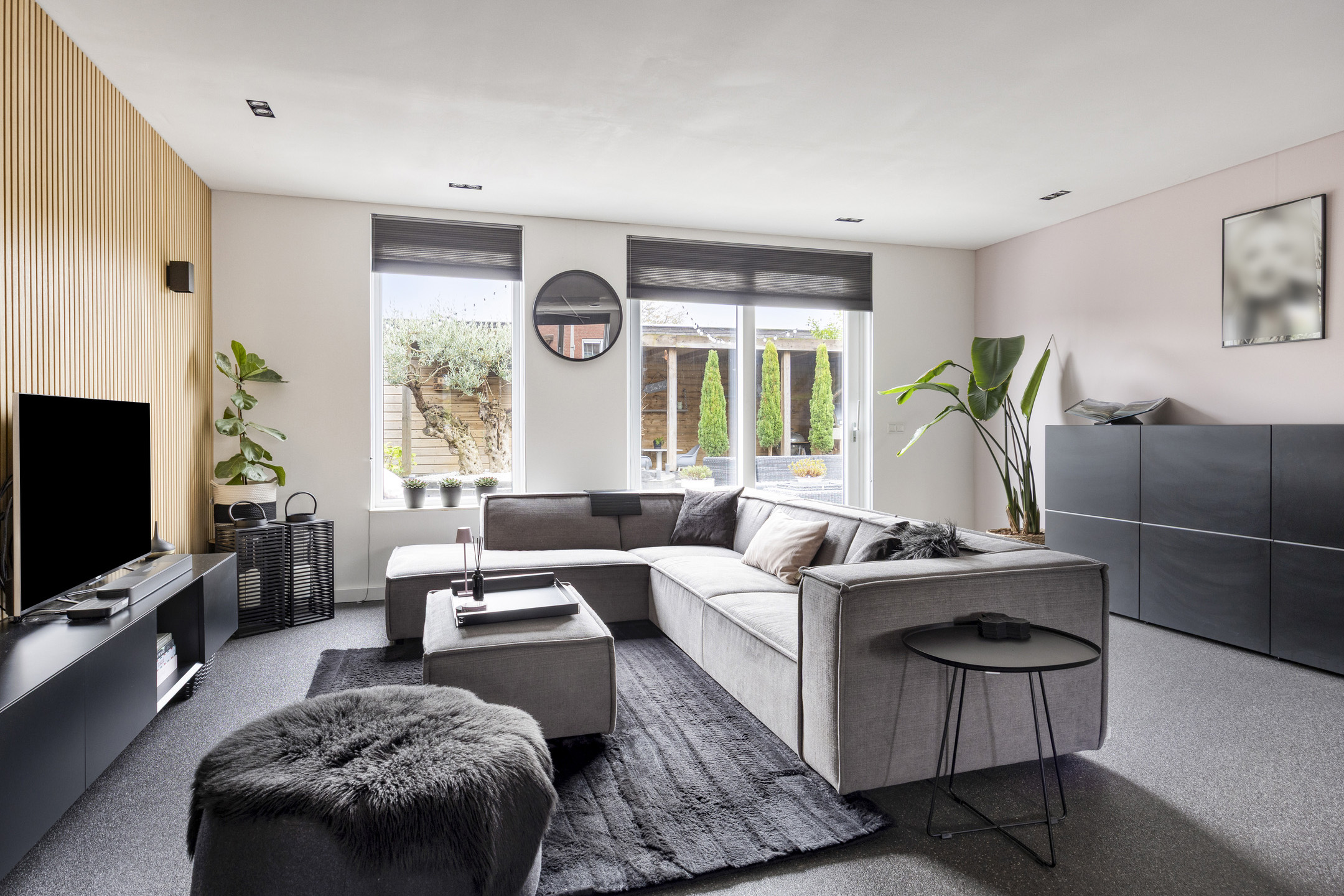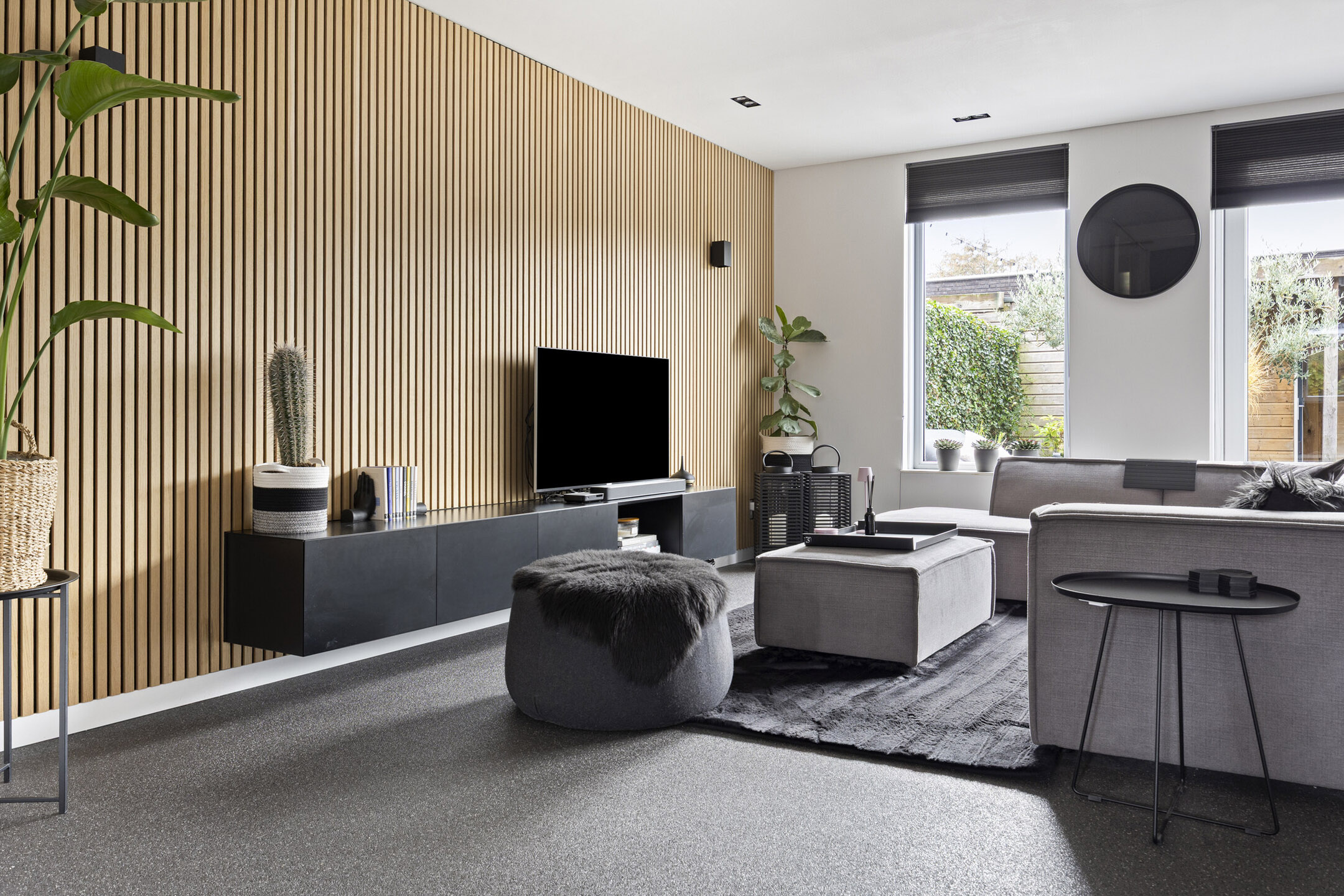 Uitgebouwde tuin gerichte woonkamer met trapkast, glad gestucte wanden en een wand met fraaie akoestische panelen. Het plafond is verlaagd en uitgevoerd met inbouwspots. Via de schuifpui is de achtertuin bereikbaar.