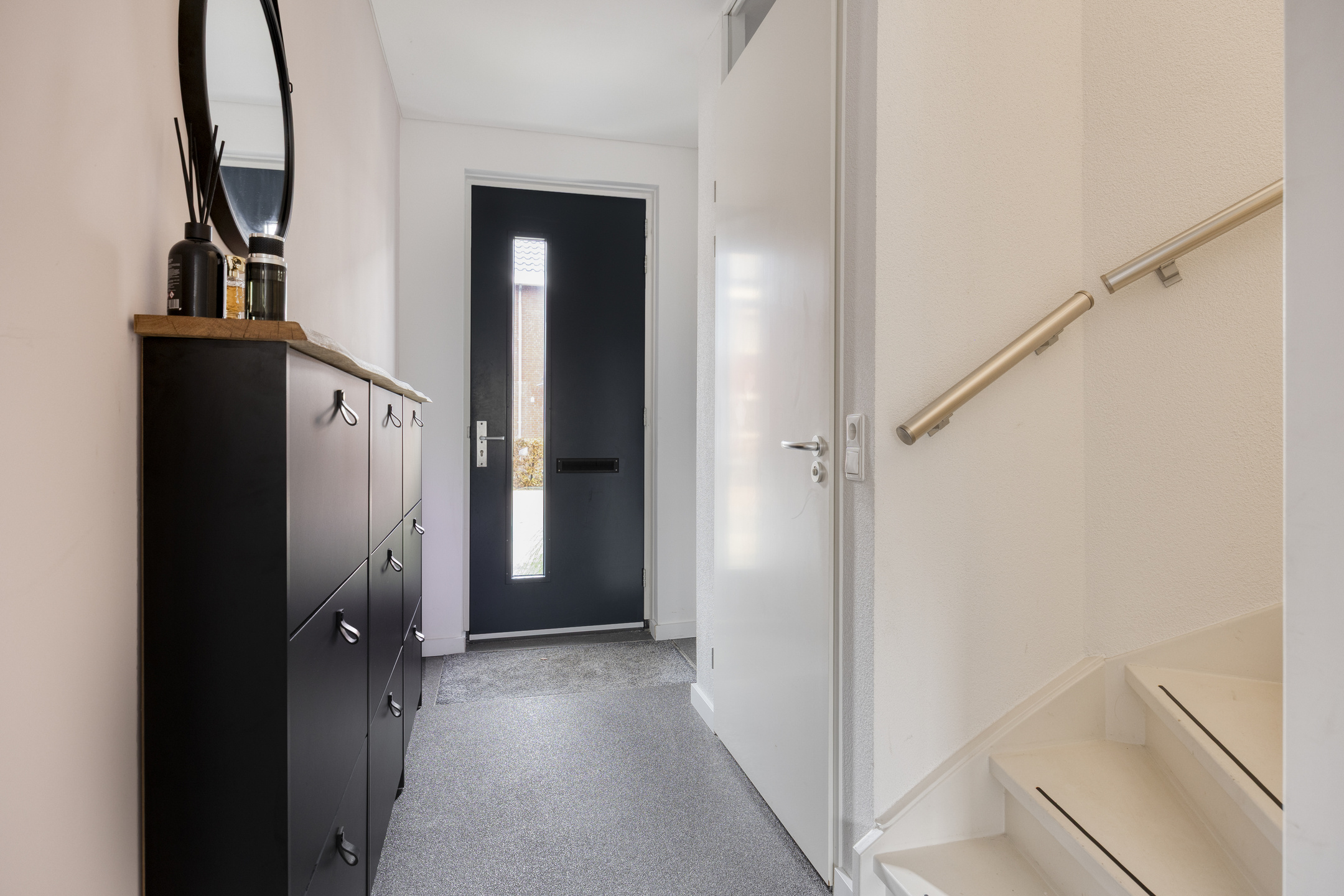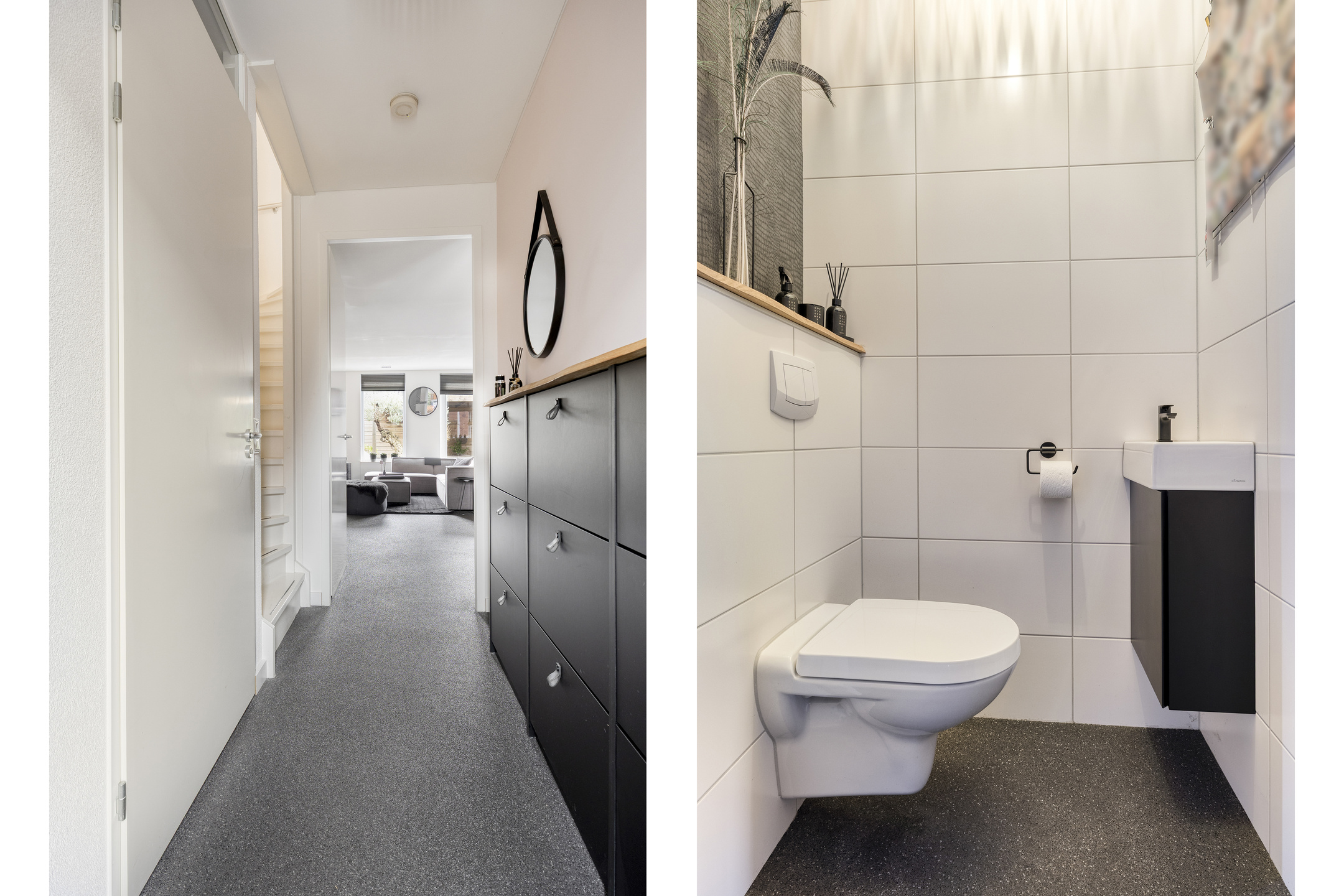 Entree/ hal met garderobe, meterkast met de unit van de waterontharder, trapopgang en betegeld toilet met fonteintje. De vloer is uitgevoerd met een prachtig siergrind met vloerverwarming.