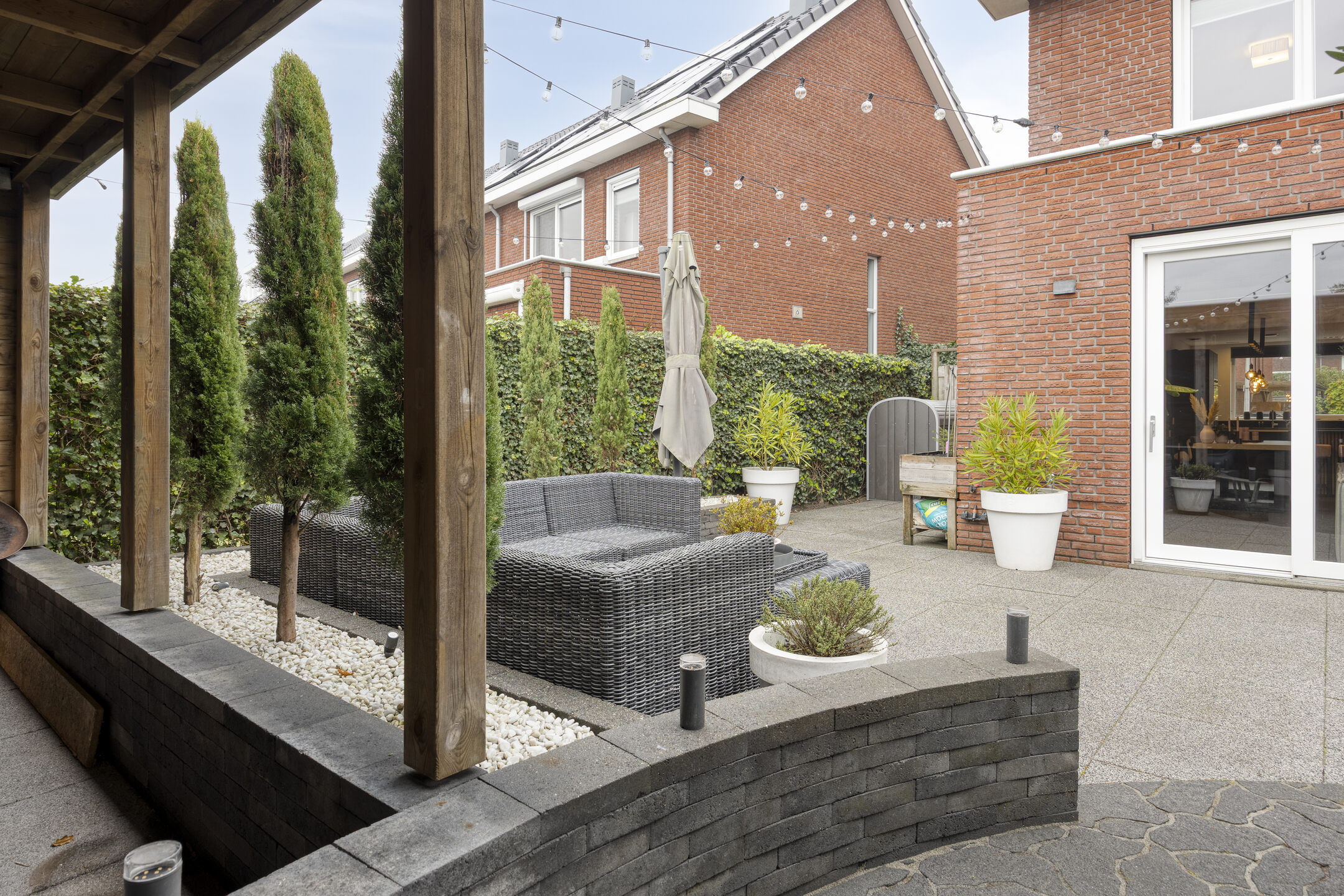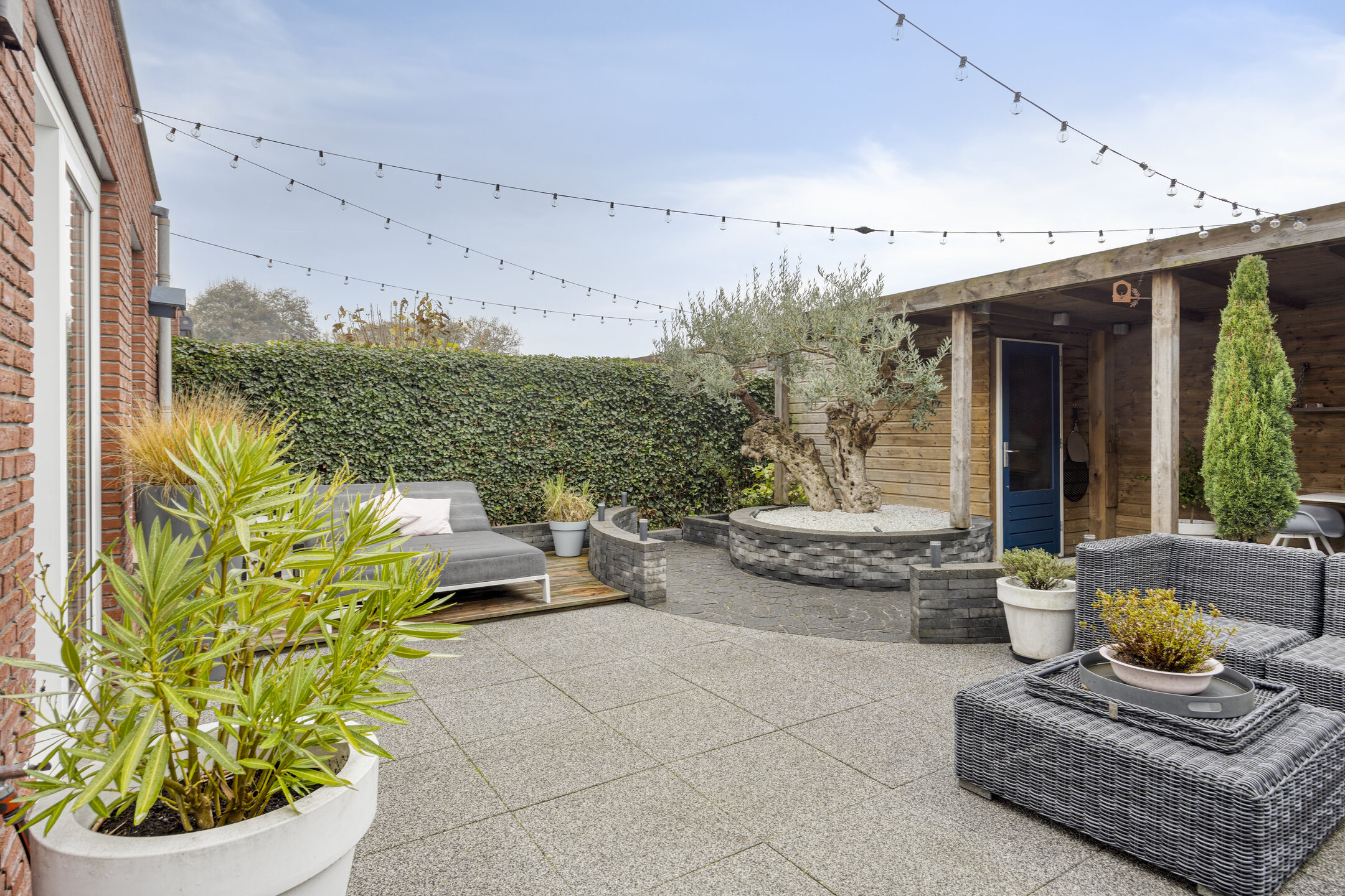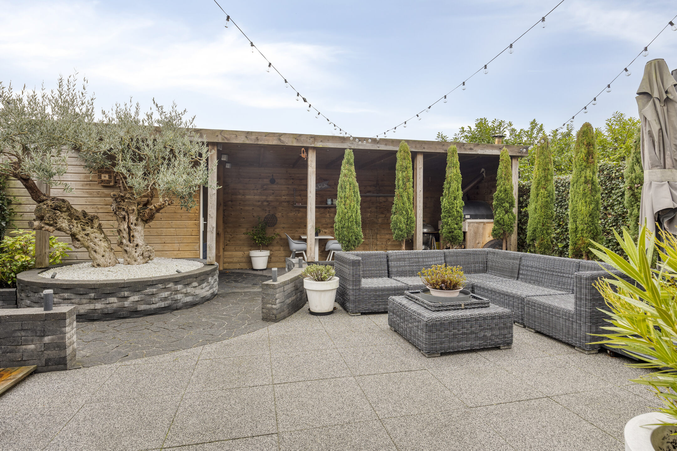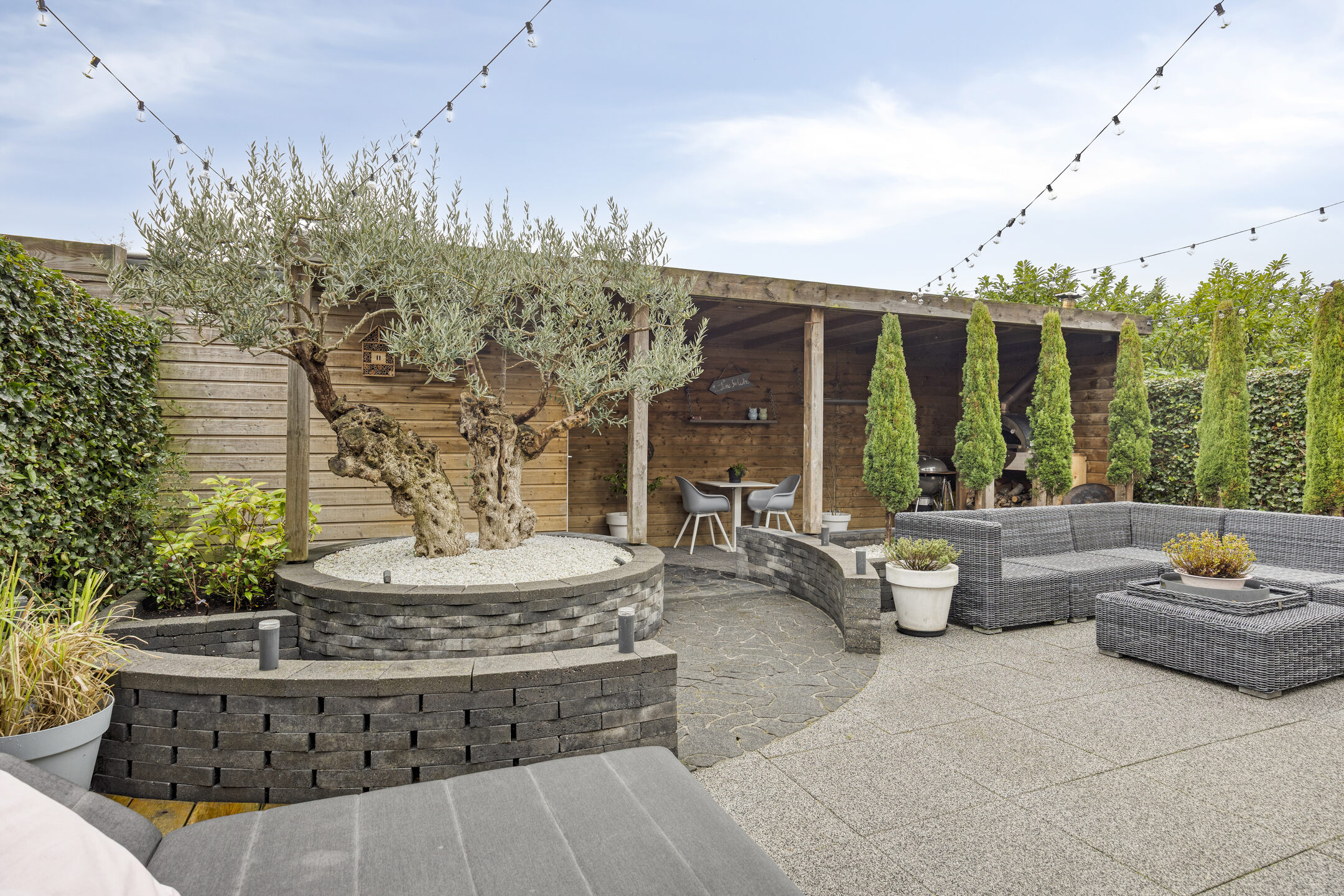 De sfeervolle achtertuin is gelegen op het zuiden en is fraai aangelegd met een terras, border met olijfboom en sfeervolle terrasoverkapping. Verder bevindt zich hier de fietsenberging. De tuin heeft een achterom via de zijtuin van de woning.
