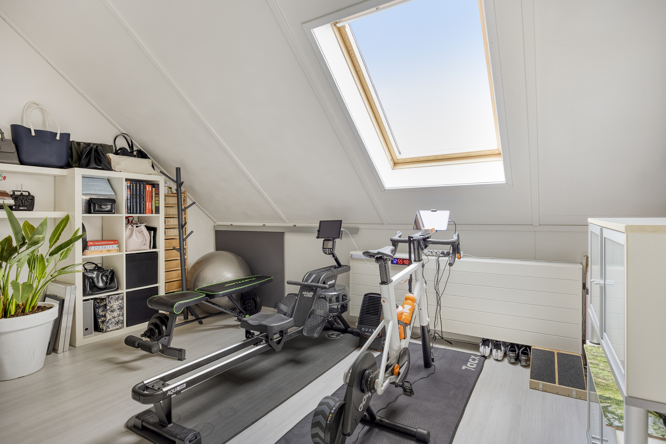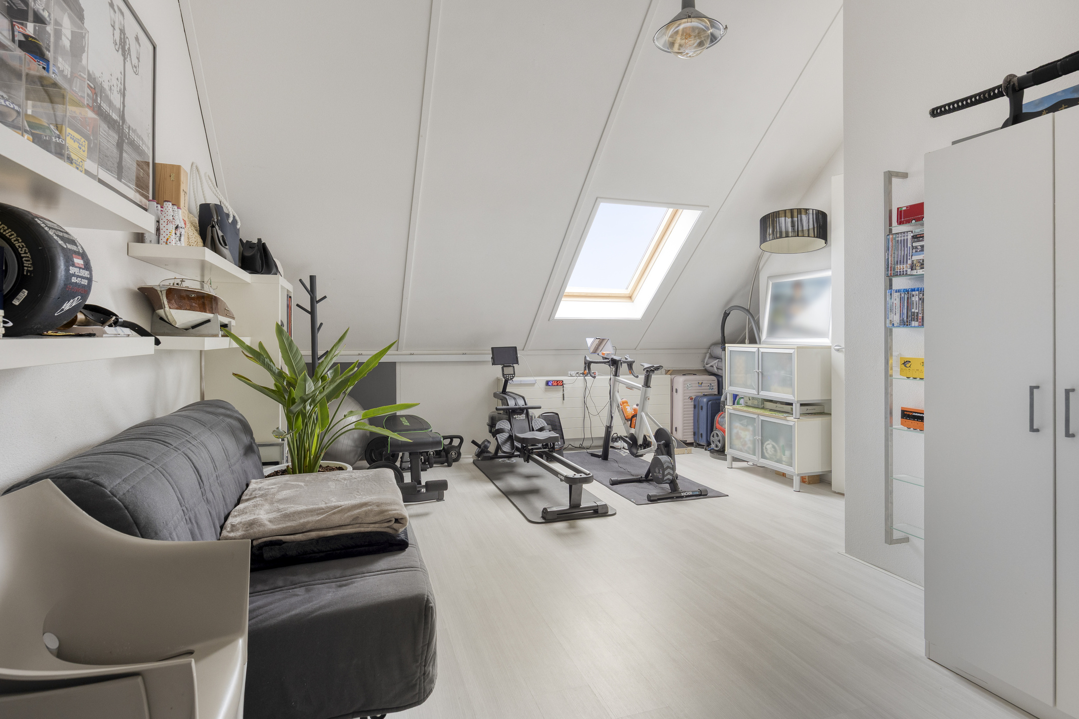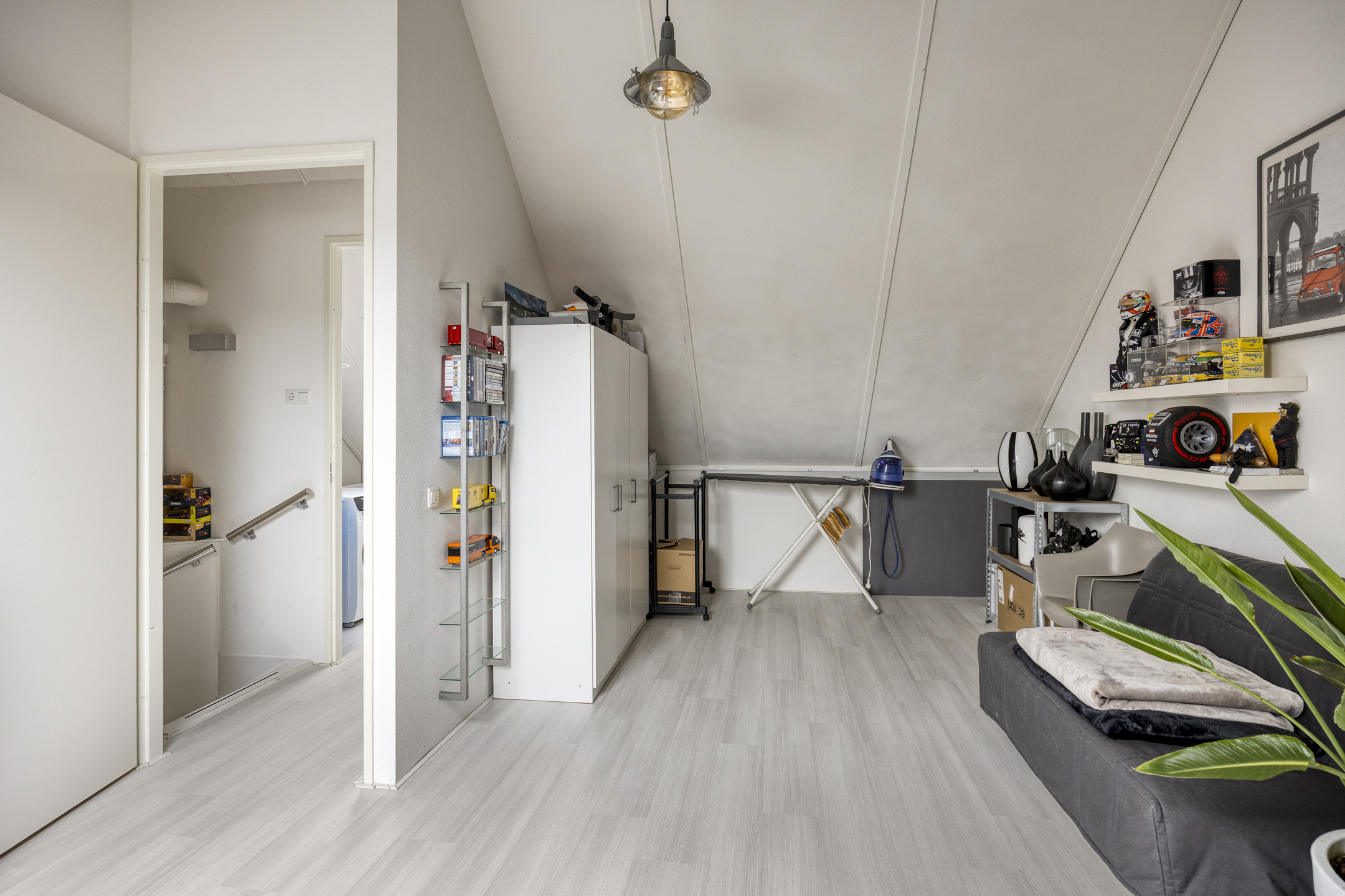 Deze royale kamer is voorzien van groot kantelraam. De vloer is v.v. laminaat. Achter de knieschotten is voldoende bergruimte.