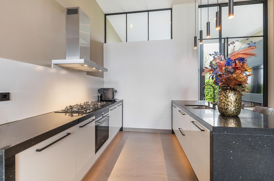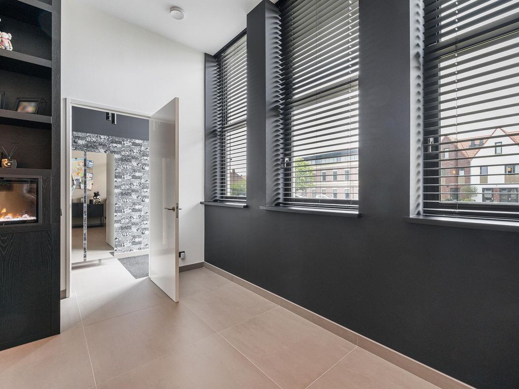 Via de statige, hoge voordeur stap je de hal binnen, waar direct de sfeer van het pand voelbaar is. Hier vind je de meterkast en het moderne toilet met fonteintje. We stappen binnen in de leefkeuken, waar drie grote ramen uitkijken over het plein en zorgen voor een fijne lichtinval. De keuken is stijlvol en uitgevoerd met een composiet aanrechtblad, 5-pits gaskookplaat, afzuigschouw, oven, kokend waterkraan, dubbele tafelmodel koelkasten en een vaatwasser. Een mooi detail is dat de vensterbanken in het raamkozijn zijn uitgevoerd in hetzelfde hout als de maatwerkkast in de ruimte, wat zorgt voor één geheel. Deze maatwerkkast heeft een mooie elektrische haard. Via een zwarte stalen deur lopen we door naar de living met airconditioning, waar de hoge plafonds, grote ramen en strakke afwerking direct opvallen. De op maat gemaakte cinewall met een 2e elektrische haard vormt hier het stijlvolle middelpunt van de ruimte. De achterdeur geeft toegang tot de achtertuin, waar binnen en buiten naadloos in elkaar overlopen dankzij dezelfde tegelvloer als in de woonkamer. De vloerverwarming en de gladde wanden maken het plaatje compleet.