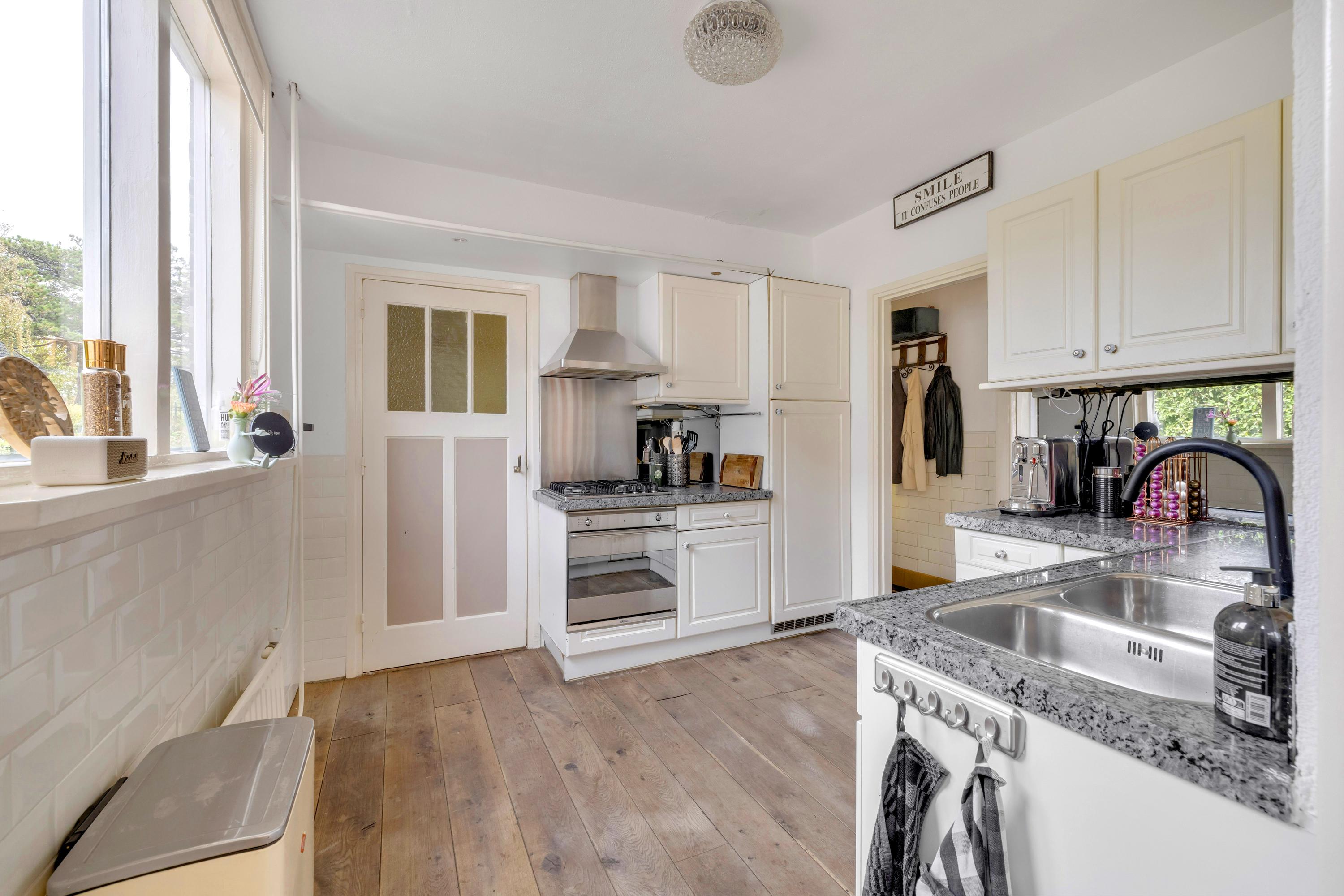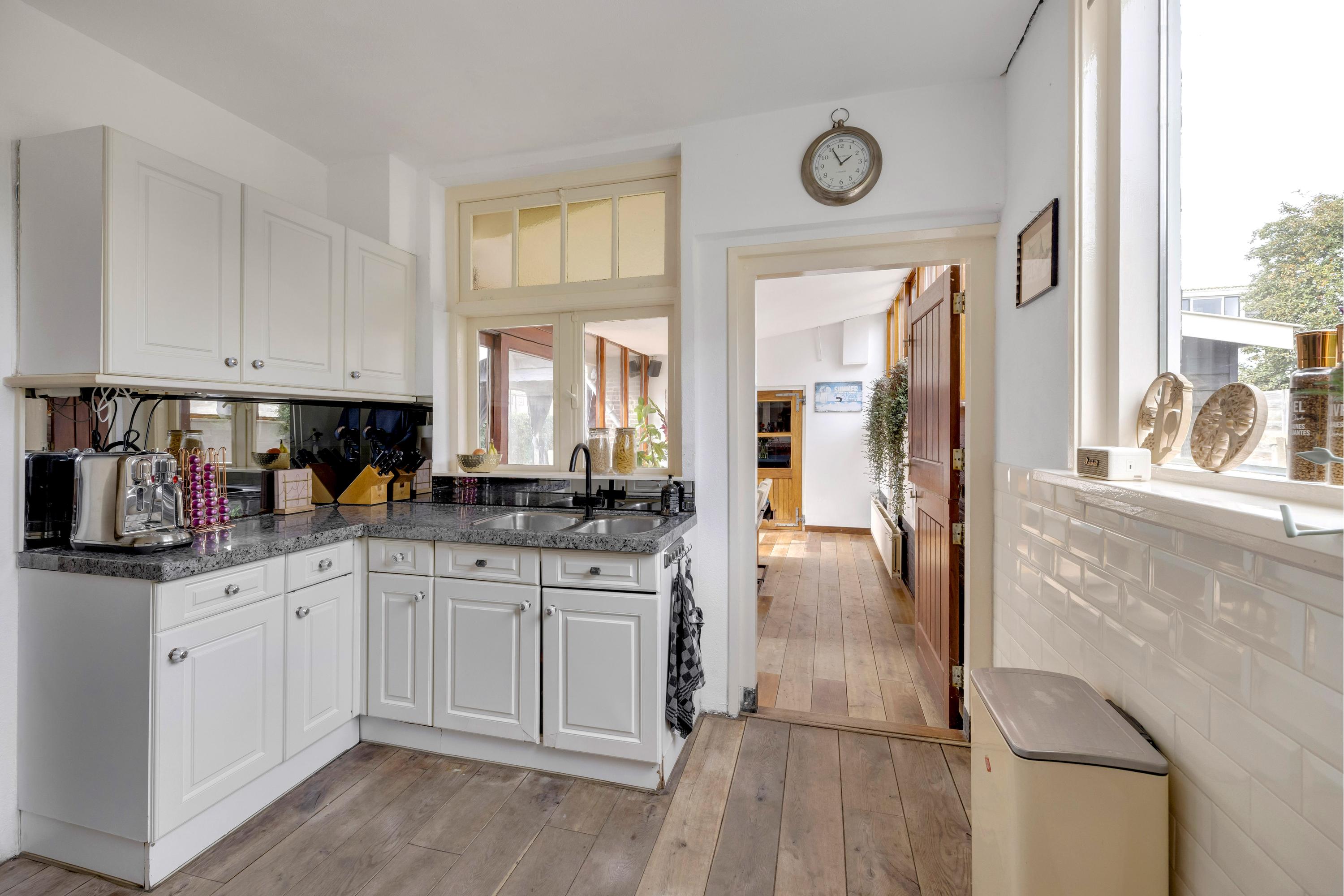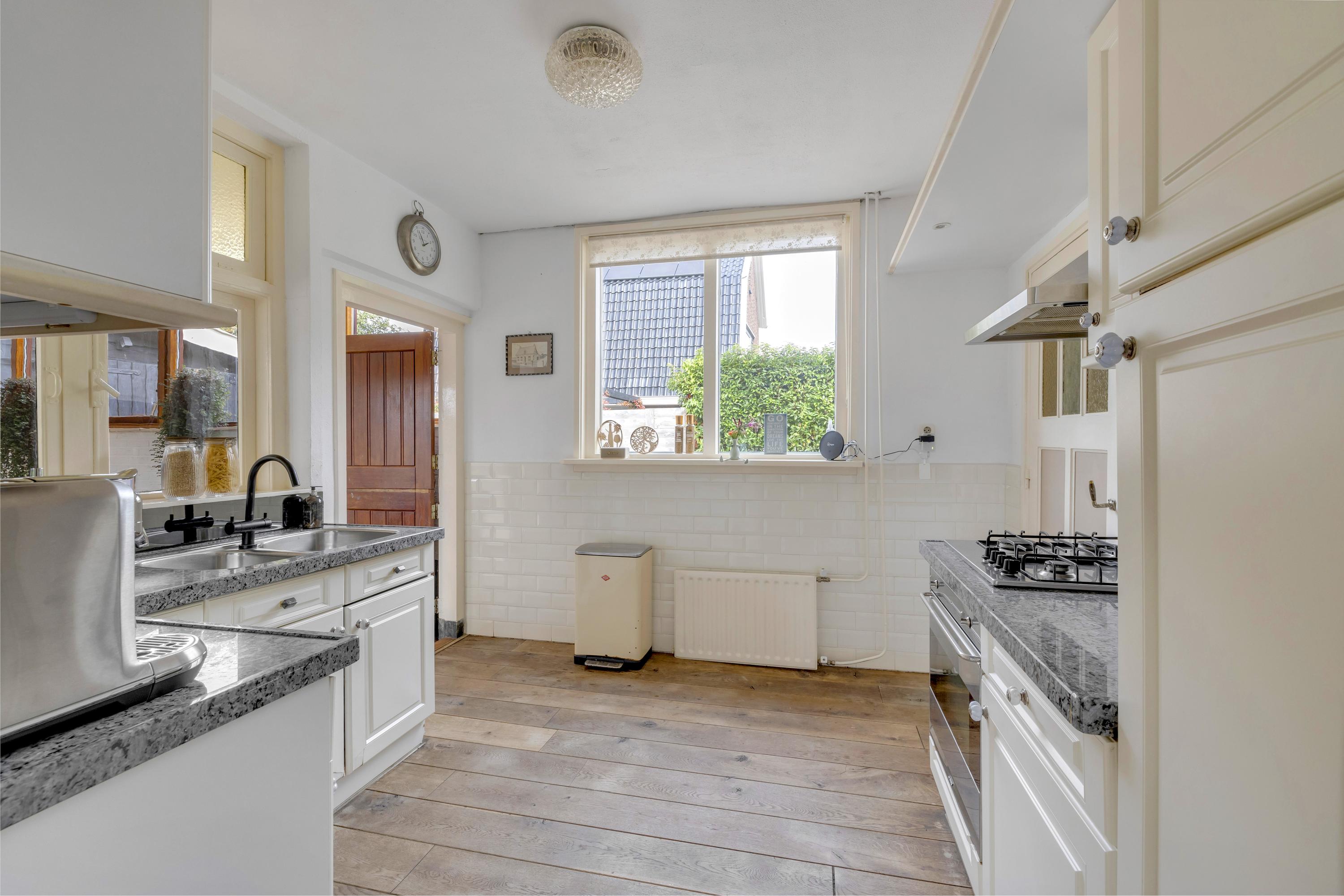 De dichte keuken is gelegen aan de achterzijde van de woning en heeft een opstelling in landelijke stijl met een hardstenen blad, spoelunit, koelkast, gaskookplaat, oven en afzuigkap. De vloer is v.v. eiken vloerdelen. In de keuken bevindt zich de kelderkast.