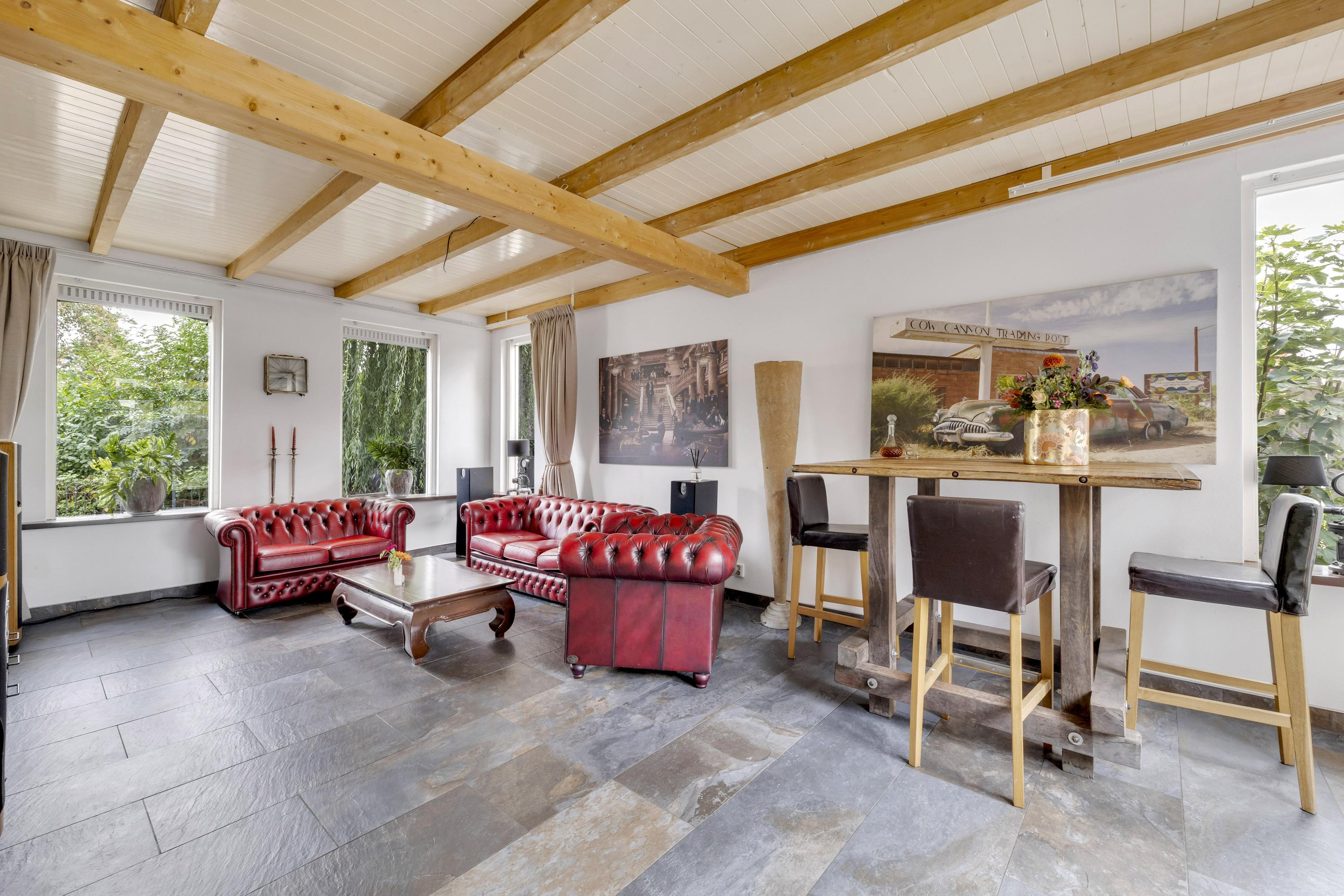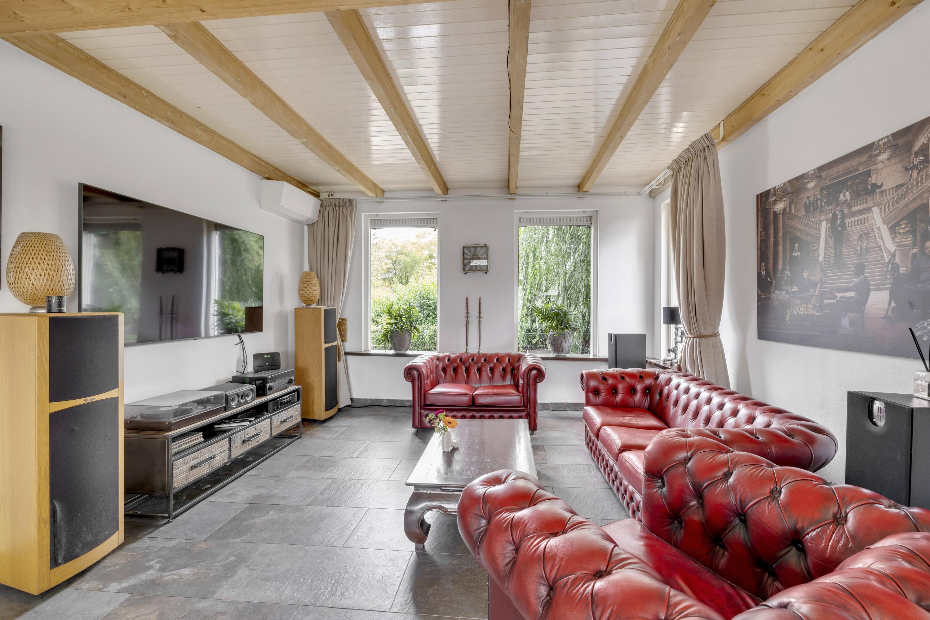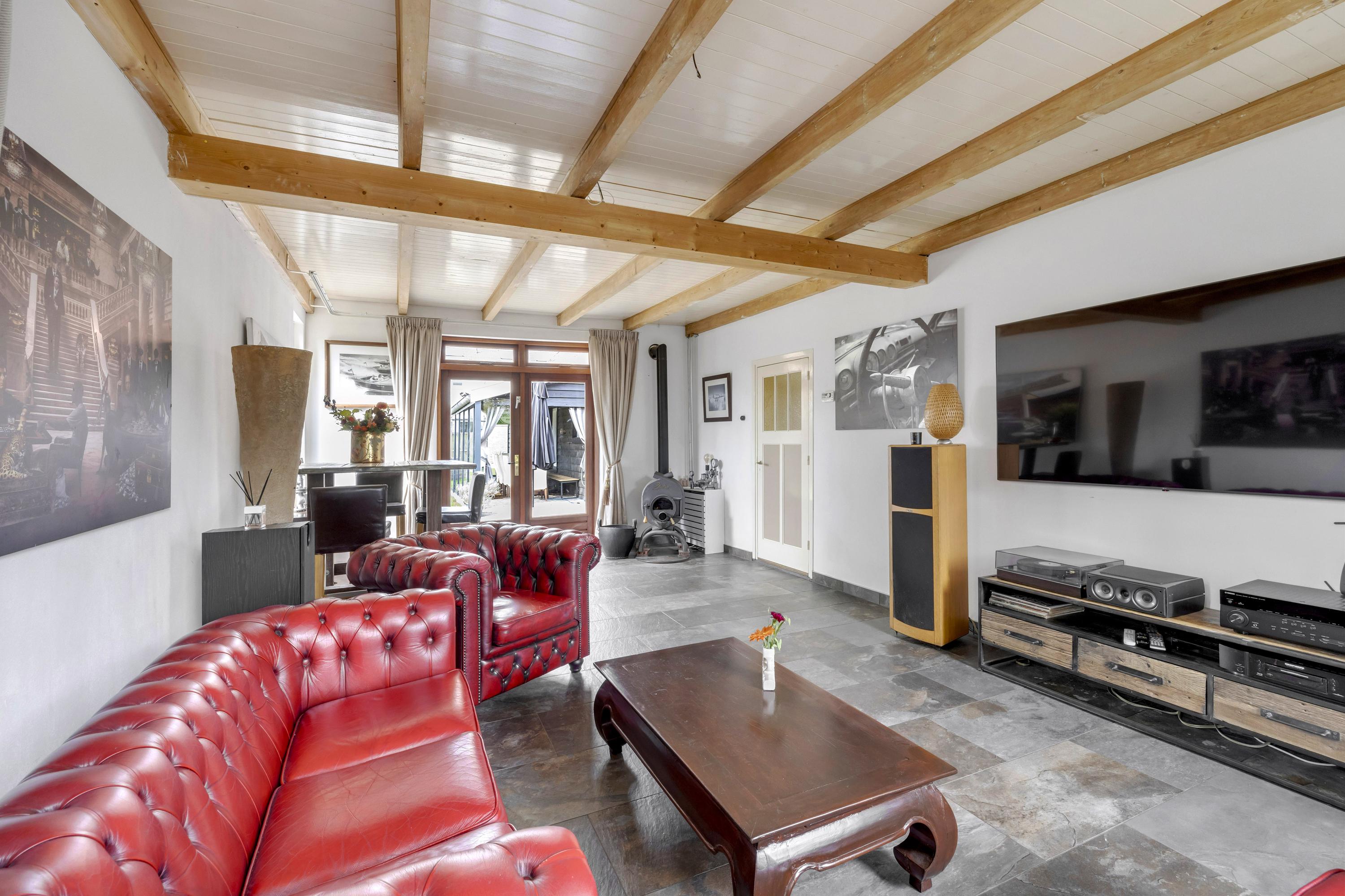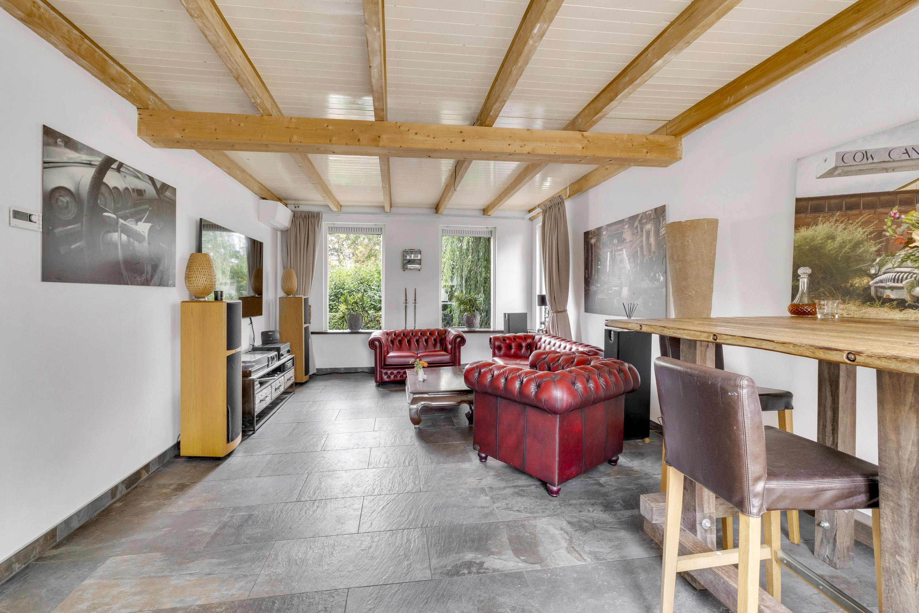De sfeervolle woonkamer is gelegen aan de voorzijde van de woning en heeft een balkenplafond, houtkachel, airconditioning en openslaande deuren naar de tuin. De vloer is uitgevoerd met plavuizen met vloerverwarming.
