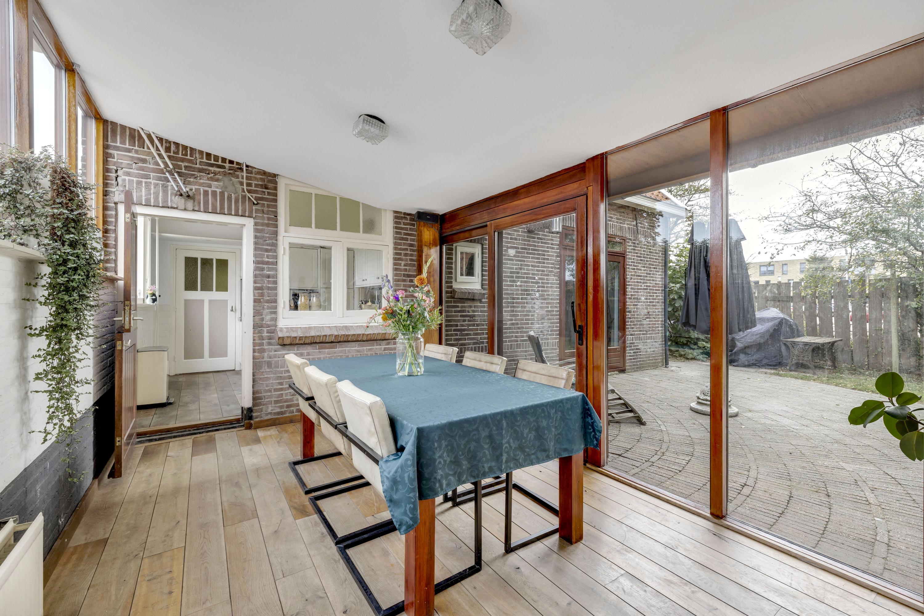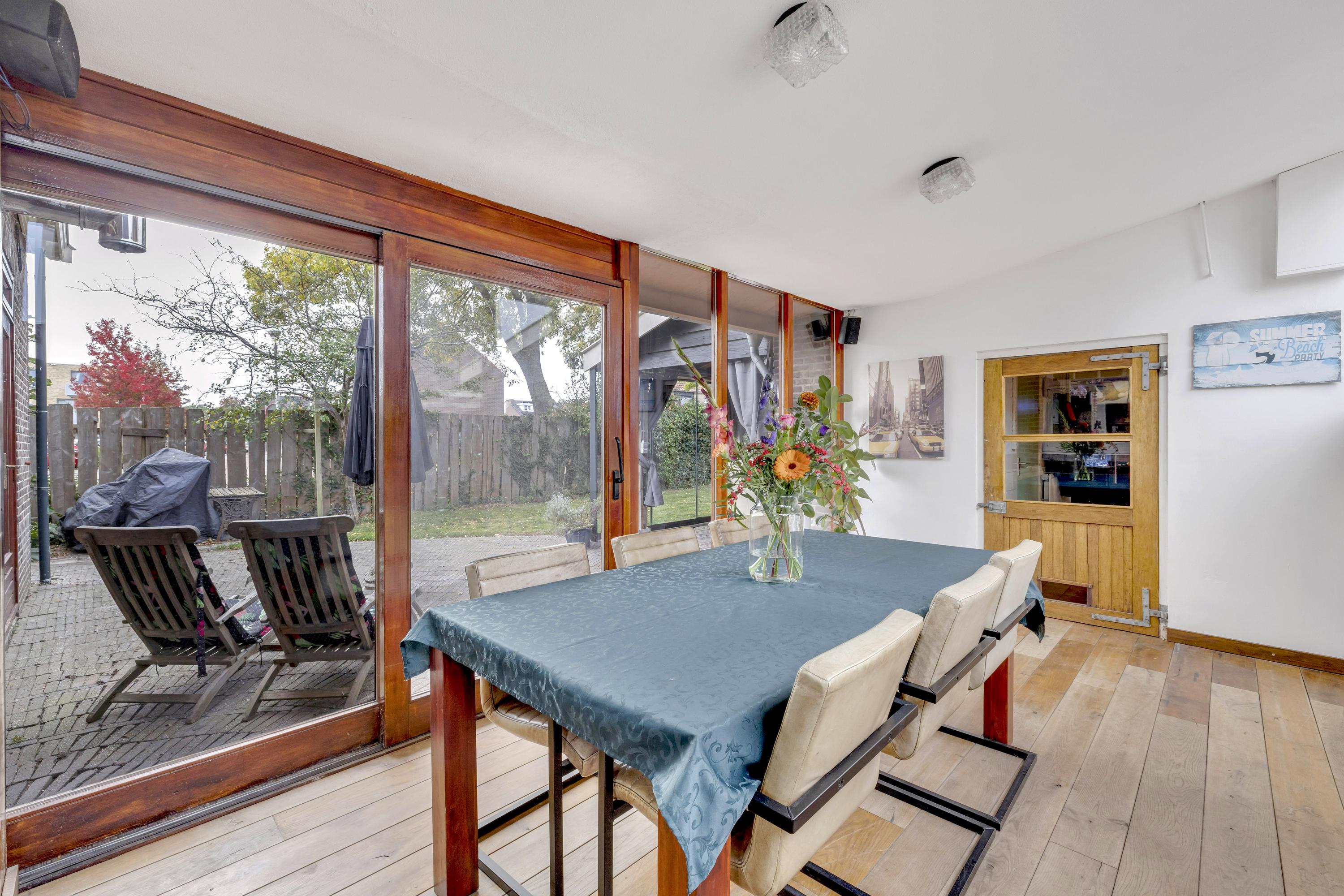 Aangebouwde eetkamer met eikenvloer, schuifpui naar de tuin en deur naar de gang/ bijkeuken.