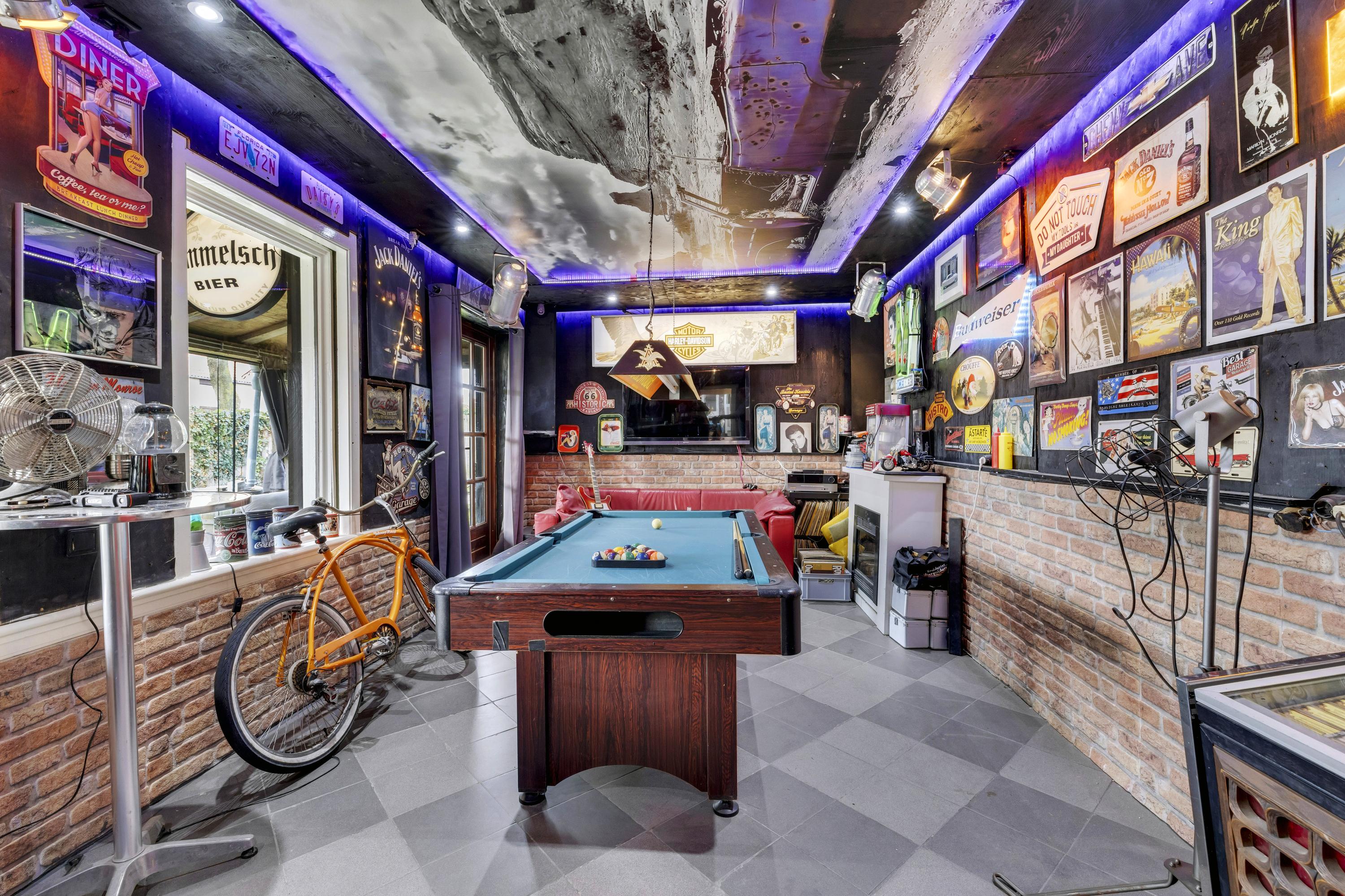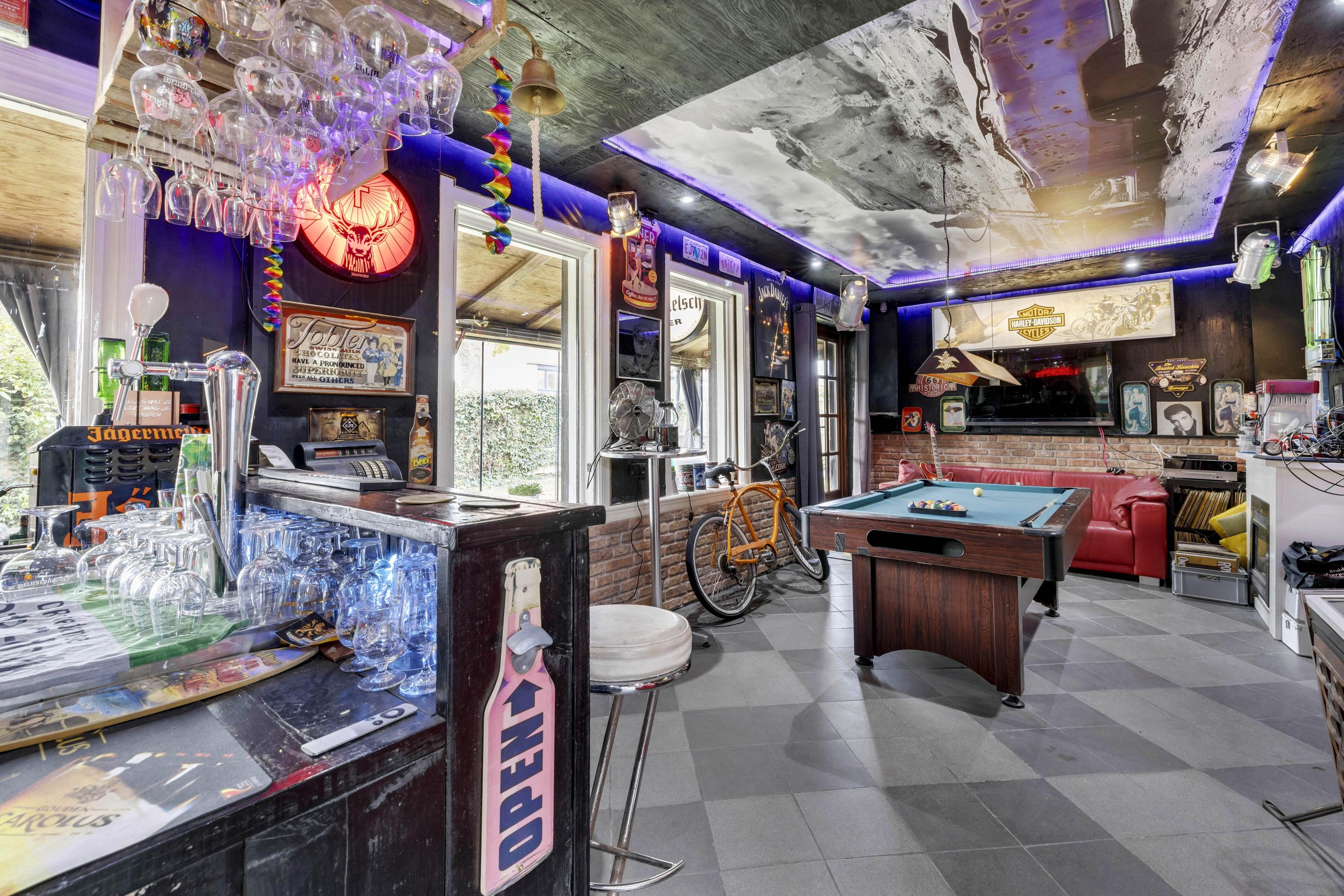 De royale hobbyruimte met daglicht is momenteel ingericht als kroeg/ mancave. Deze zou uitstekend kunnen dienen als extra slaapkamer met naastgelegen badkamer. De vloer is v.v. plavuizen met vloerverwarming. Ook hier is toegang tot de tuin. Vanuit hier is er een deur naar de garage. Verder is de bergvliering bereikbaar middels vlizotrap.