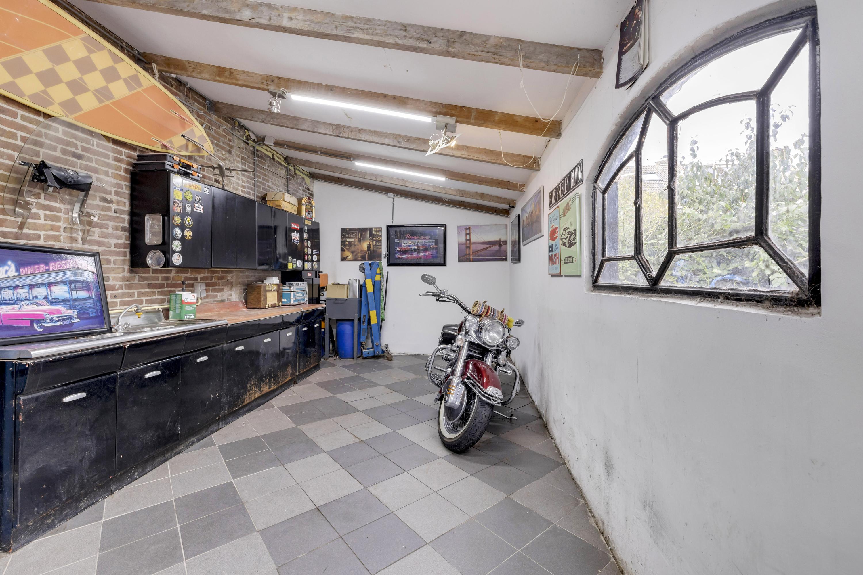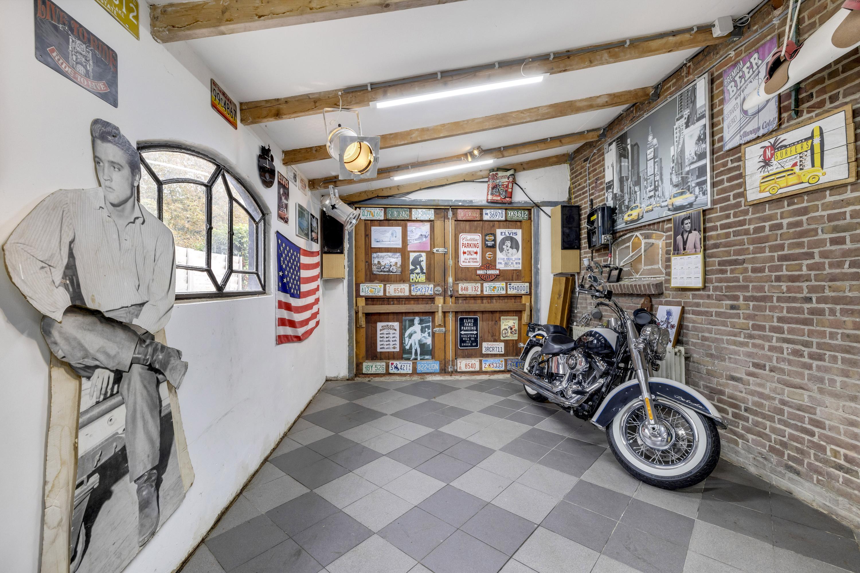 De zeer ruime en geïsoleerde garage met betonvloer beschikt over daglicht, elektra en openslaande inrij-deuren aan de voorzijde.