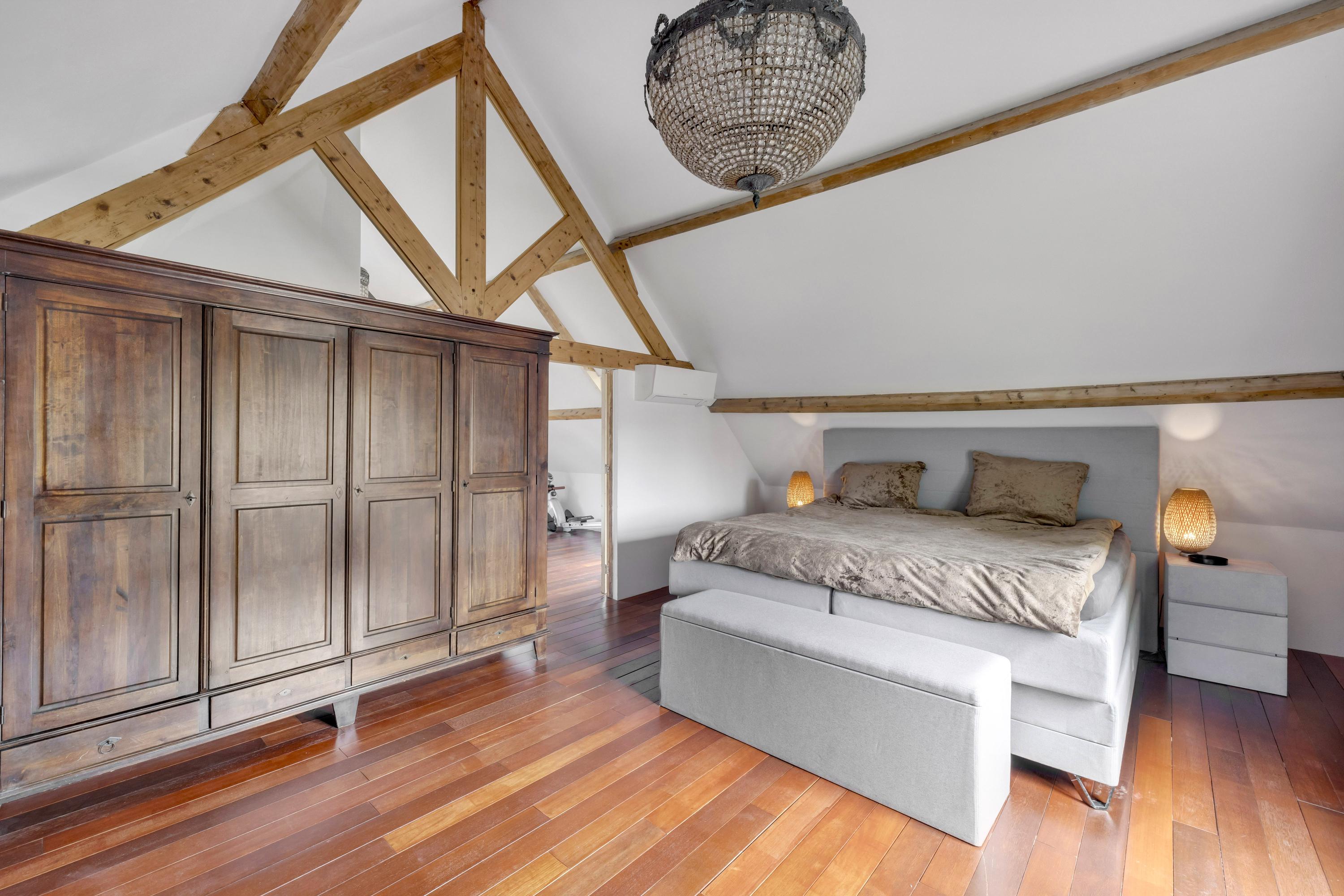 Deze zeer royale slaapkamer heeft een hoog plafond en beschikt over airconditioning.