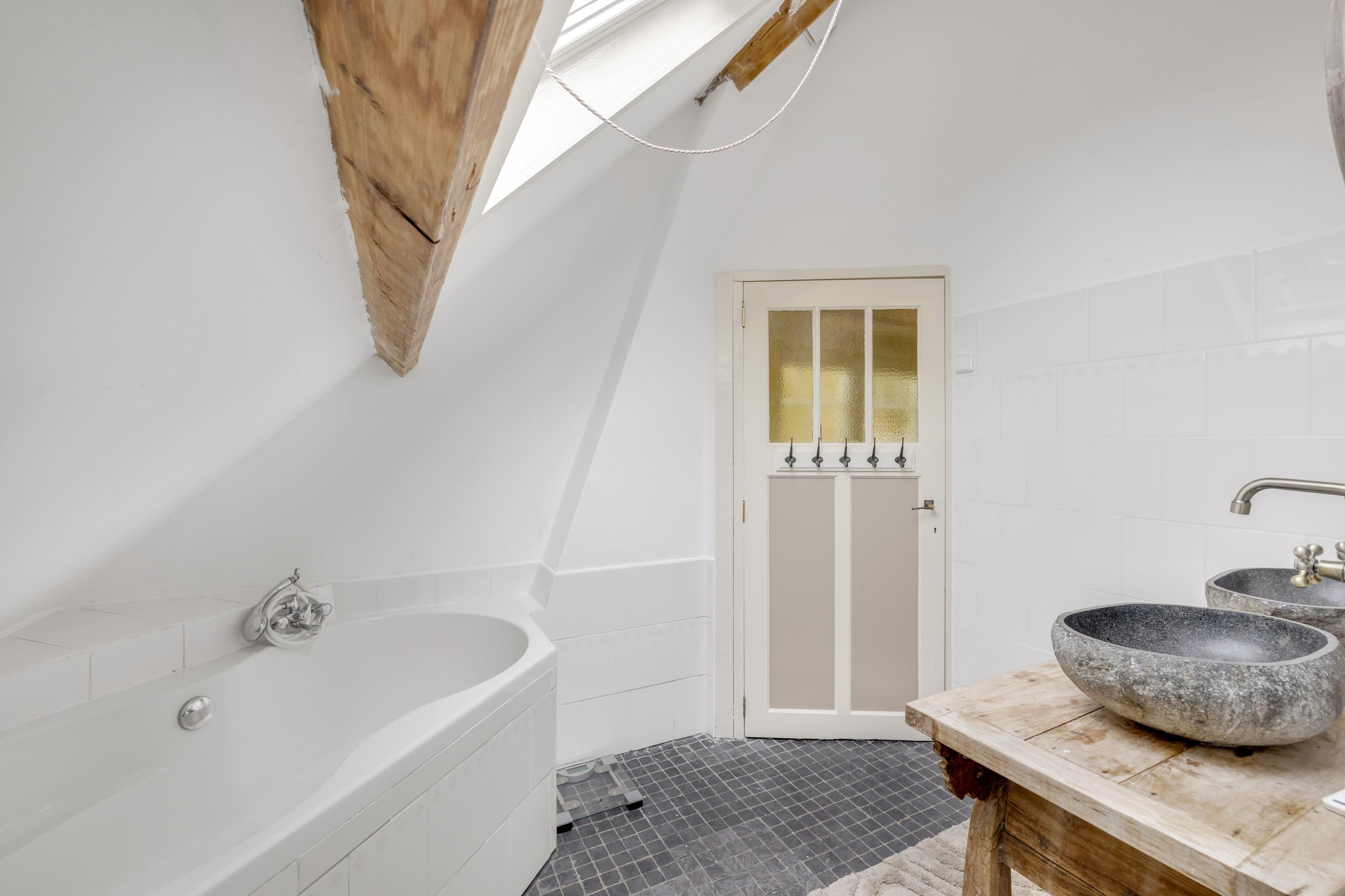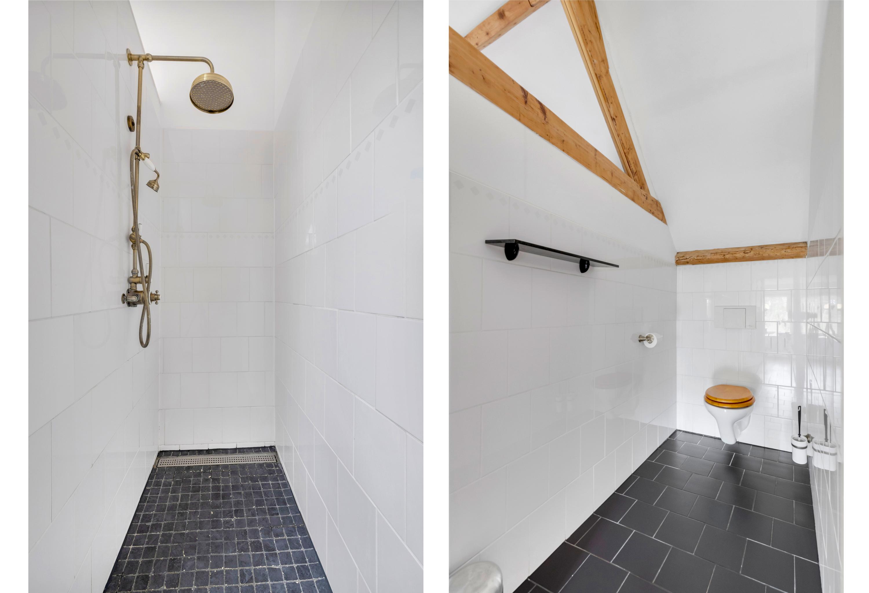 De moderne betegelde badkamer beschikt over een royale inloopdouche met regendouche, ligbad, dubbele wastafel, groot dakraam en elektrische vloerverwarming.