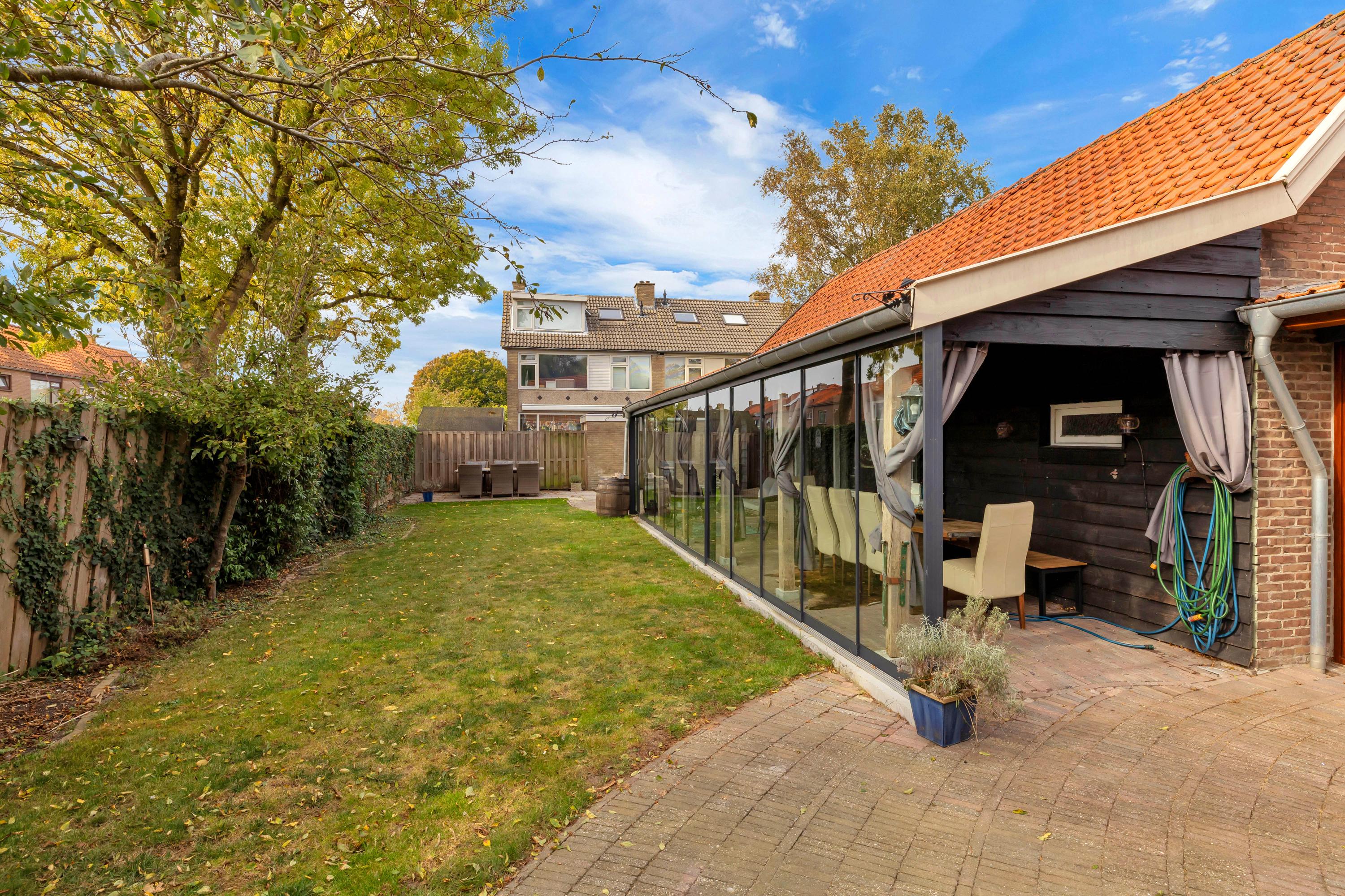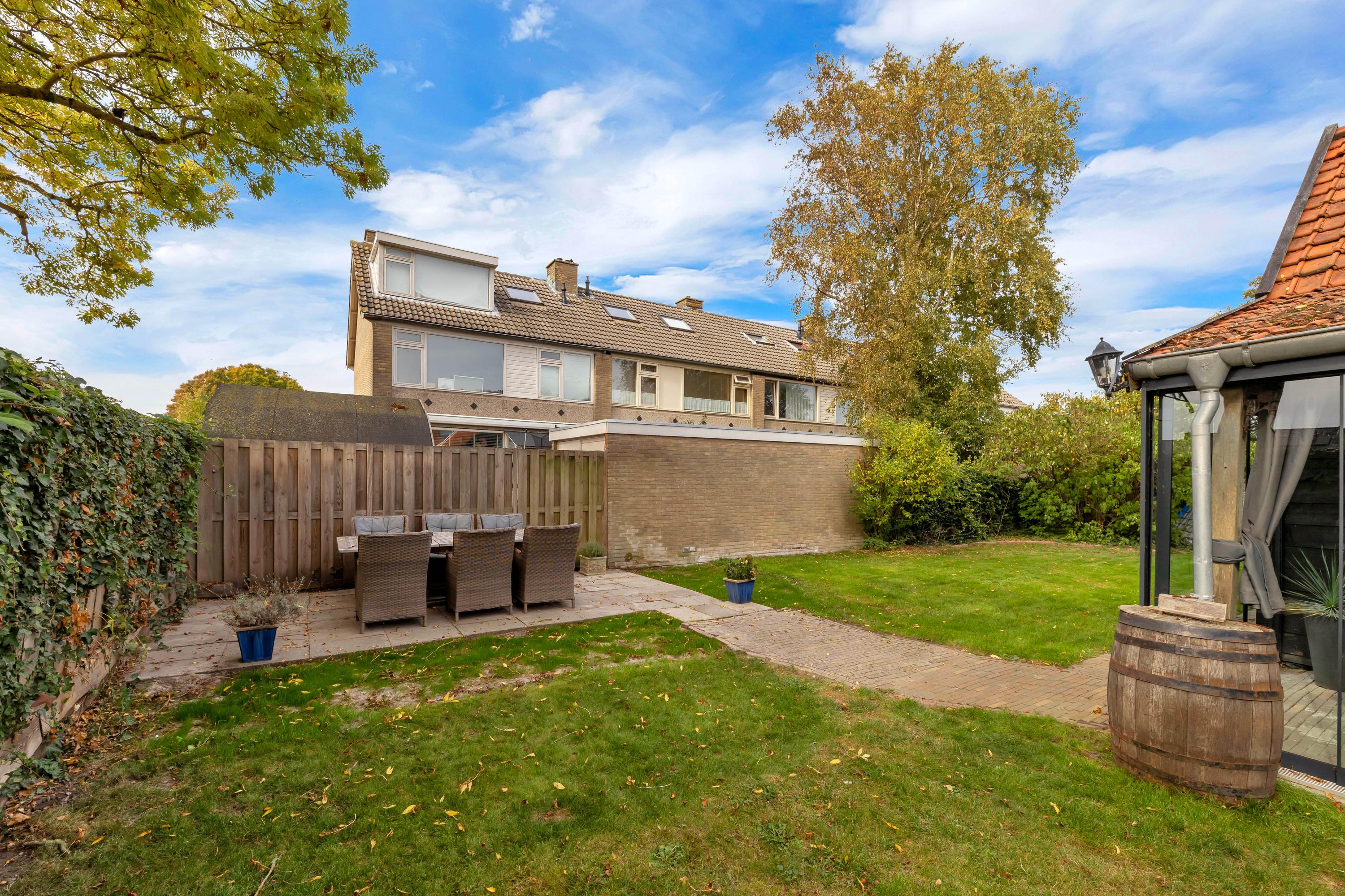 De ruime tuin is rondom de woning gelegen. Op de oprit is ruime parkeergelegenheid en toegang tot de garage. Verder is de tuin uitgevoerd met diverse terrassen, gras en een royale terrasoverkapping.