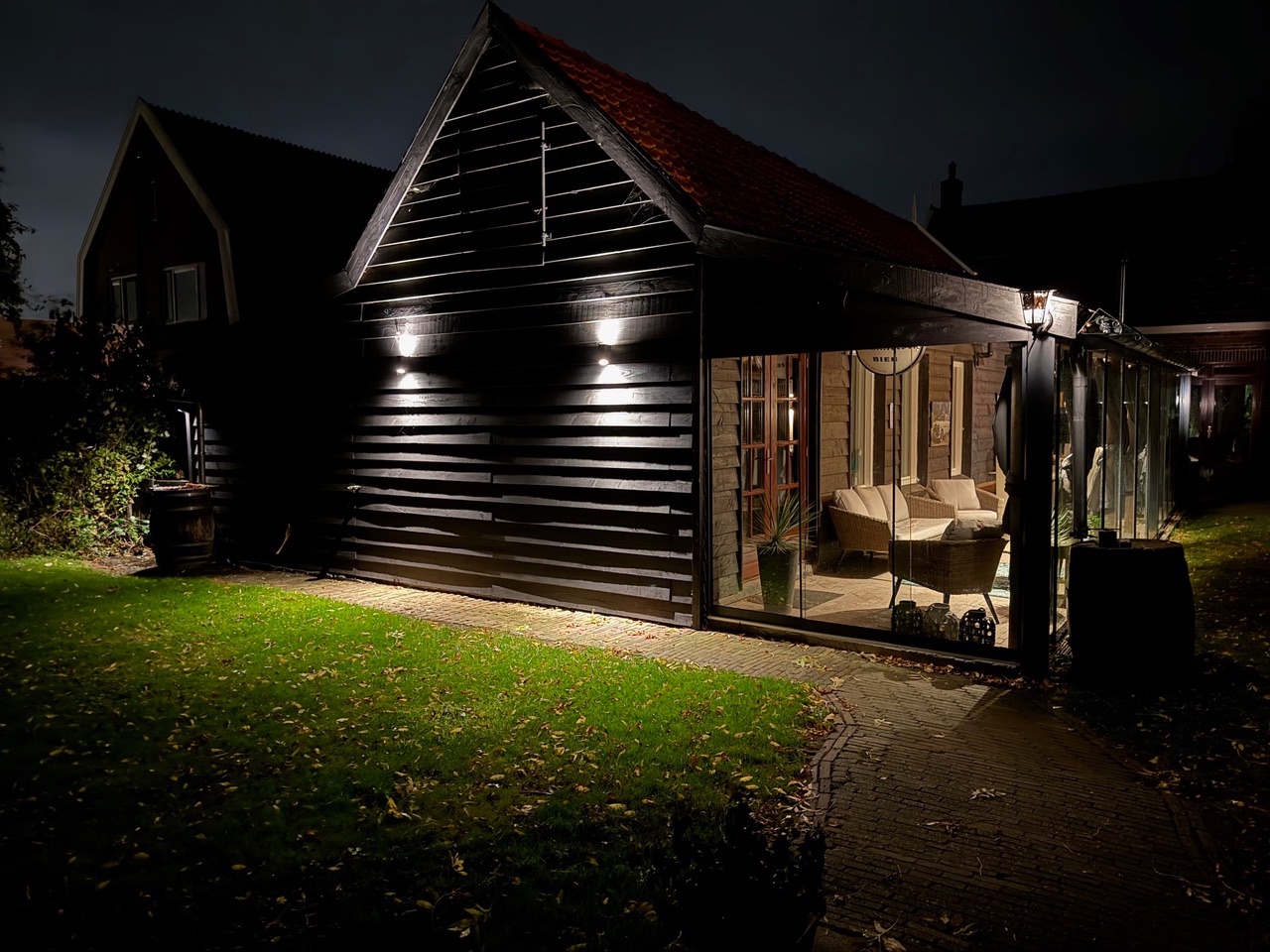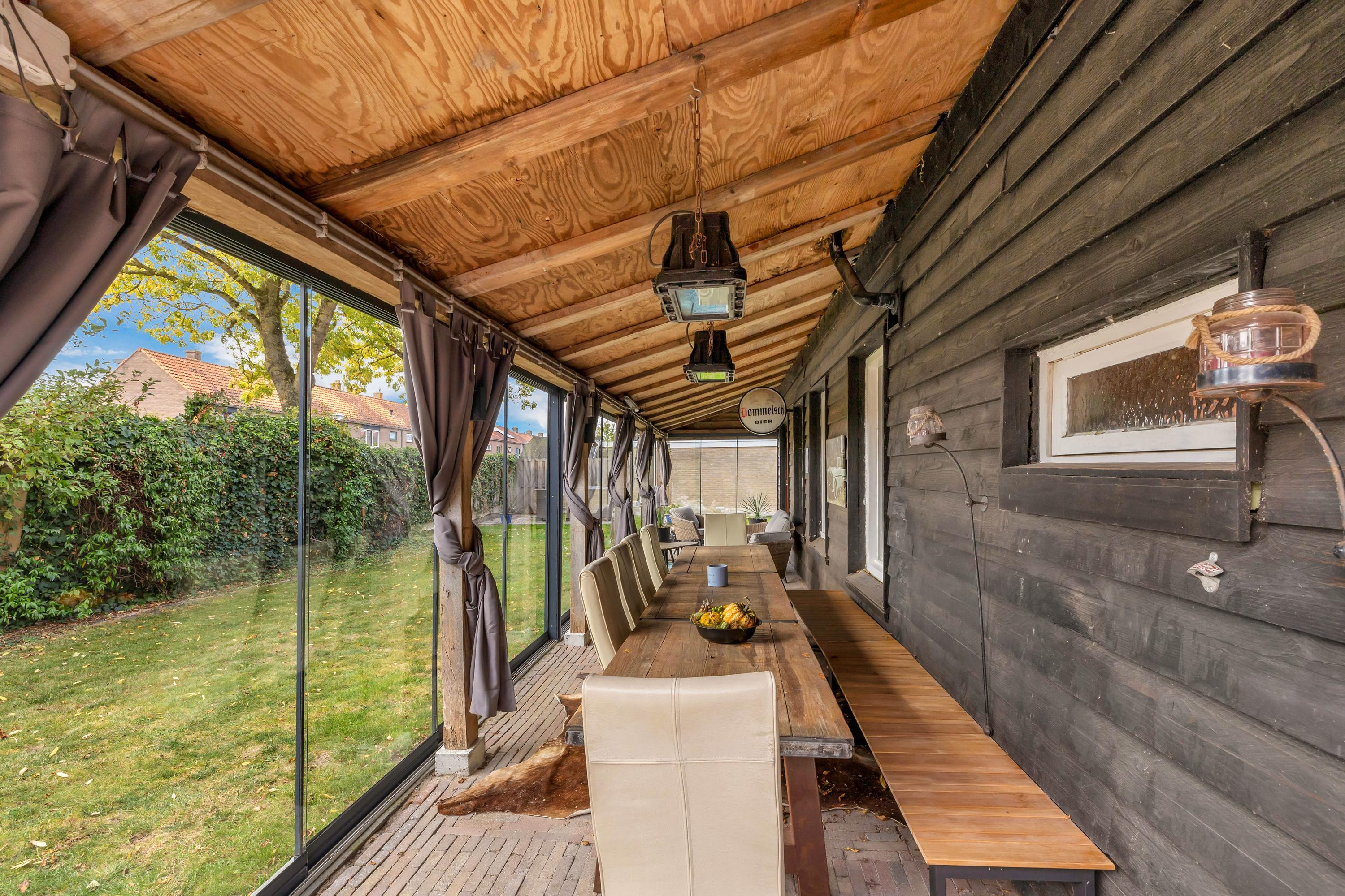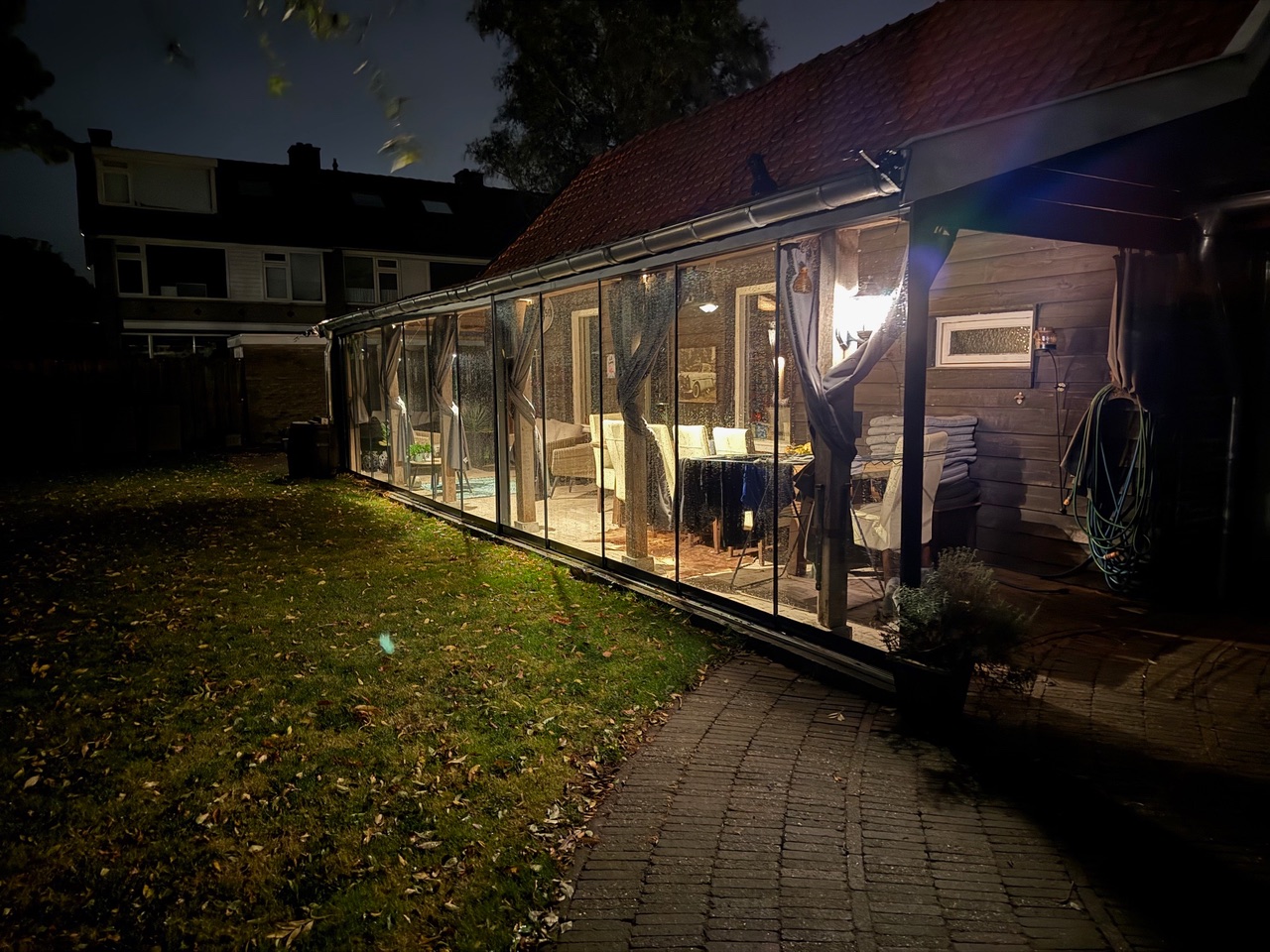 De sfeervolle terrasoverkapping biedt ruimte aan een zeer grote eettafel welke garant staat voor menig gezellig moment met familie en vrienden. De overkapping is rondom voorzien van af te sluiten glazen panelen, zodat deze altijd naar behoefte (deels) geopend of gesloten kan worden.