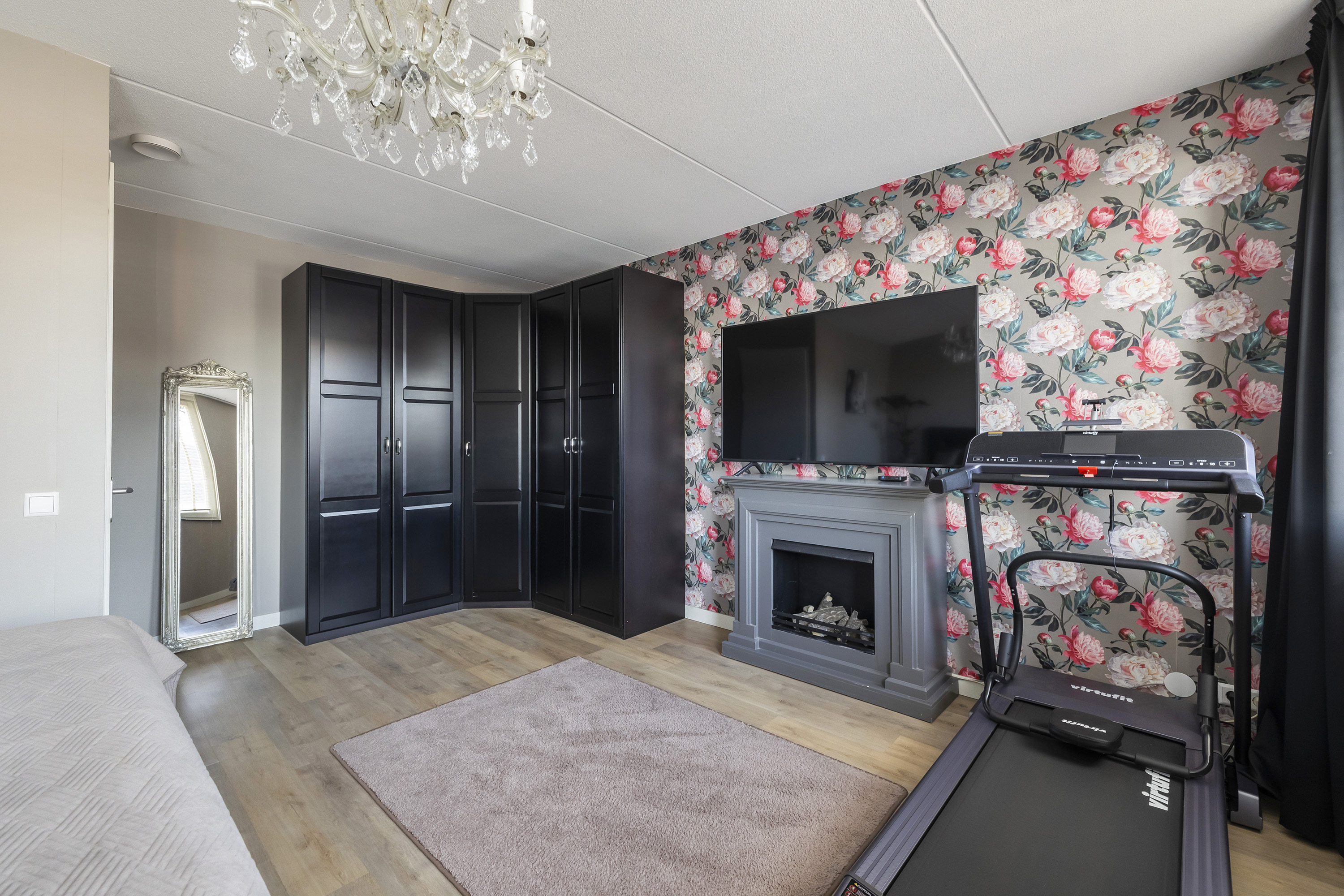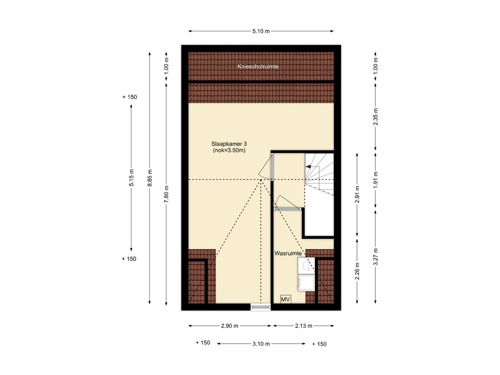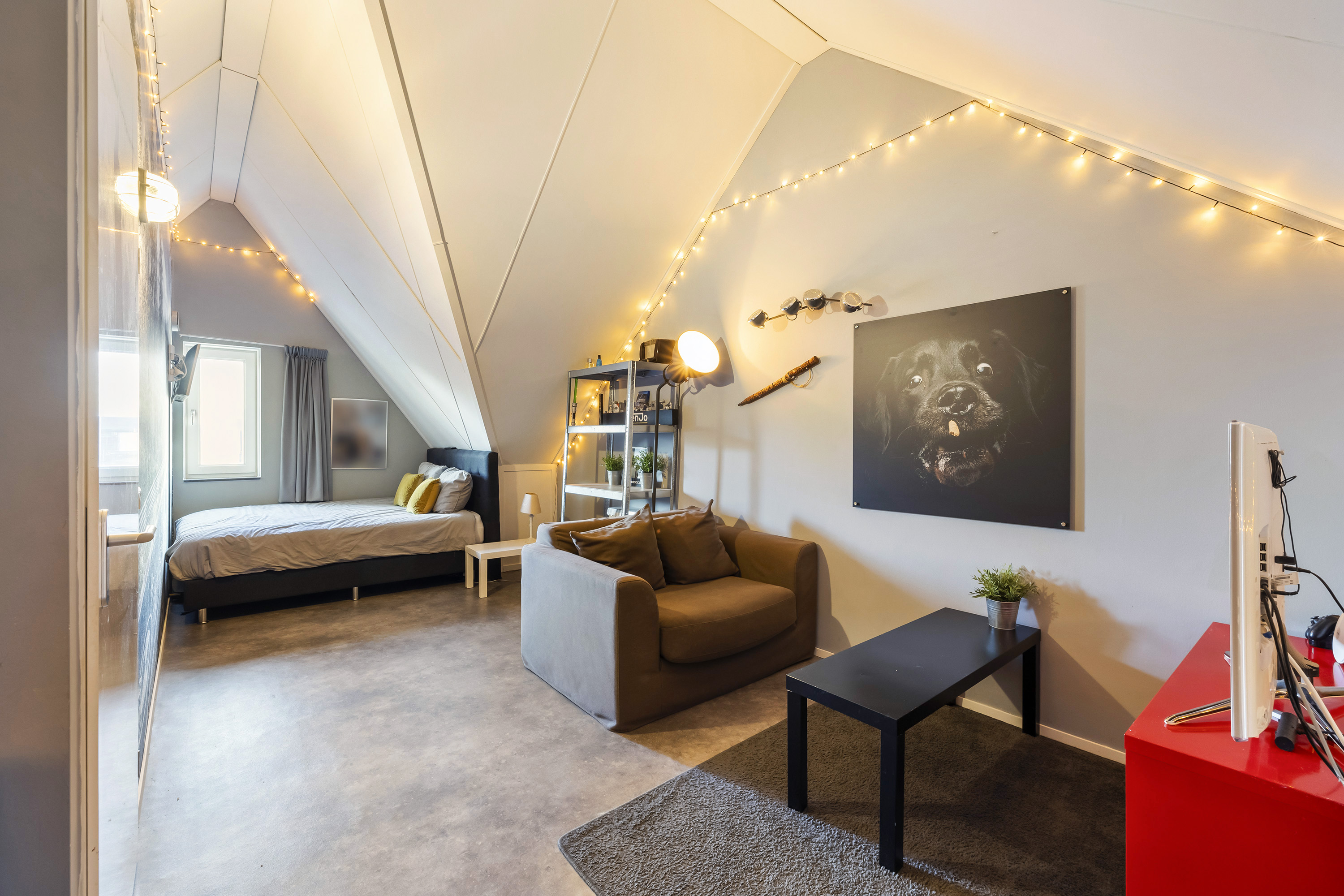 Ruime slaapkamer met raam aan voorzijde. Ook deze verdieping beschikt over vloerverwarming. Er is bergruimte achter de knieschotten.