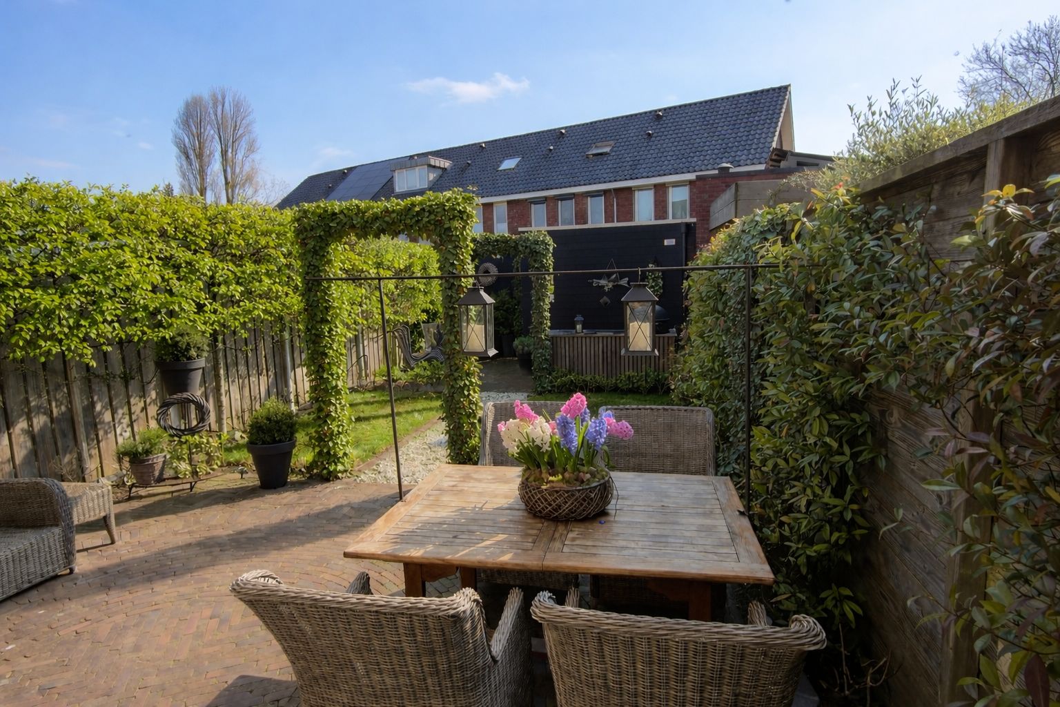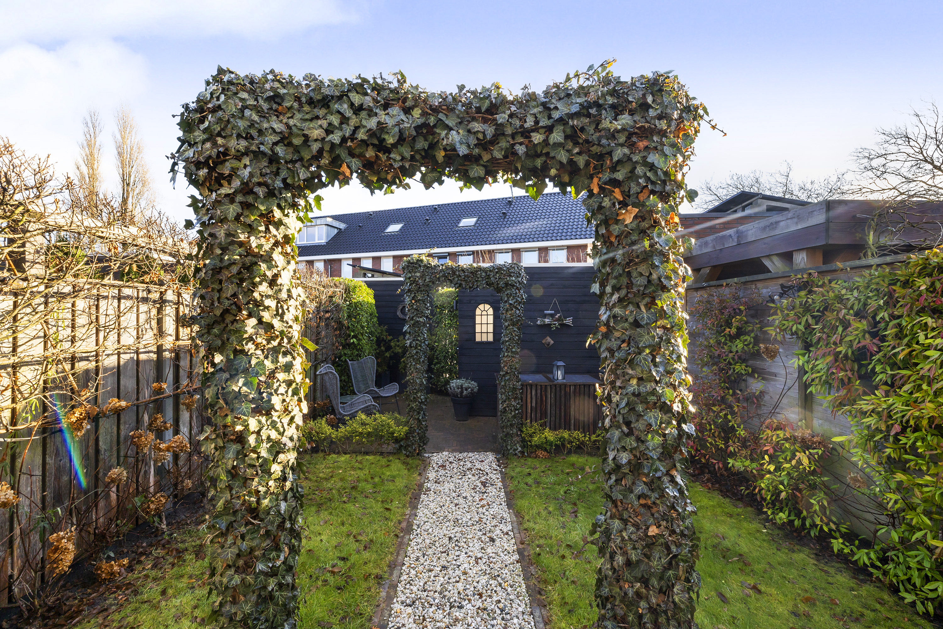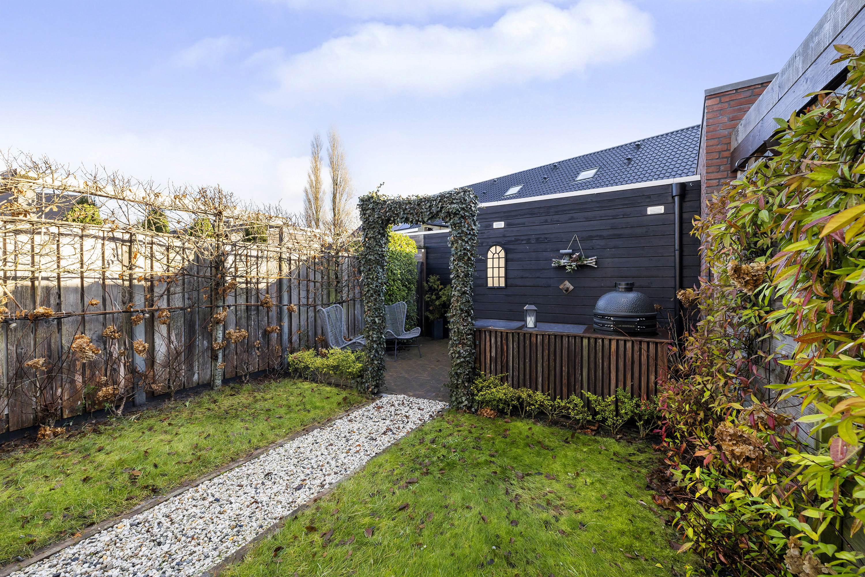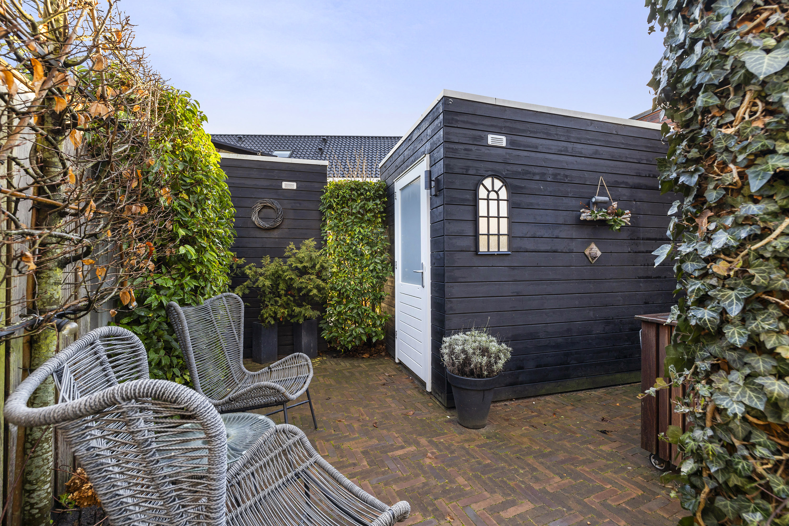 De achtertuin is mooi en sfeervol aangelegd en beschikt over gras, terras, borders en vrijstaande houten schuur.