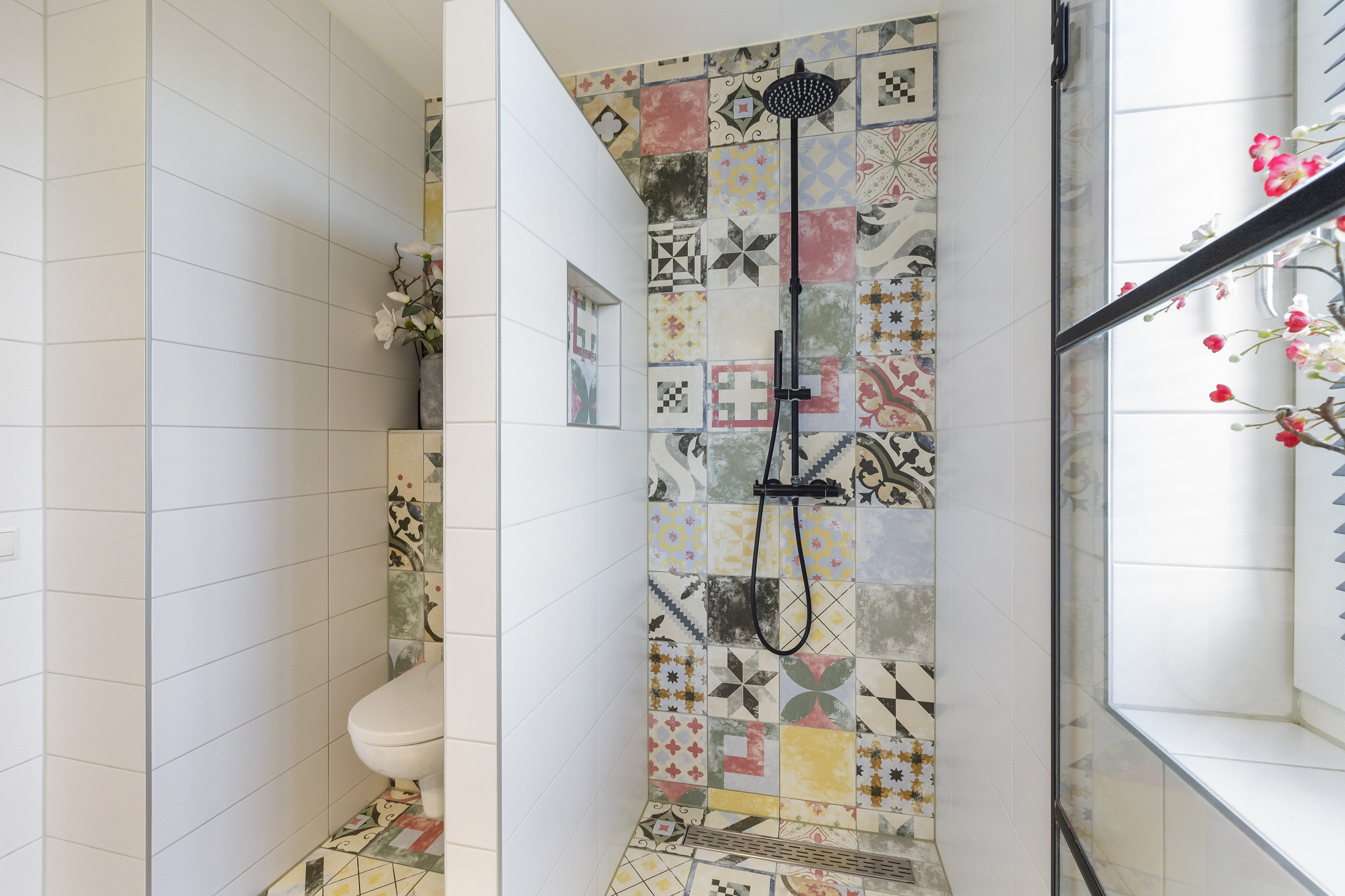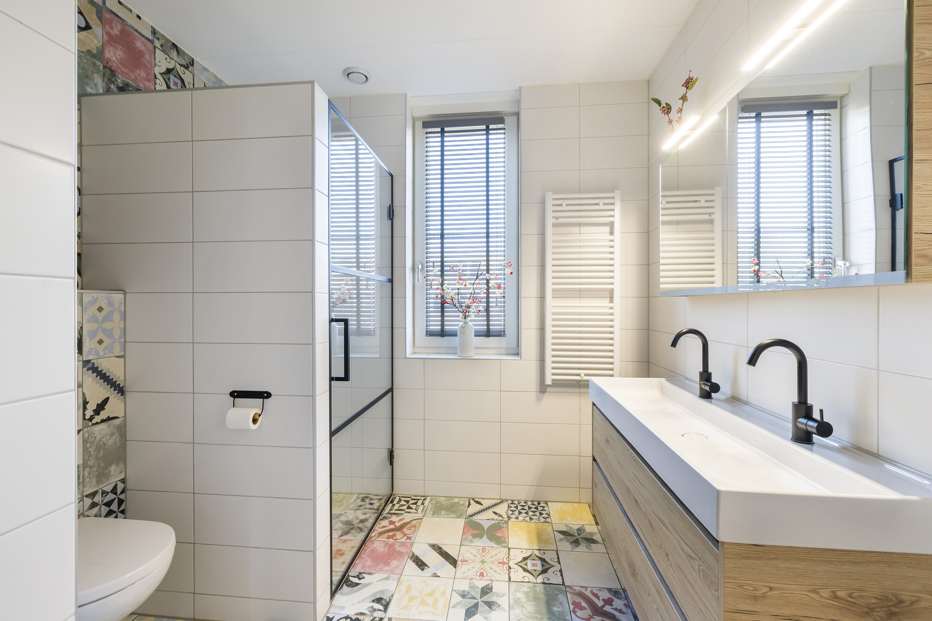 De moderne badkamer is bij de bouw vergroot en voorzien van toilet, elektrische verwarming, regendouche en dubbel wastafelmeubel.
