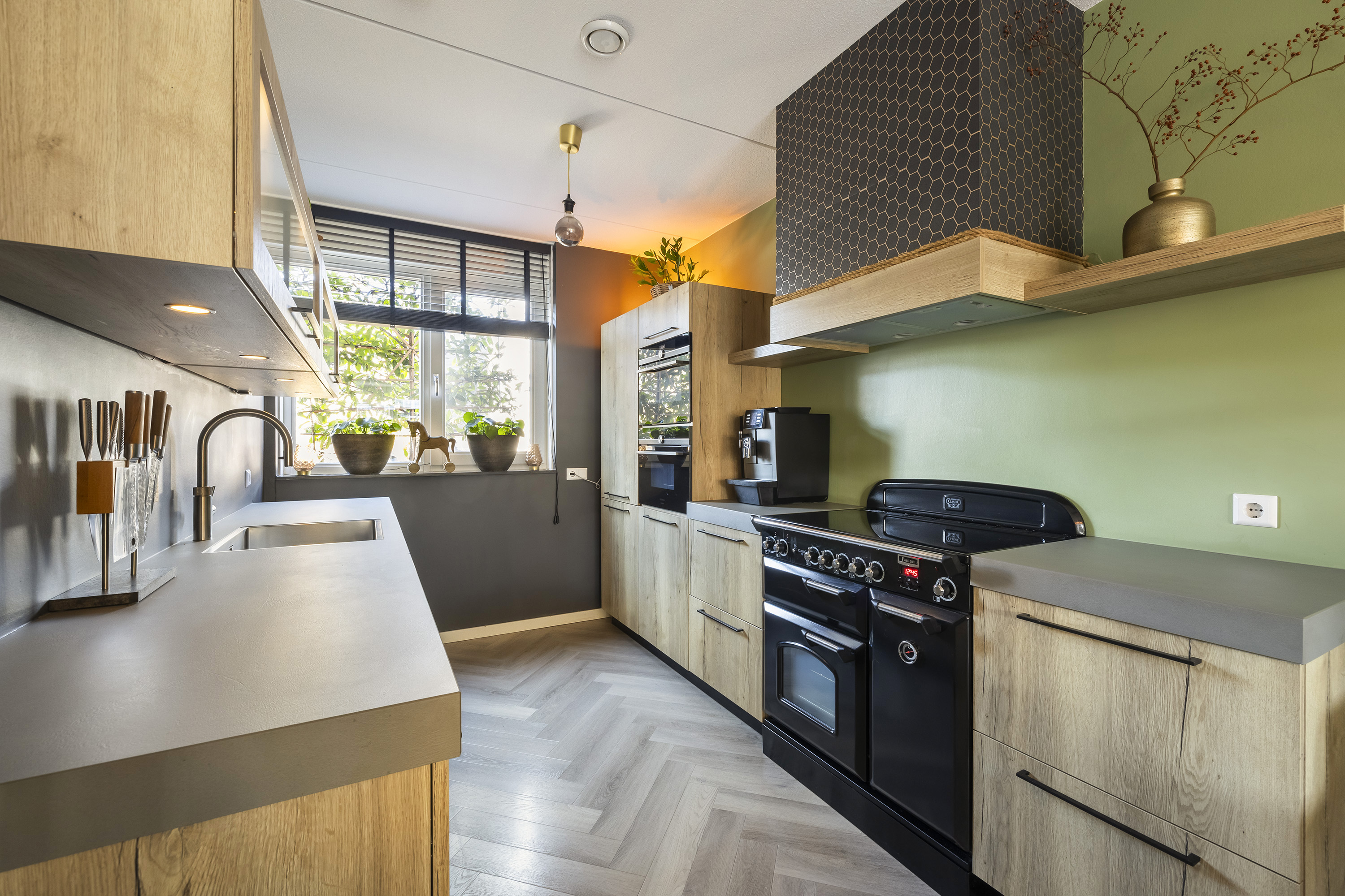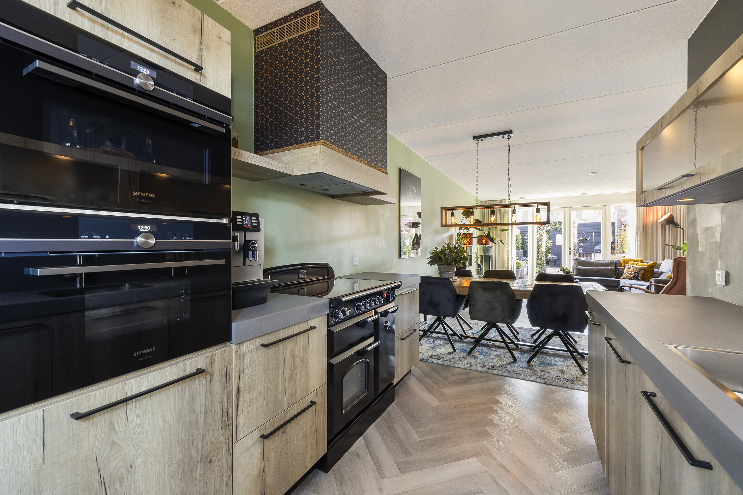 De open keuken met dubbele wandopstelling is gelegen aan de voorzijde van de woning. Deze is ook extra ruim door de uitgebouwde gevel. De keuken beschikt over een spoelunit met Quooker, dubbele Falcon oven, grillplaat en inductie kookplaat, afzuigkap, stoomoven, magnetron en koel- en vries. Door de houtlook en de vele inbouwapparatuur geeft dat de keuken een luxe en warme uitstraling.