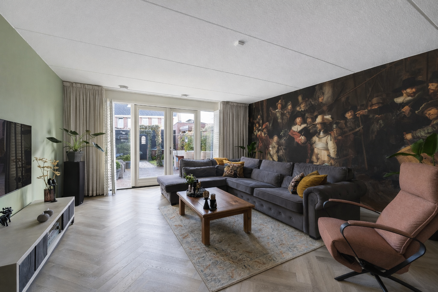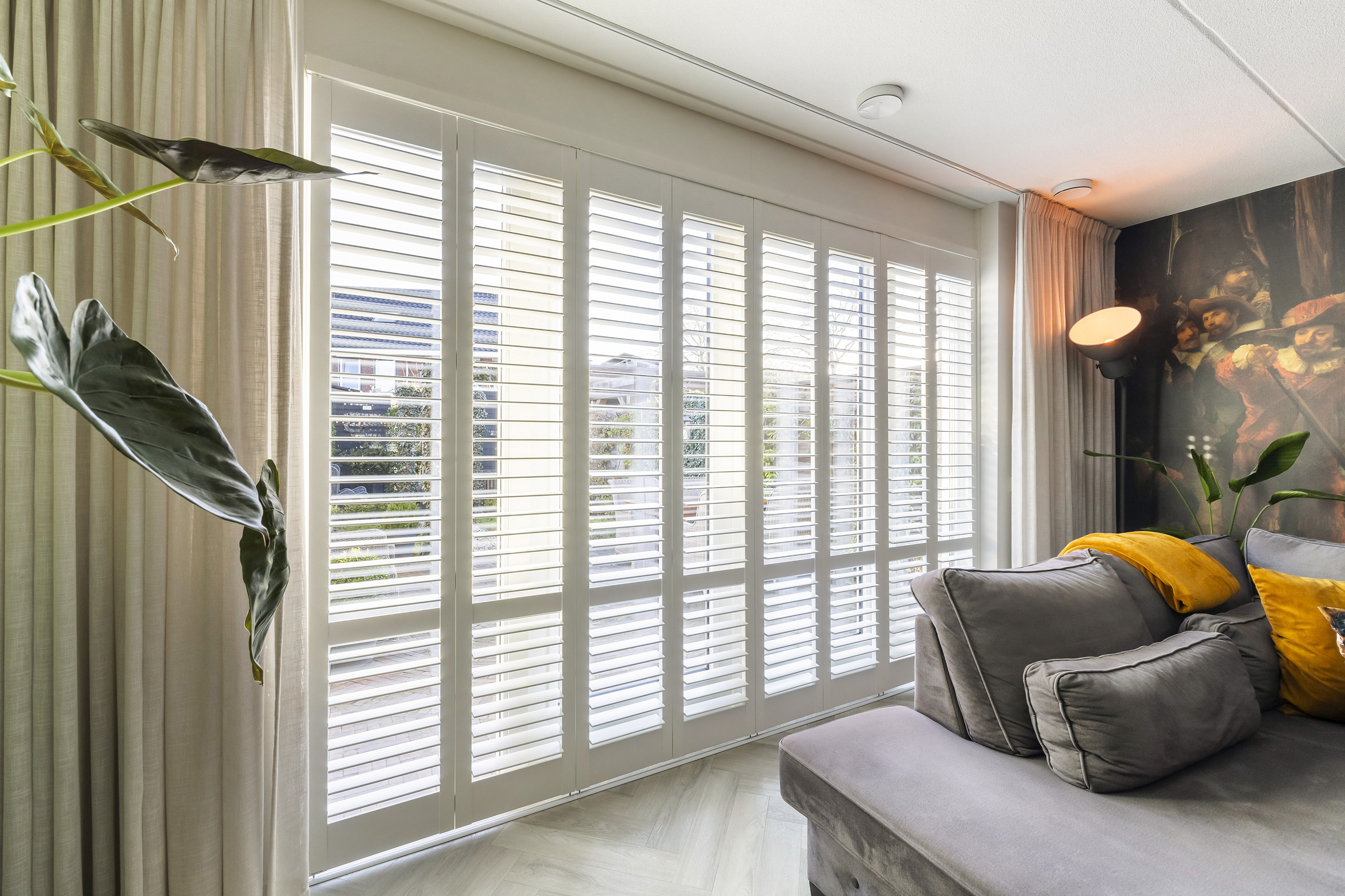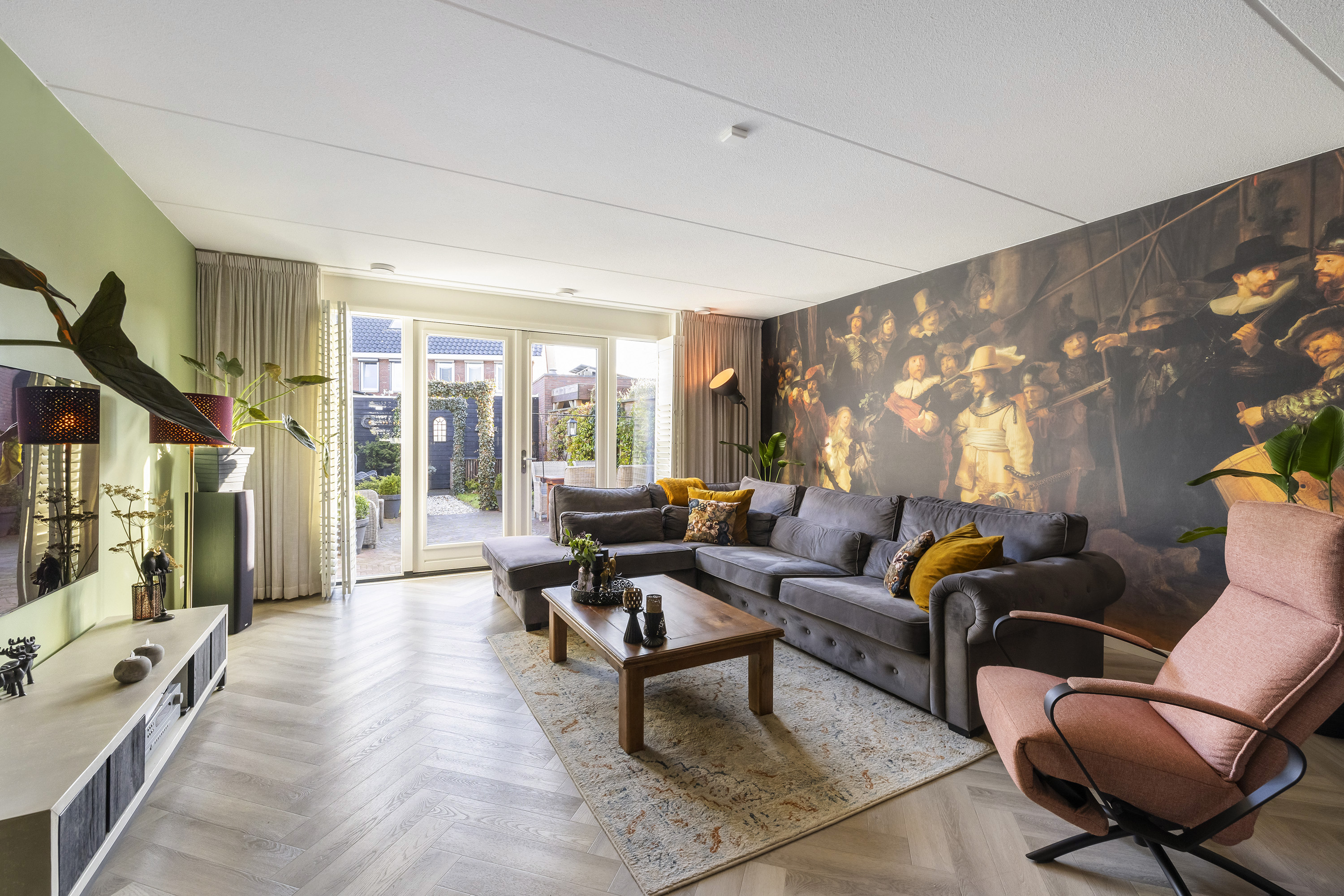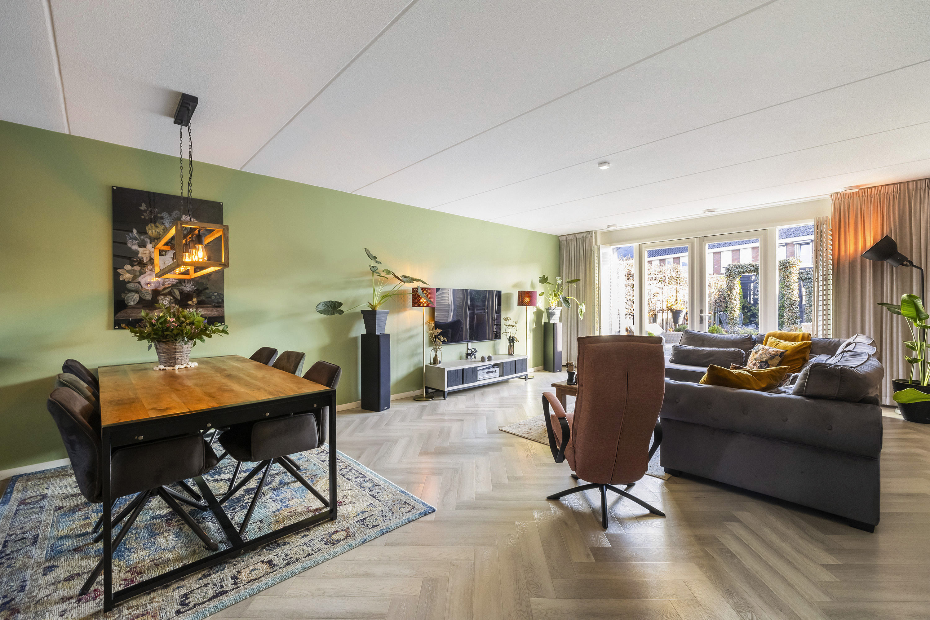 Sfeervolle en uitgebouwde woonkamer met openslaande deuren, fraaie shutters, visgraat pvc-vloer en elektrische zonwering. De vloer is voorzien van vloerverwarming.