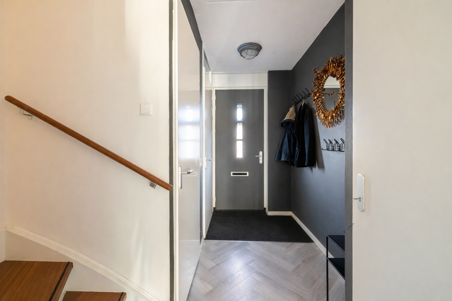 Overloop met toegang tot 2 (eenvoudig 3) slaapkamers, badkamer en trap naar de 2e verdieping. De gehele verdieping is v.v. vloerverwarming en laminaat.