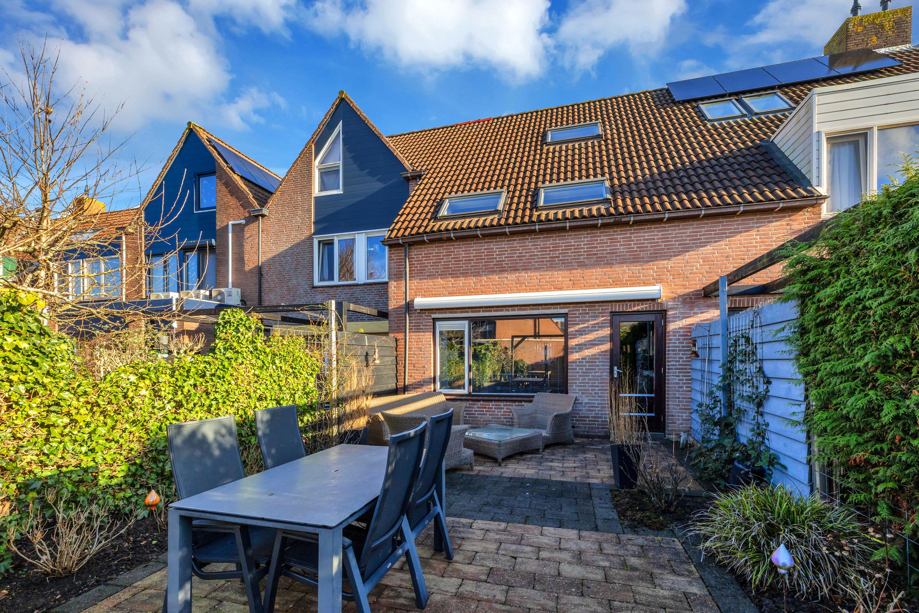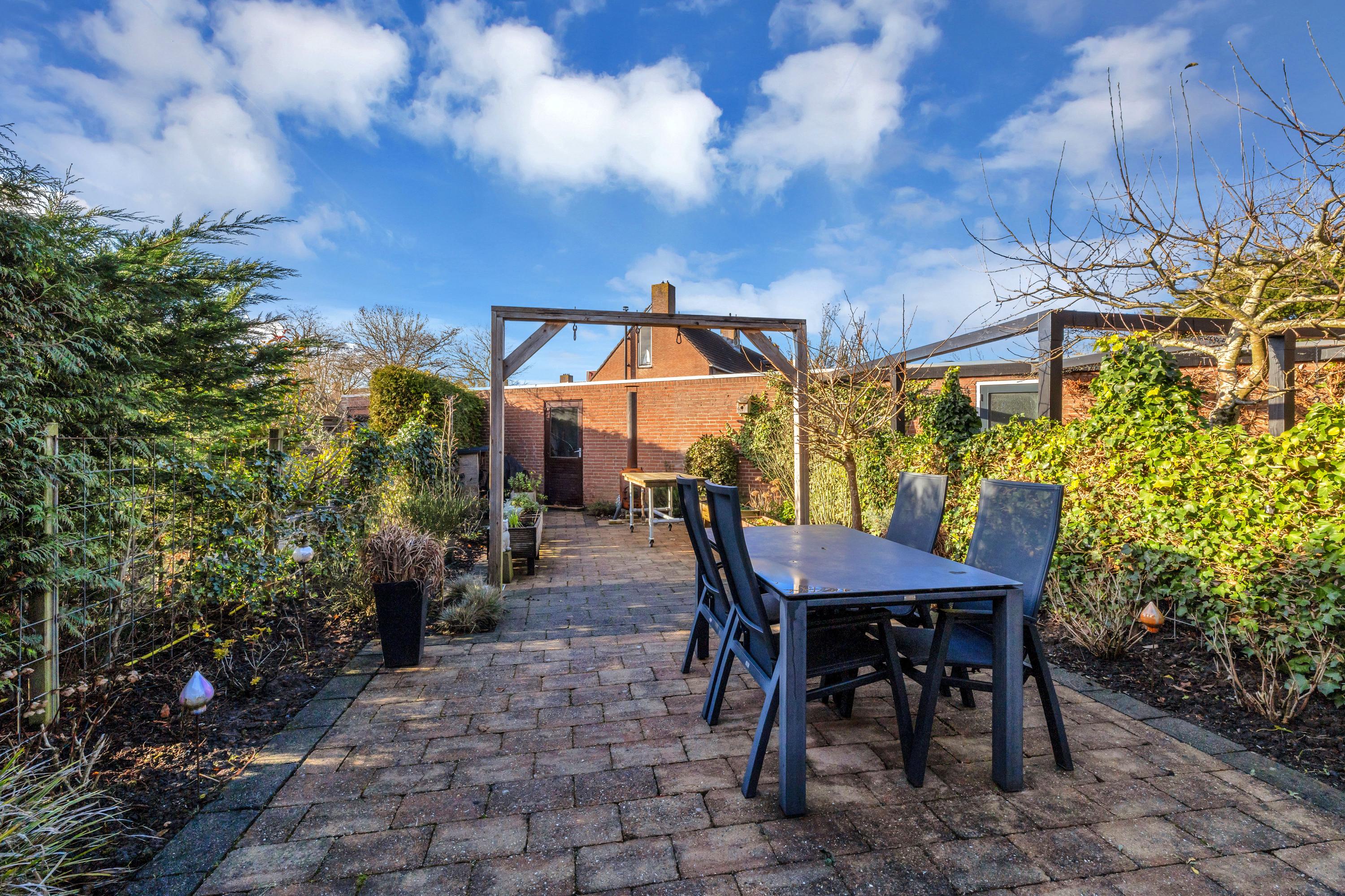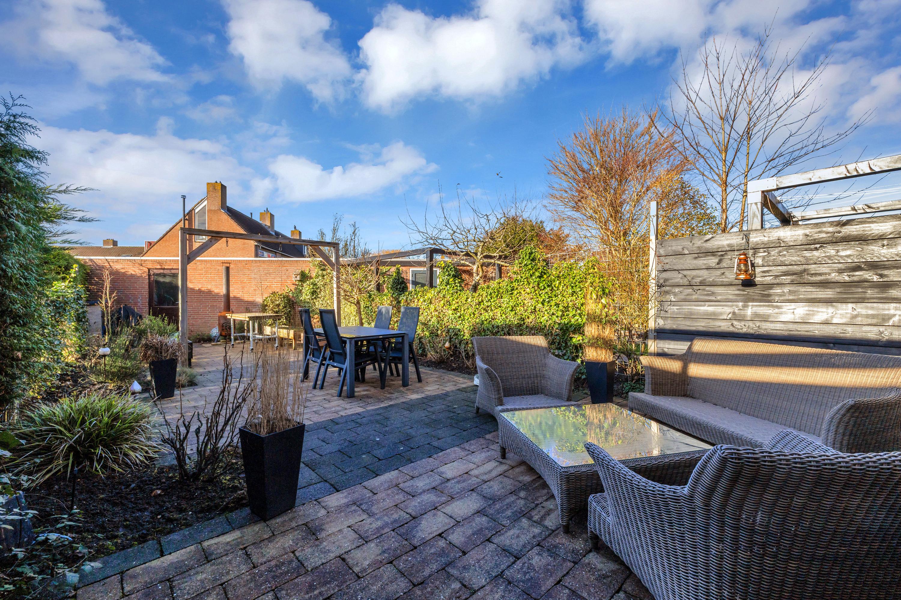 De diepe achtertuin is gelegen op het westen en dus heerlijk zonnig. Hier geniet u de gehele dag van de zon. De tuin is afgewerkt met sierbestrating en diverse borders. Achter in de tuin is de garagebox te bereiken.