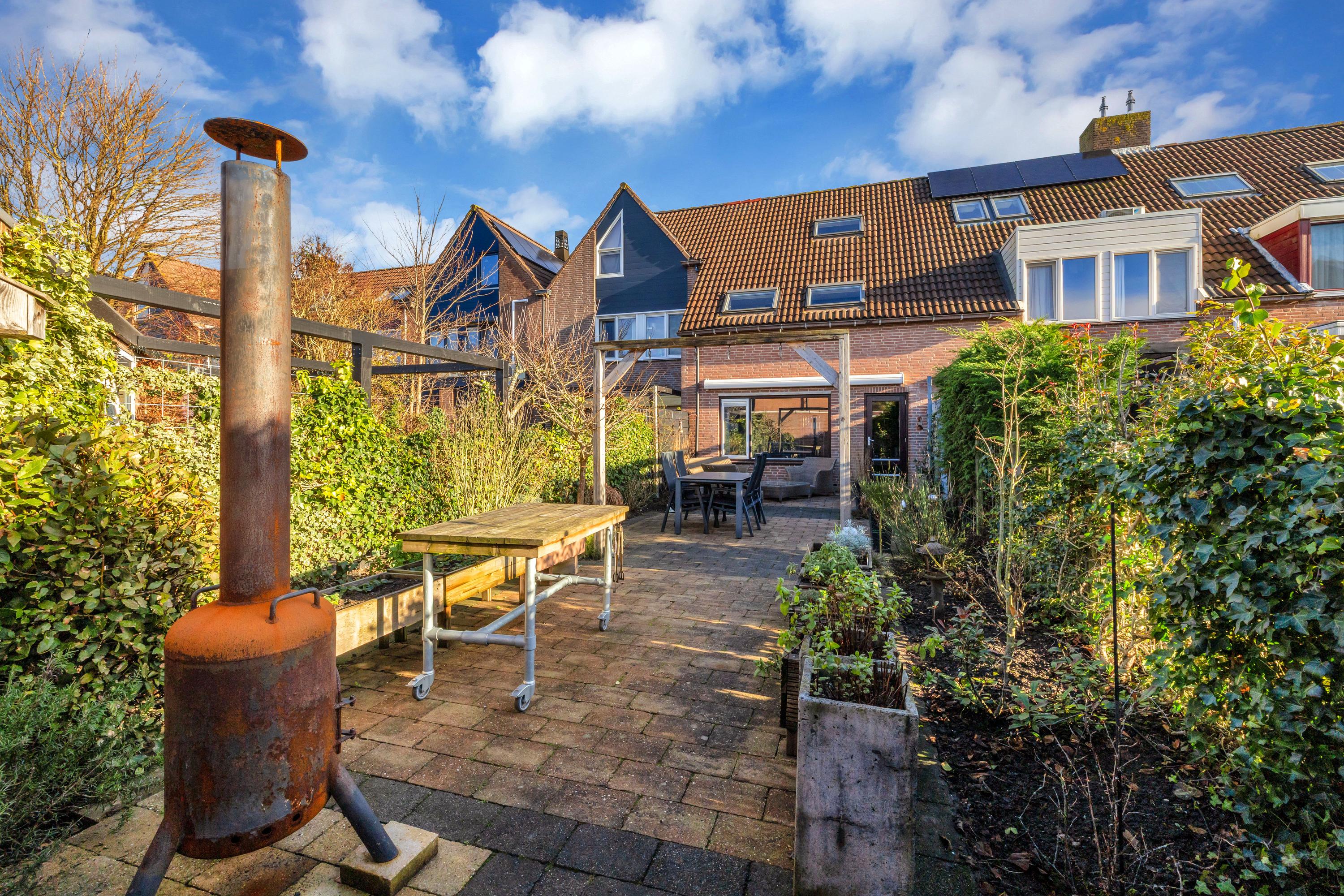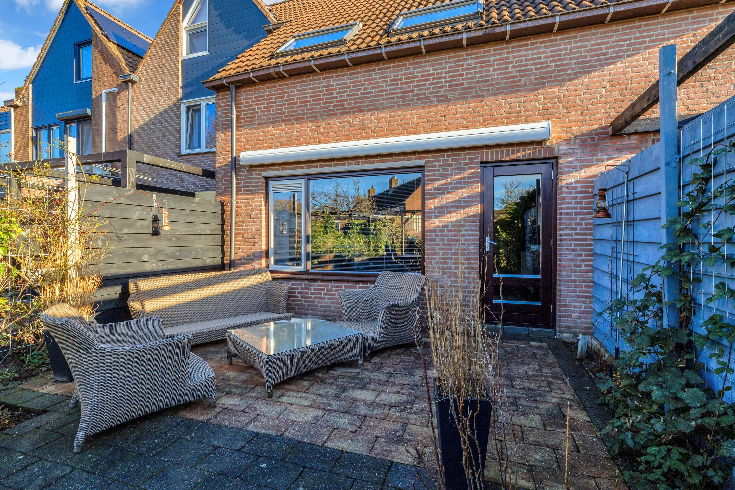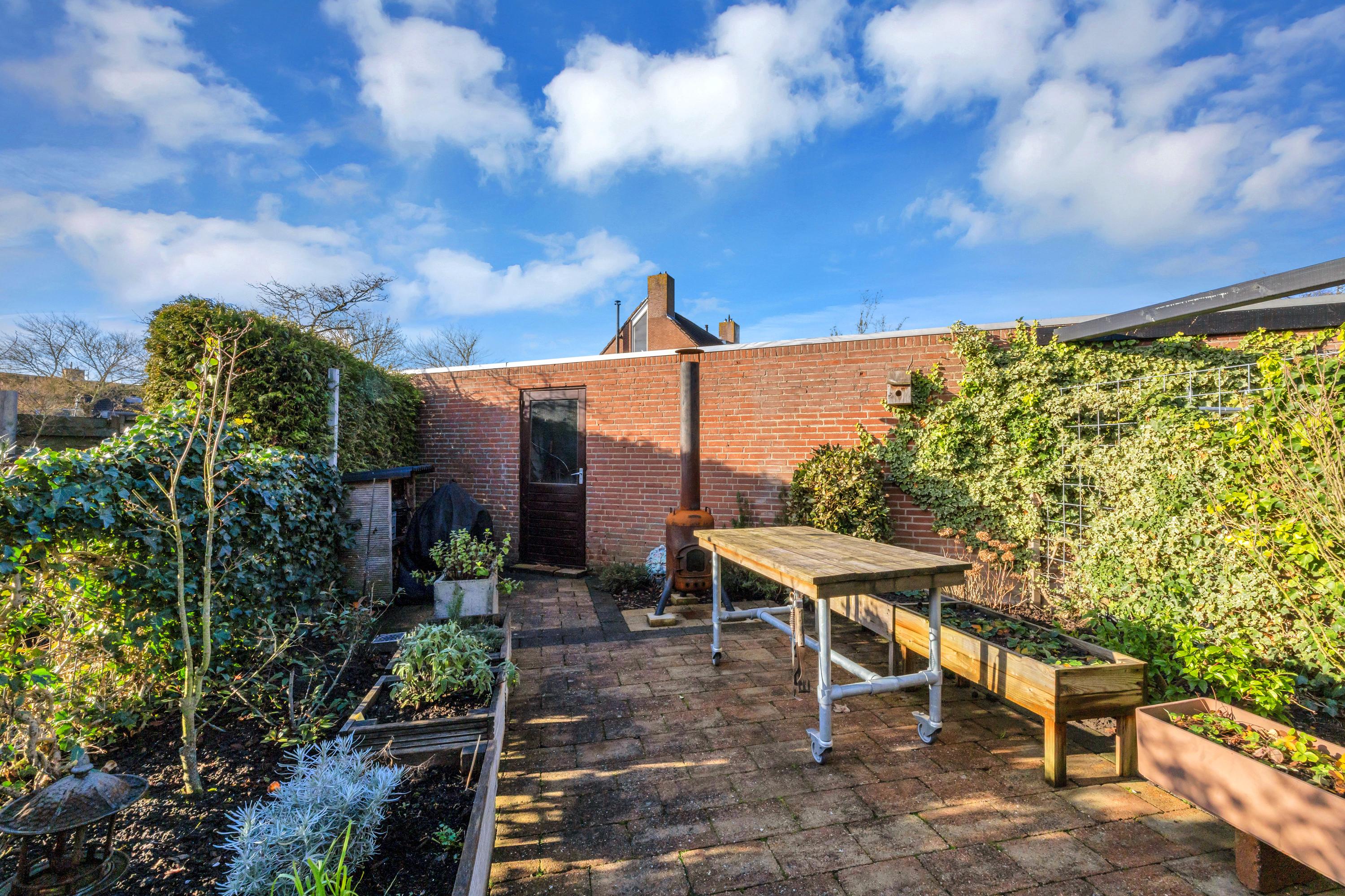 De diepe achtertuin is gelegen op het westen en dus heerlijk zonnig. Hier geniet u de gehele dag van de zon. De tuin is afgewerkt met sierbestrating en diverse borders. Achter in de tuin is de garagebox te bereiken.