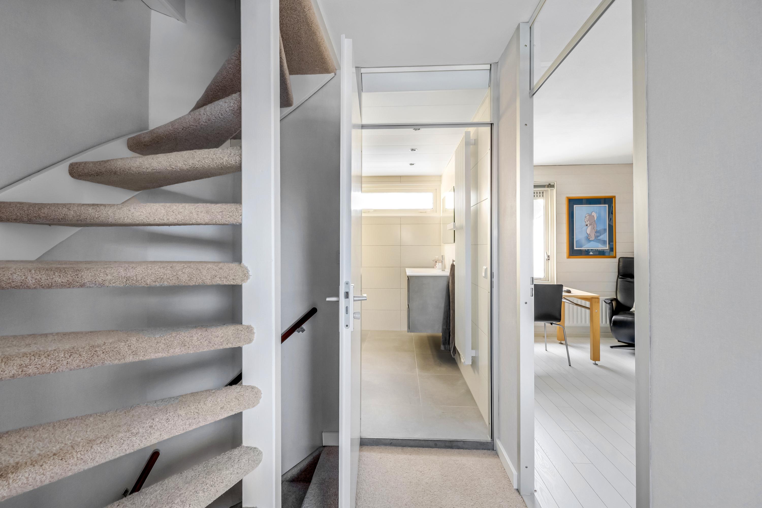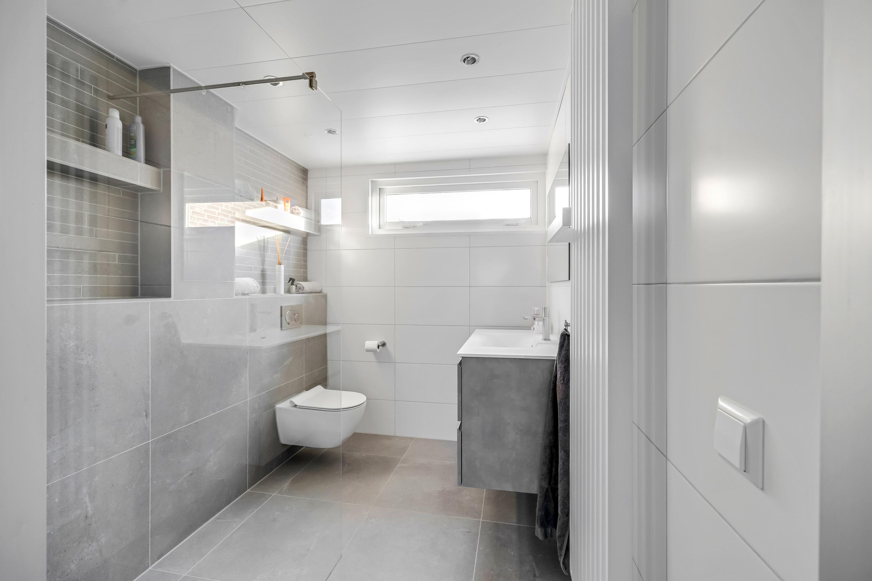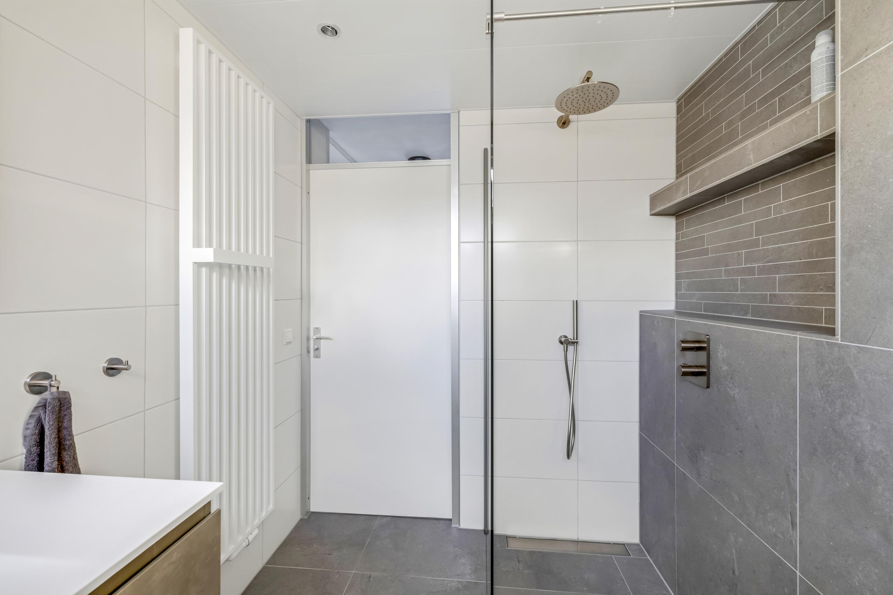 De moderne badkamer (2020) is fraai betegeld en beschikt over een royale inloopdouche, wastafelmeubel, tweede toilet, designradiator en raam.