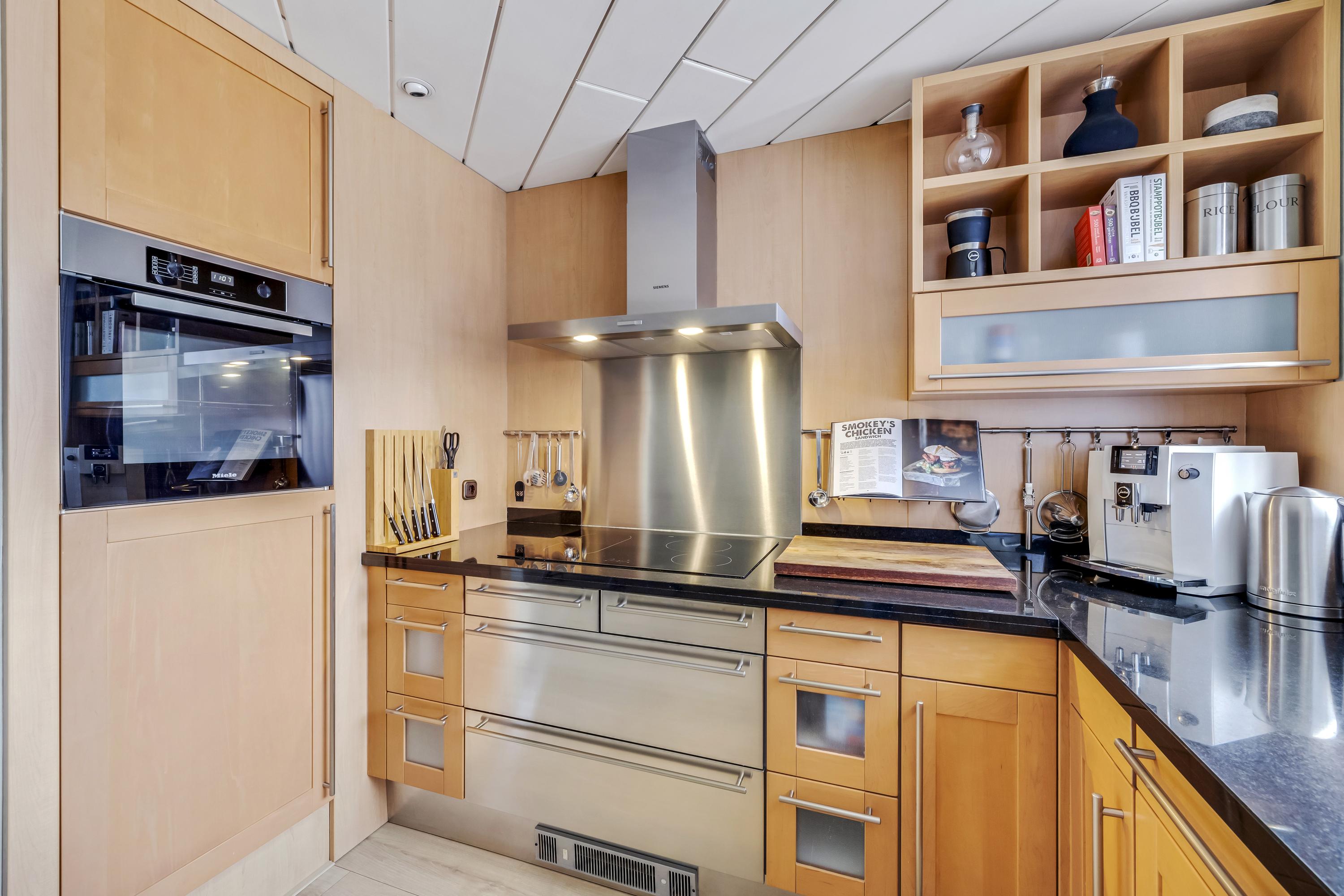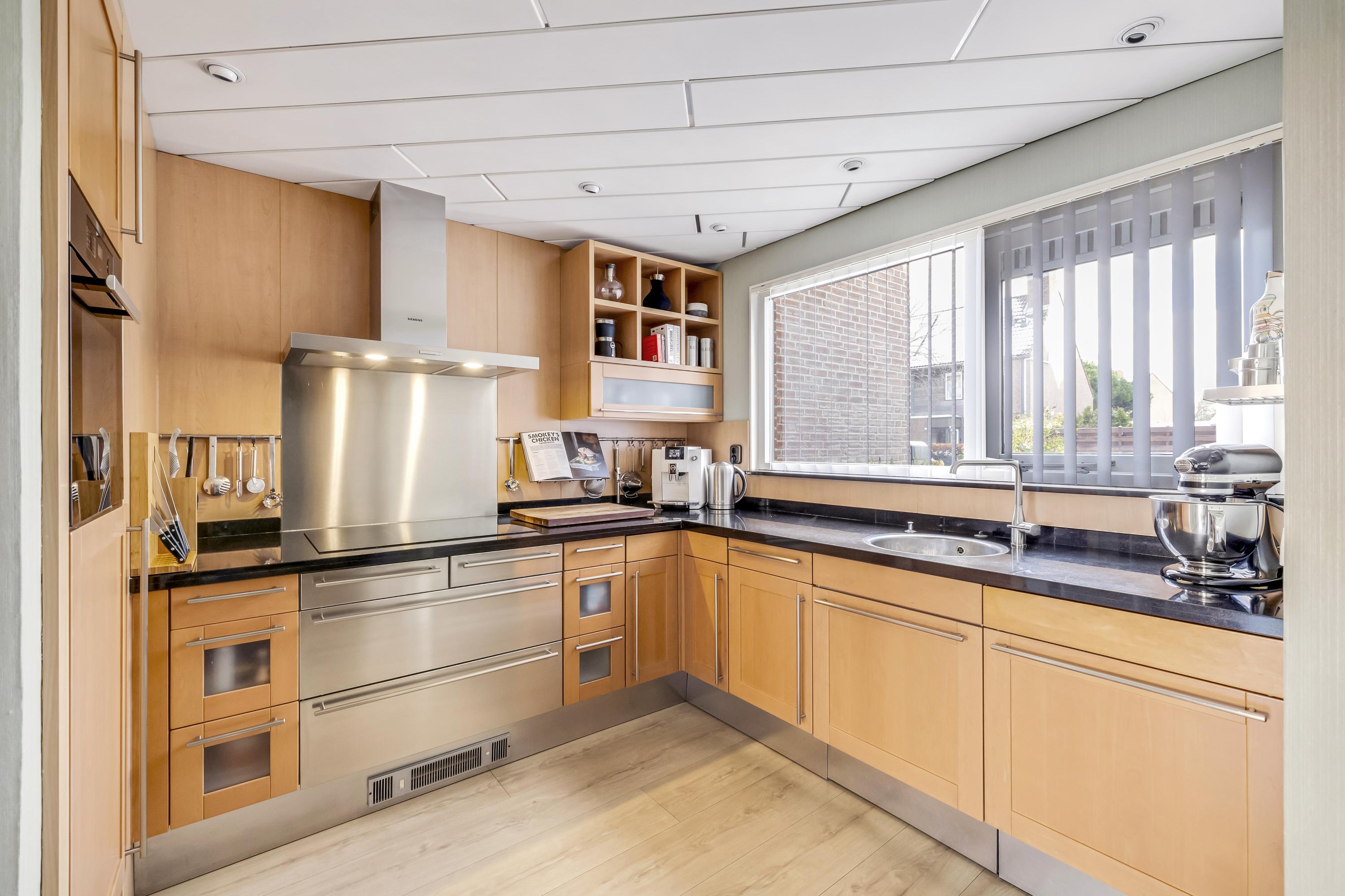 De open keuken is gelegen aan de voorzijde en is geplaatst in een hoekopstelling. De keuken met hardstenen blad is uitgerust met een spoelbak, inductiekookplaat, afzuigkap, koelkast, vaatwasmachine, oven en plintverwarming.