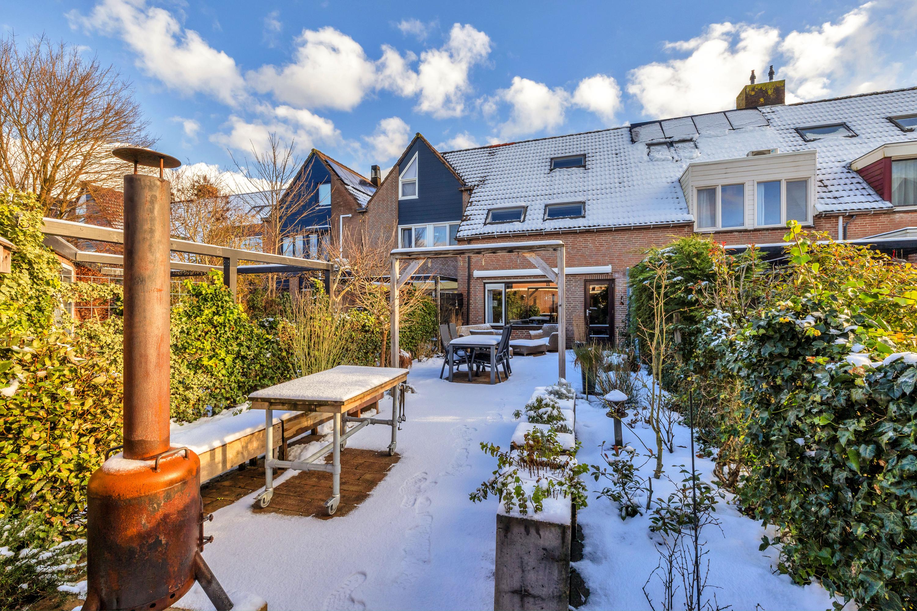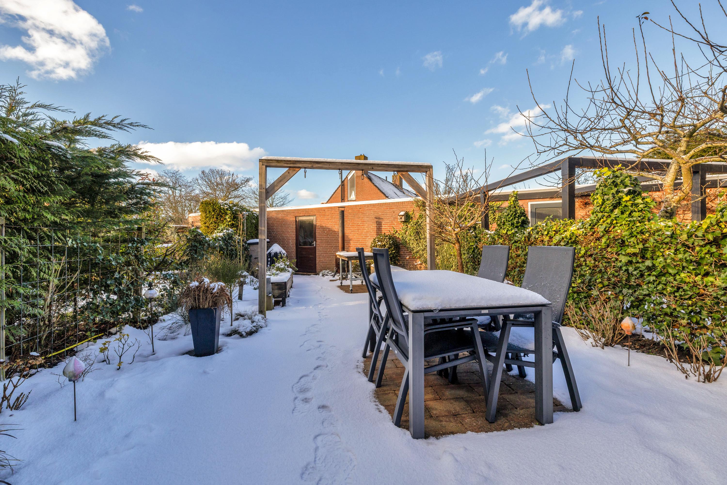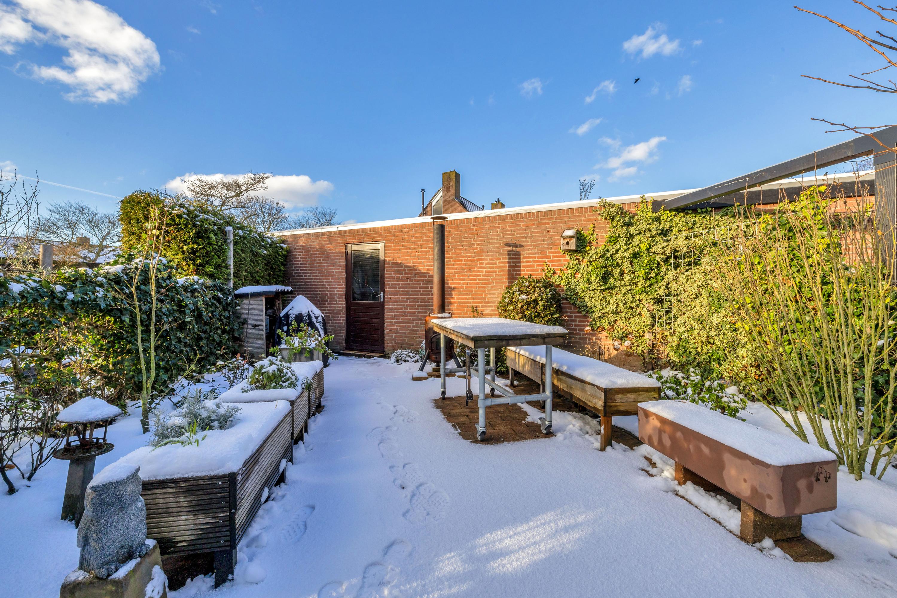 De diepe achtertuin is gelegen op het westen en dus heerlijk zonnig. Hier geniet u de gehele dag van de zon. De tuin is afgewerkt met sierbestrating en diverse borders. Achter in de tuin is de garagebox te bereiken.
