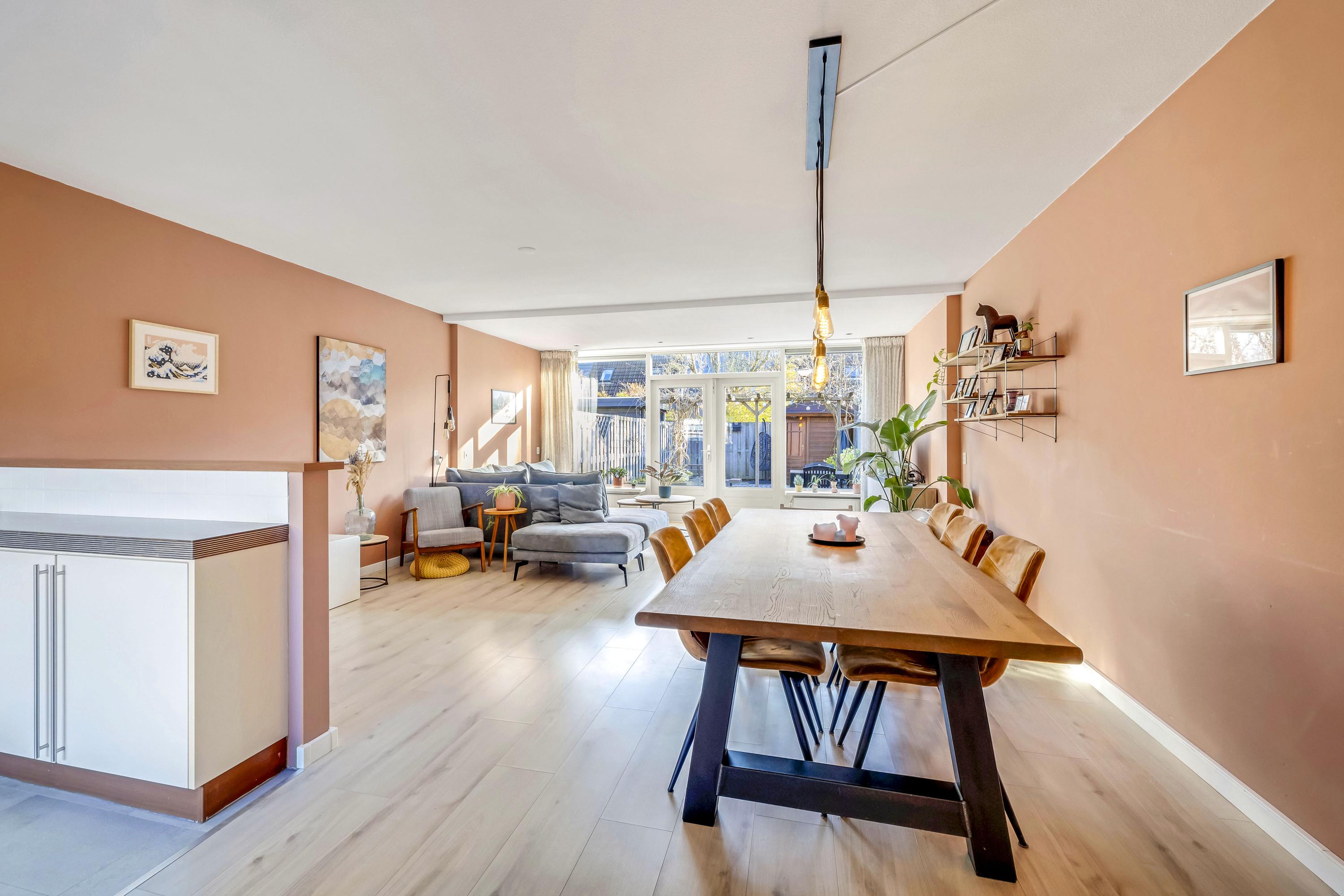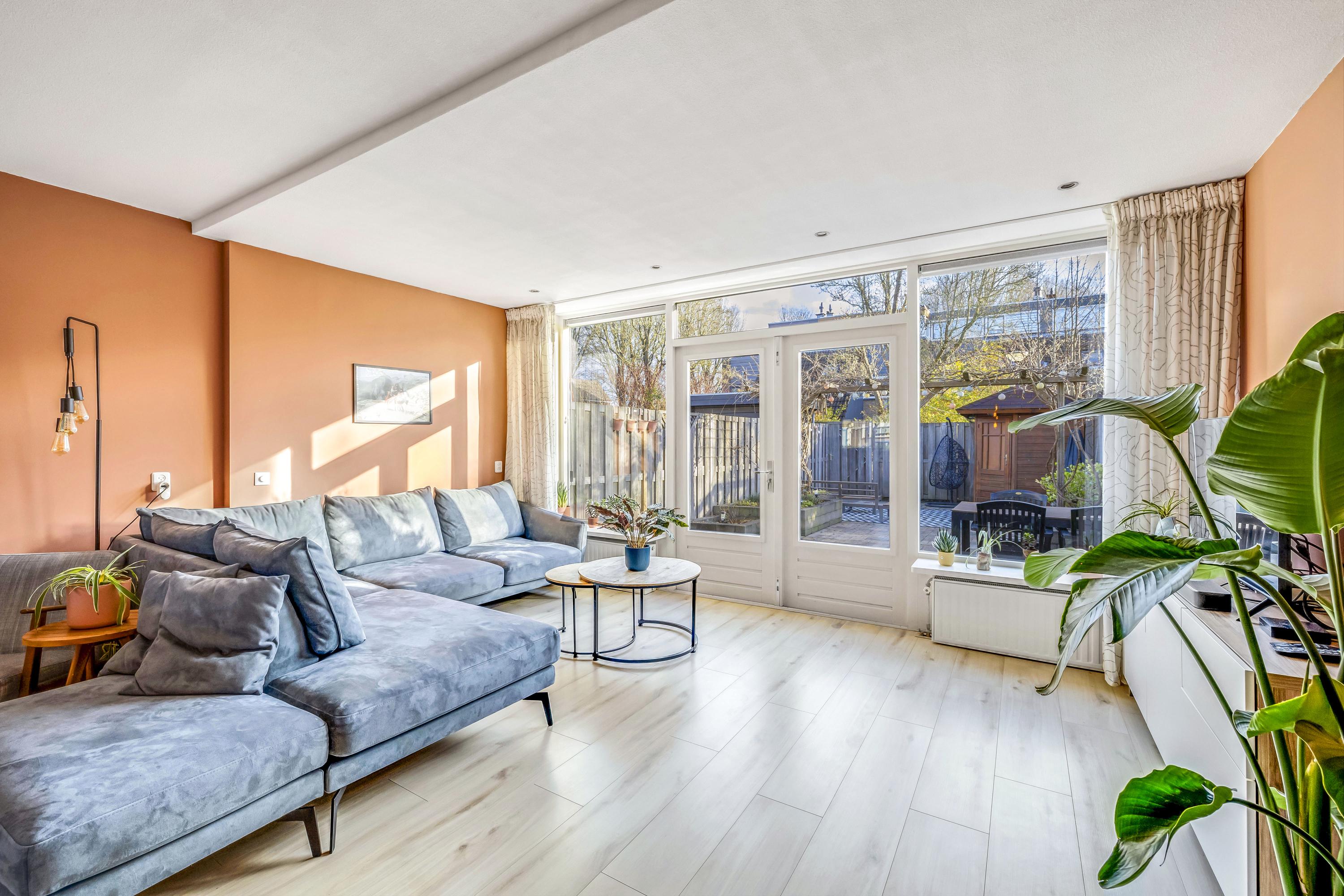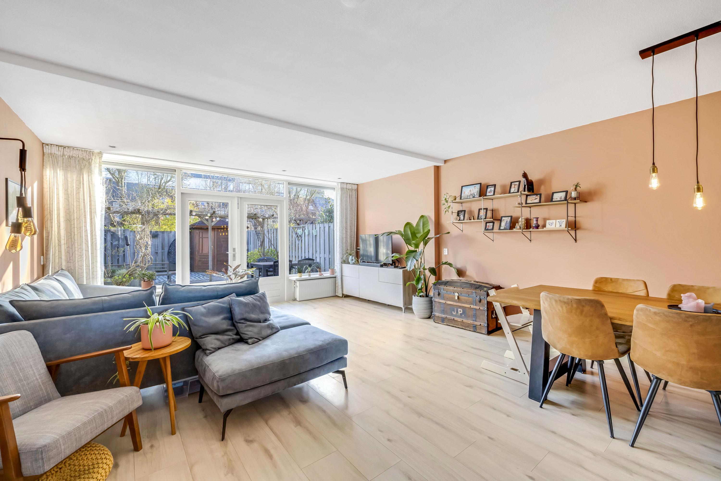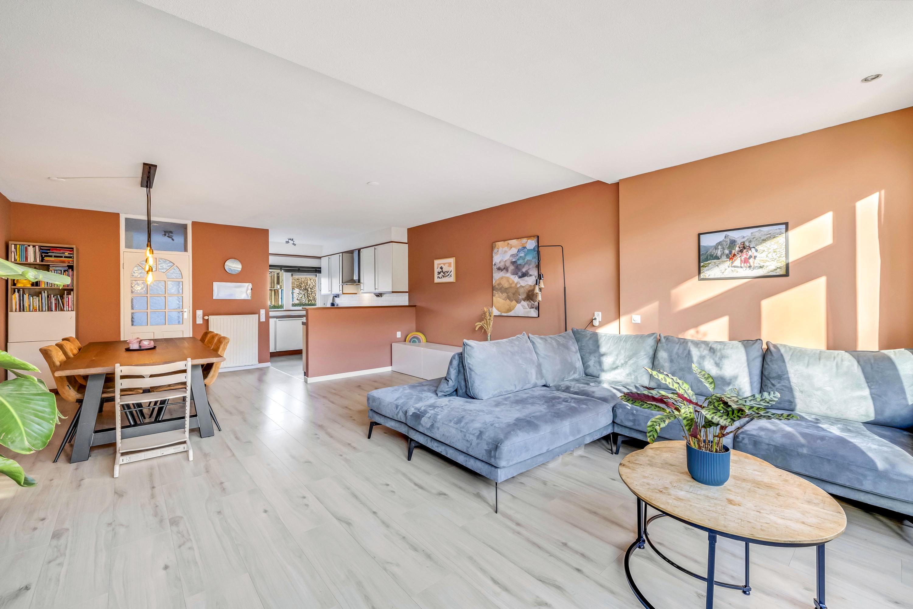 Sfeervolle, lichte woonkamer met grote aanbouw en openslaande deuren naar de achtertuin. De vloer is afgewerkt met laminaat.