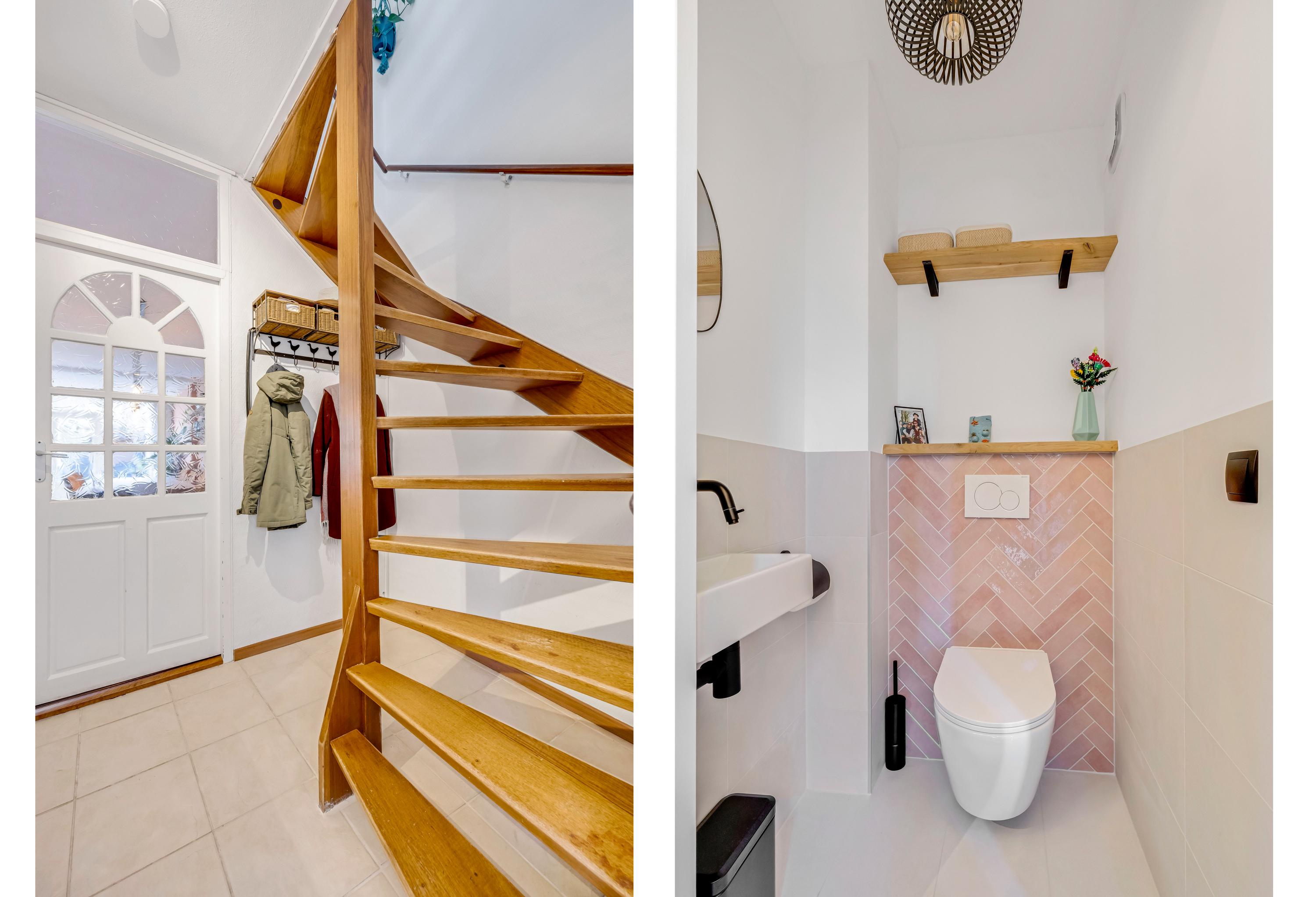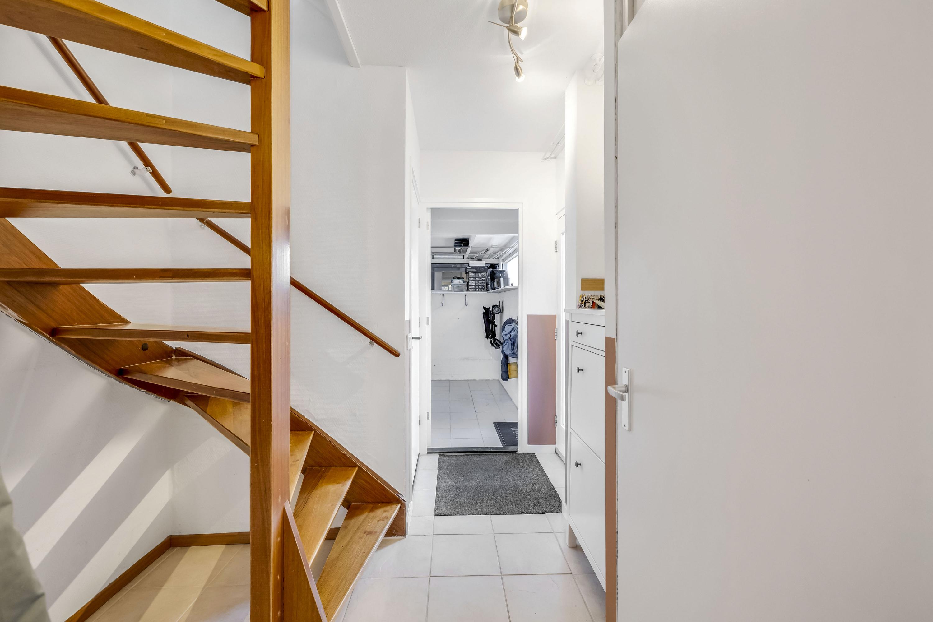 Entree/ hal met garderobe, meterkast met voldoende groepen en aardlekschakelaar, trapopgang, modern toilet met fonteintje. Tevens toegang naar de bijkeuken aan de voorzijde.