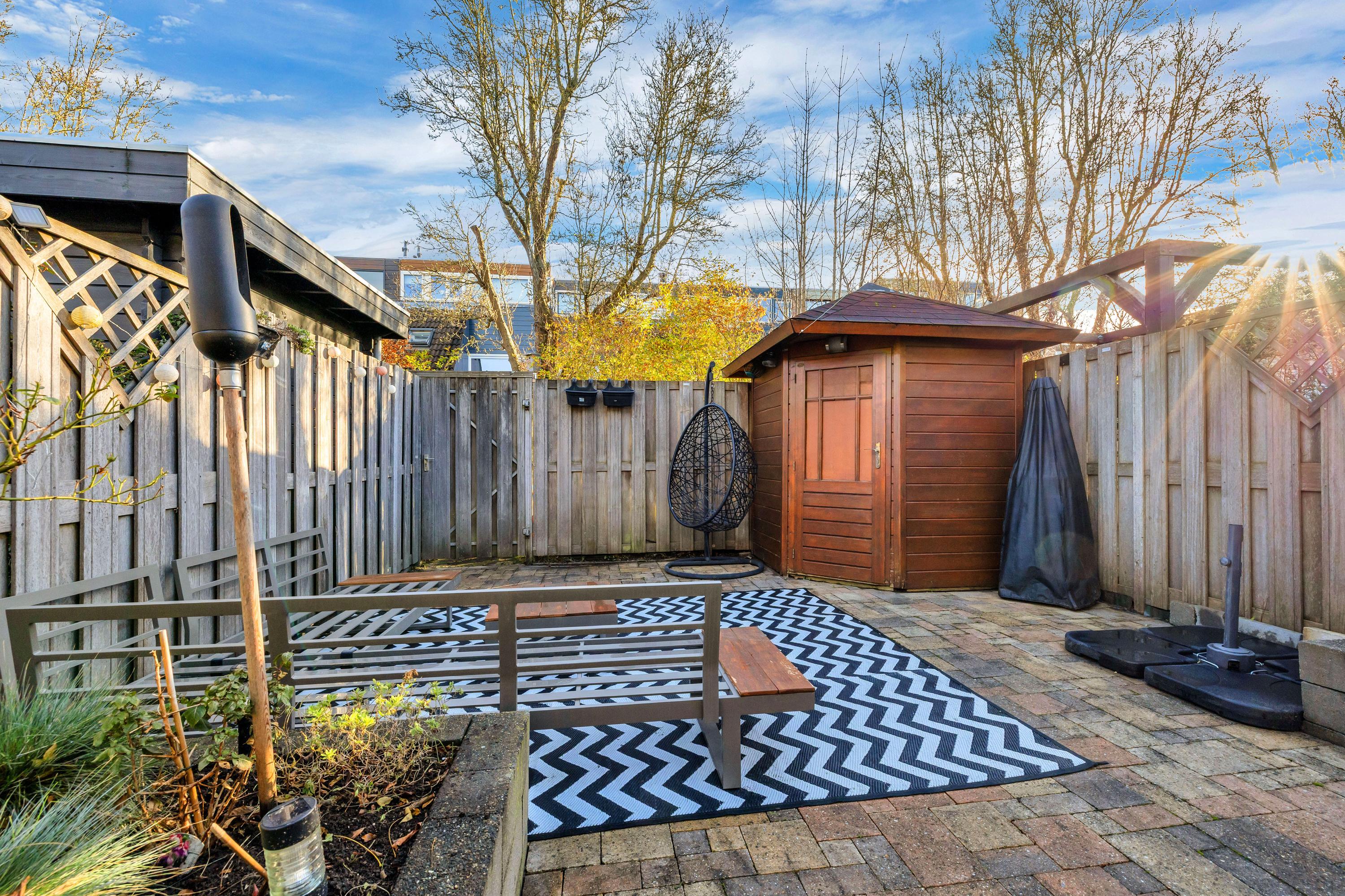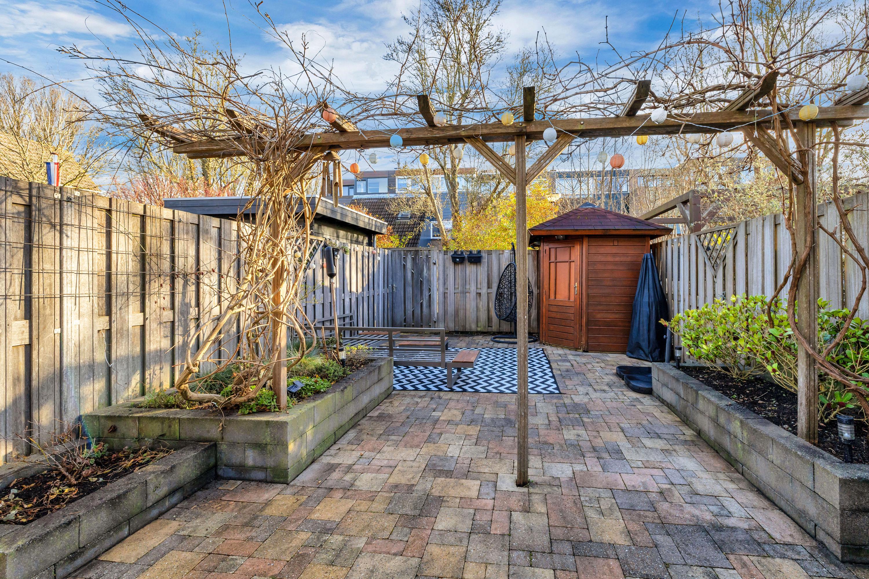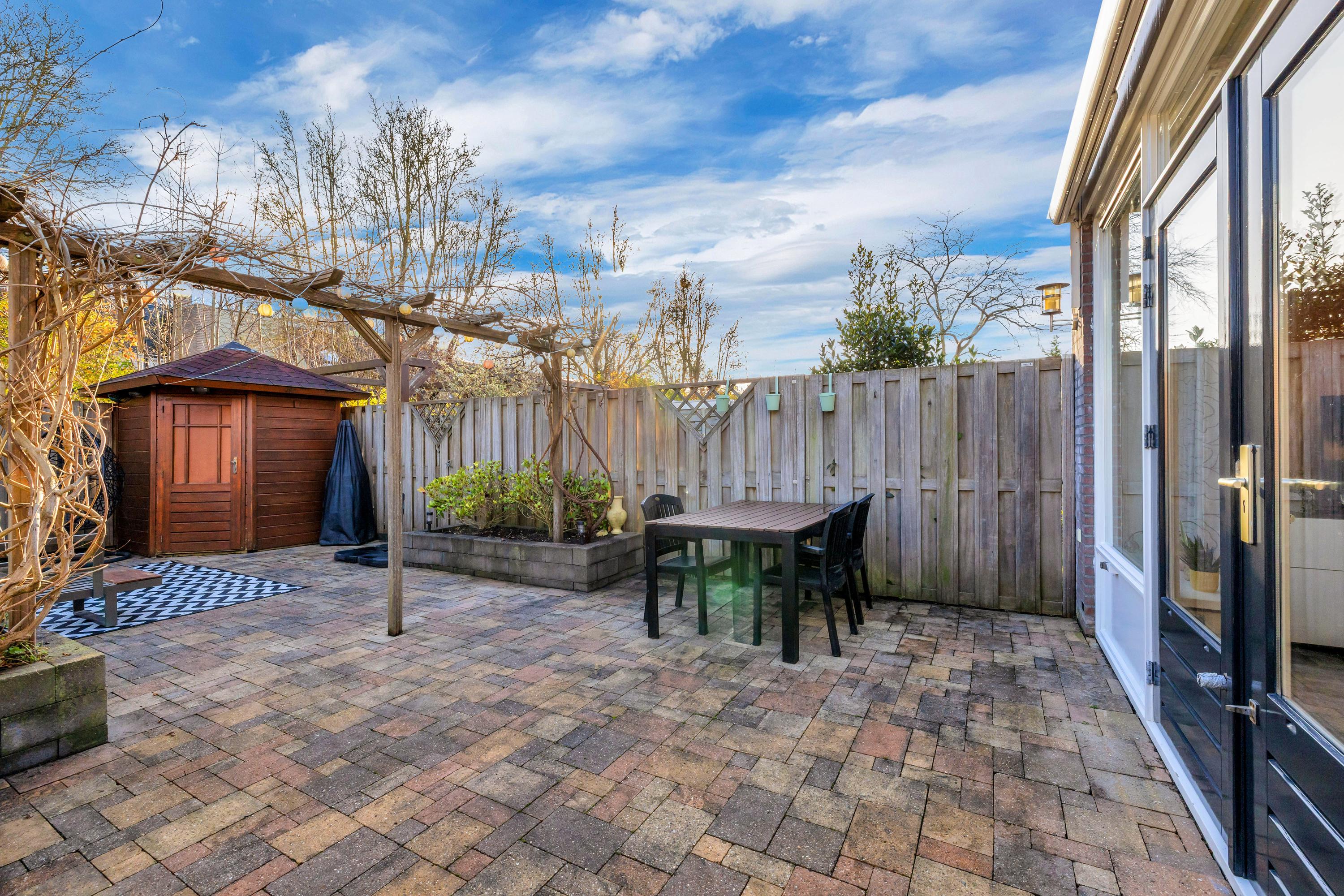 De zonnige diepe tuin is verzorgd en gelegen op het zuid-oosten. Deze is uitgevoerd met terrassen, buitenkraan en borders. Tevens bevindt zich achter in de tuin een houten berging en achterom*.