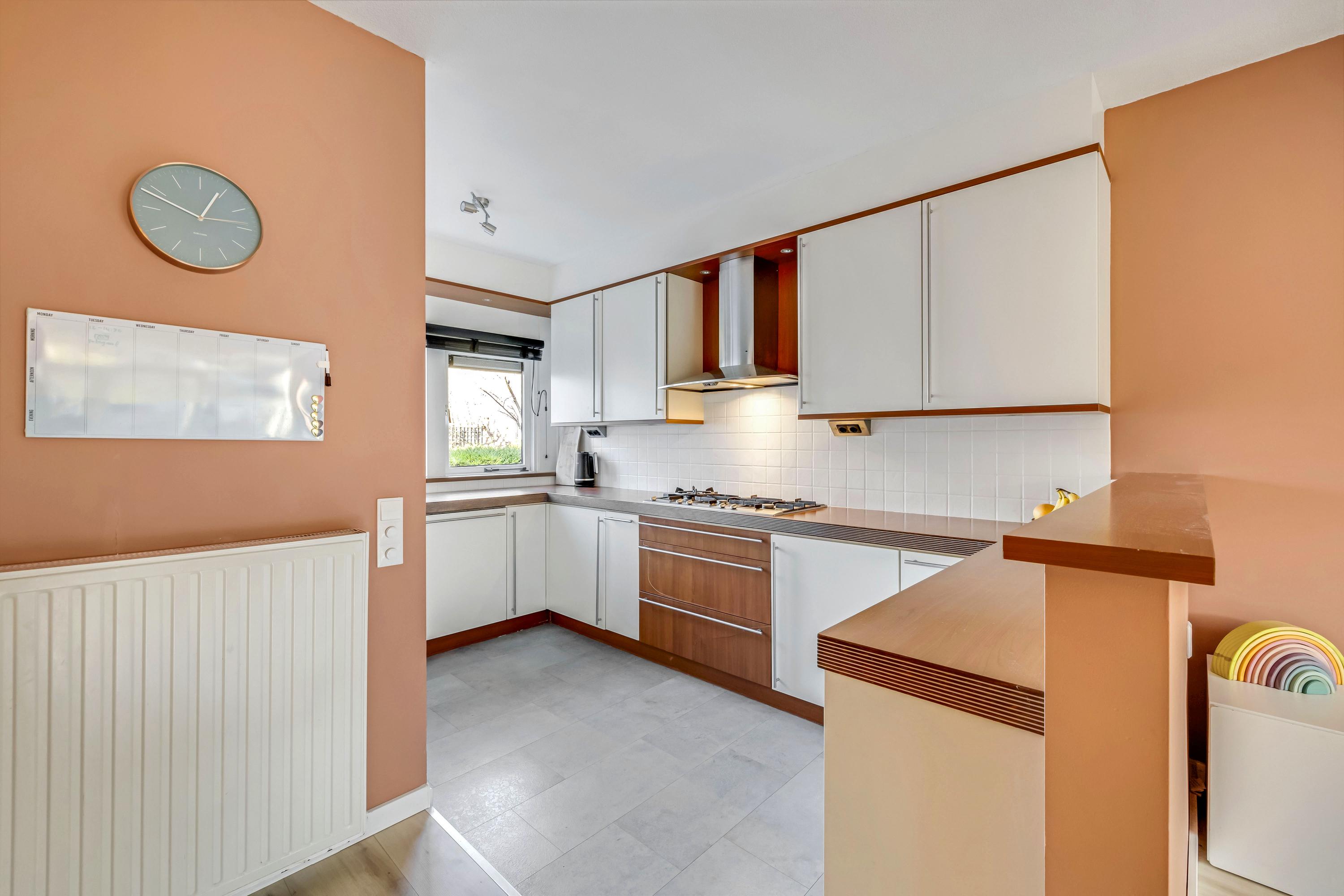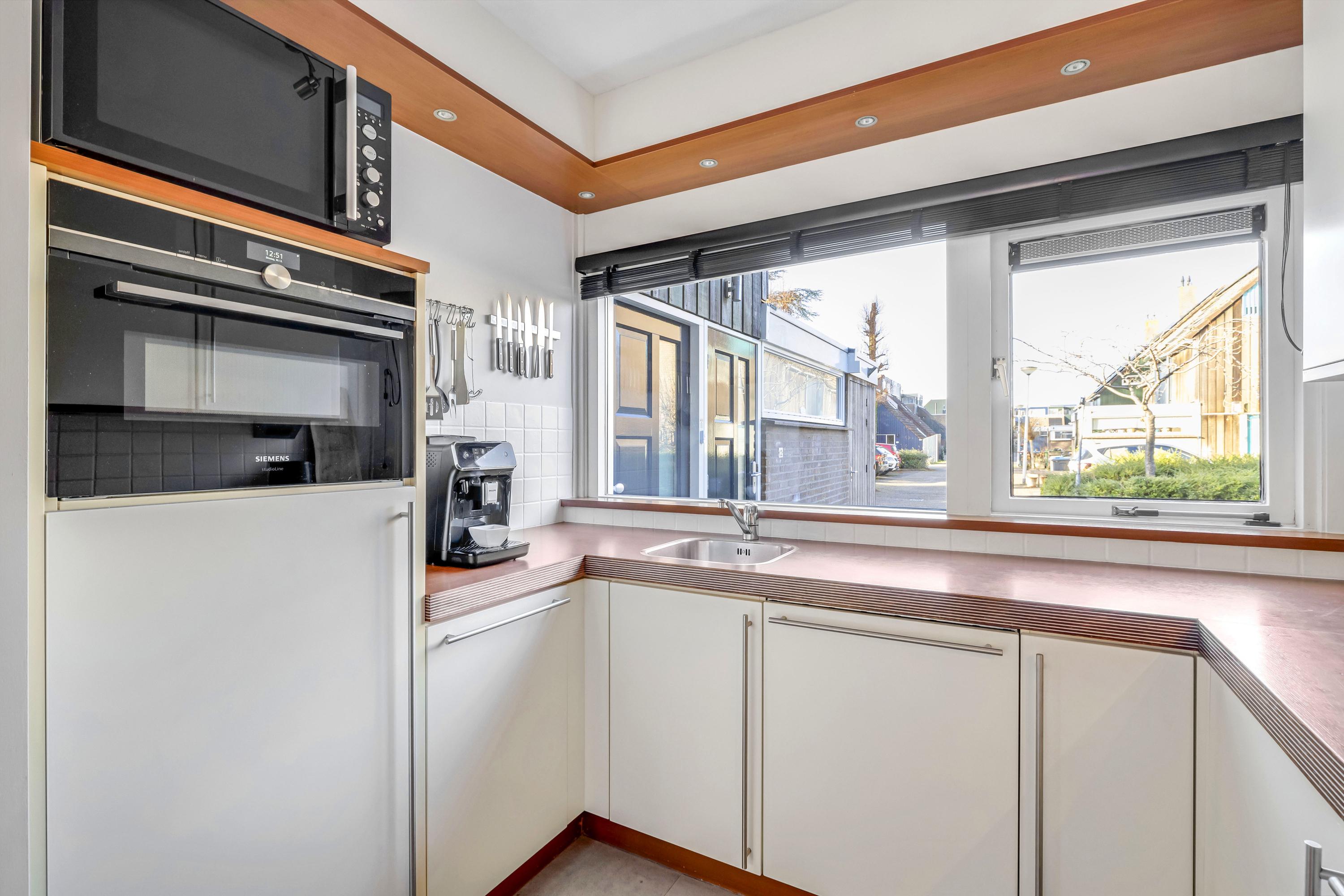 De open keuken bevindt zich aan de voorzijde. De U-opstelling is uitgevoerd met spoelunit, koelkast met vriesvak, combi oven, vaatwasmachine, 5-pits gaskookplaat, rvs afzuigkap, houten werkblad en pvc-vloer. Vanuit het keukenraam kijkt u zo de straat uit en op het plantsoen.