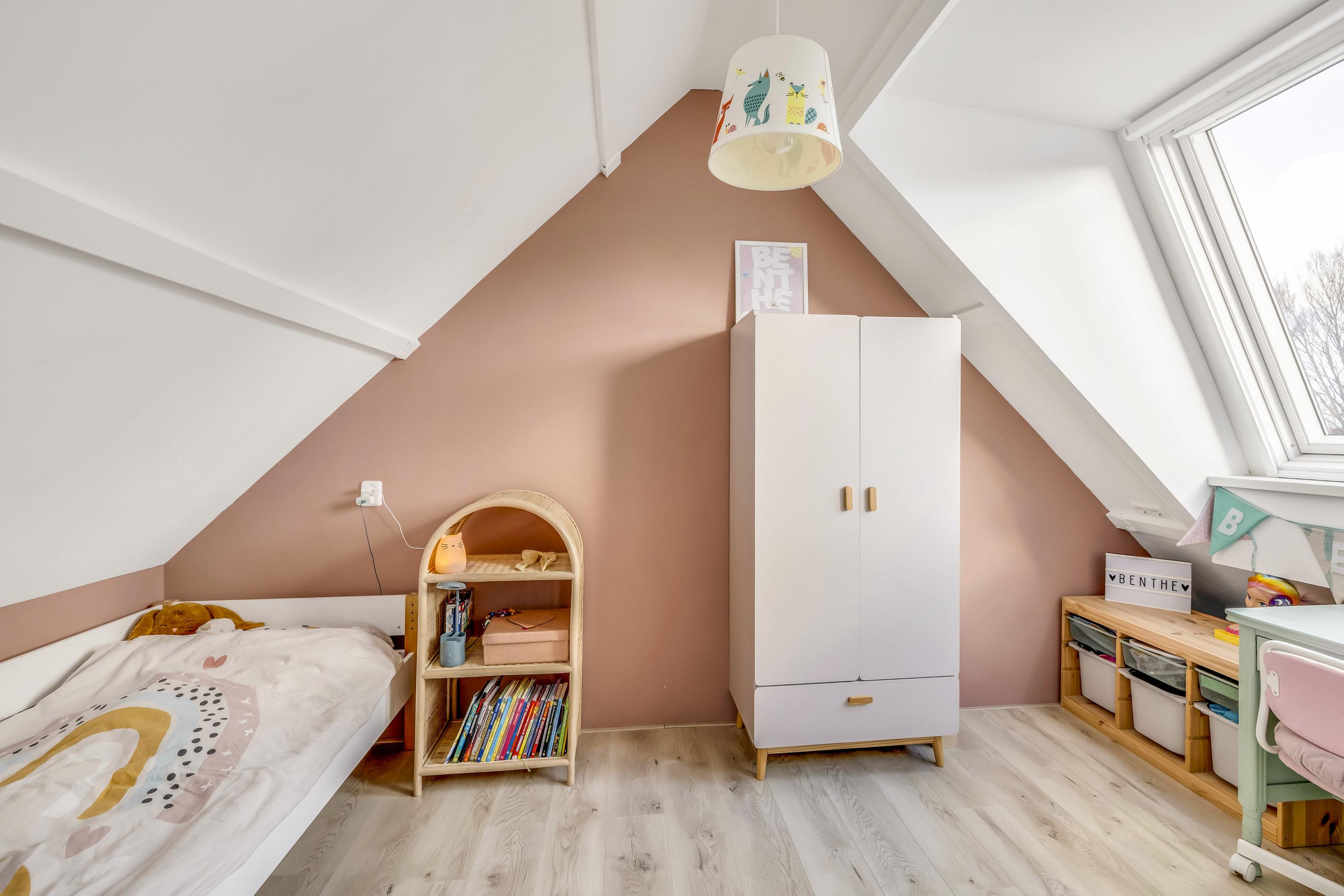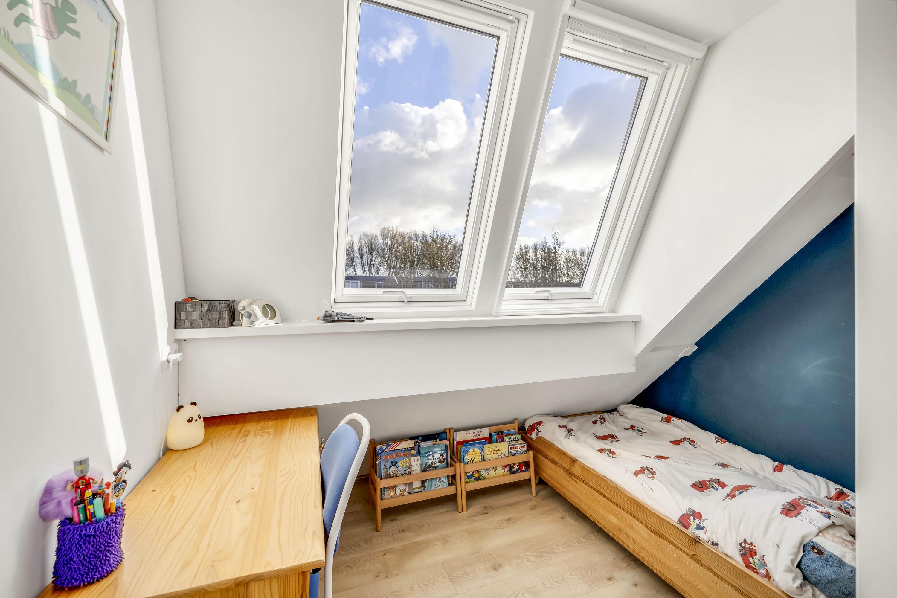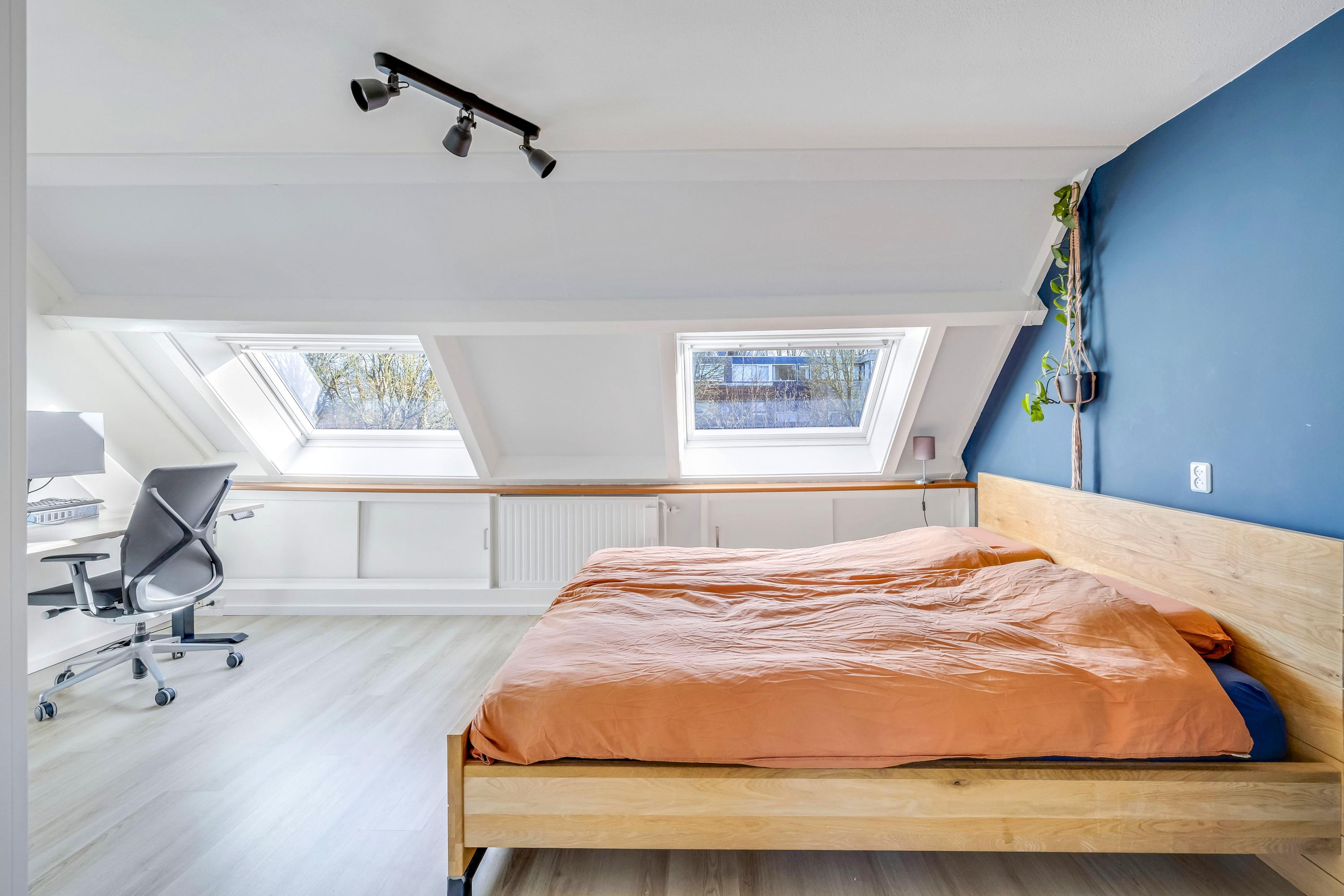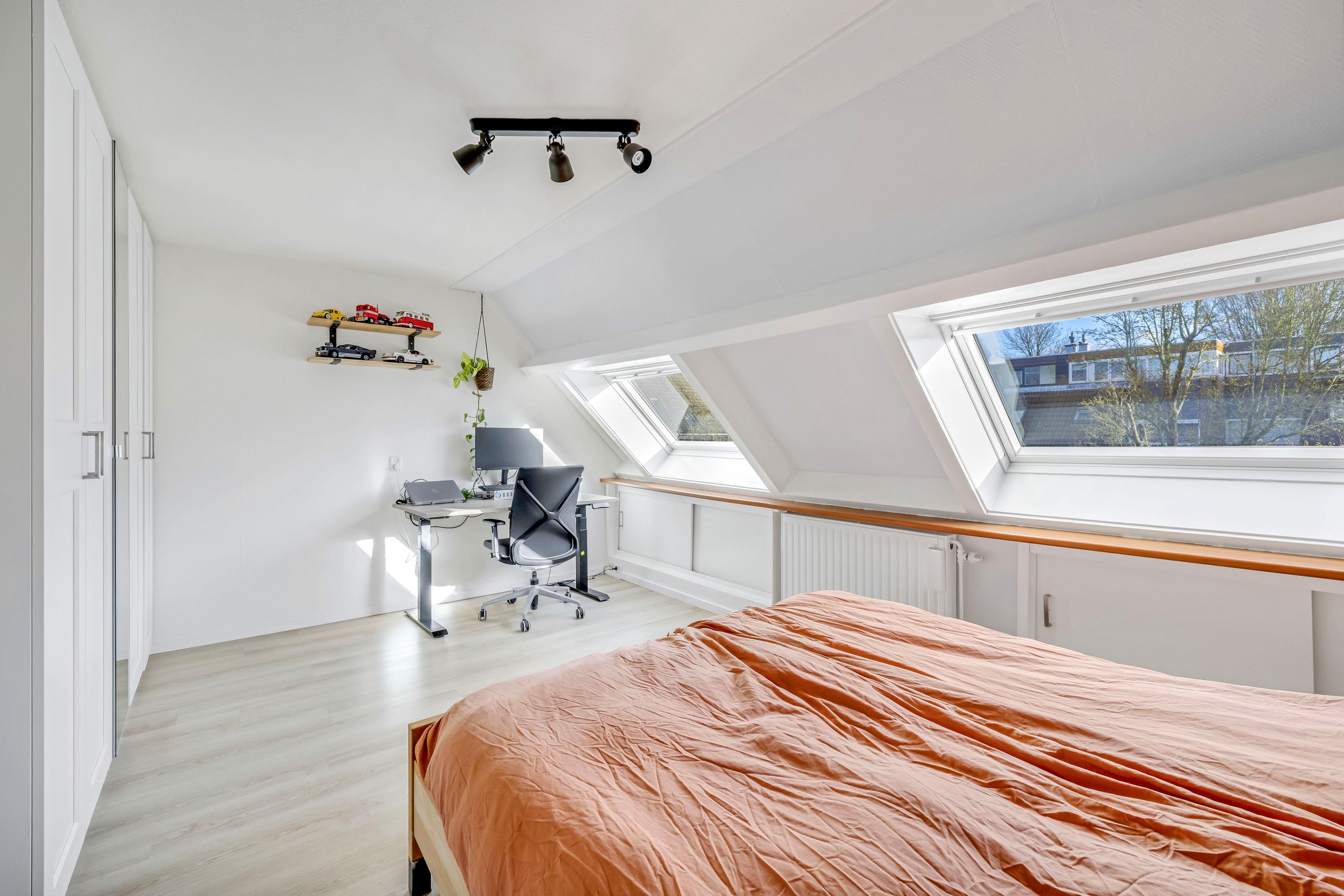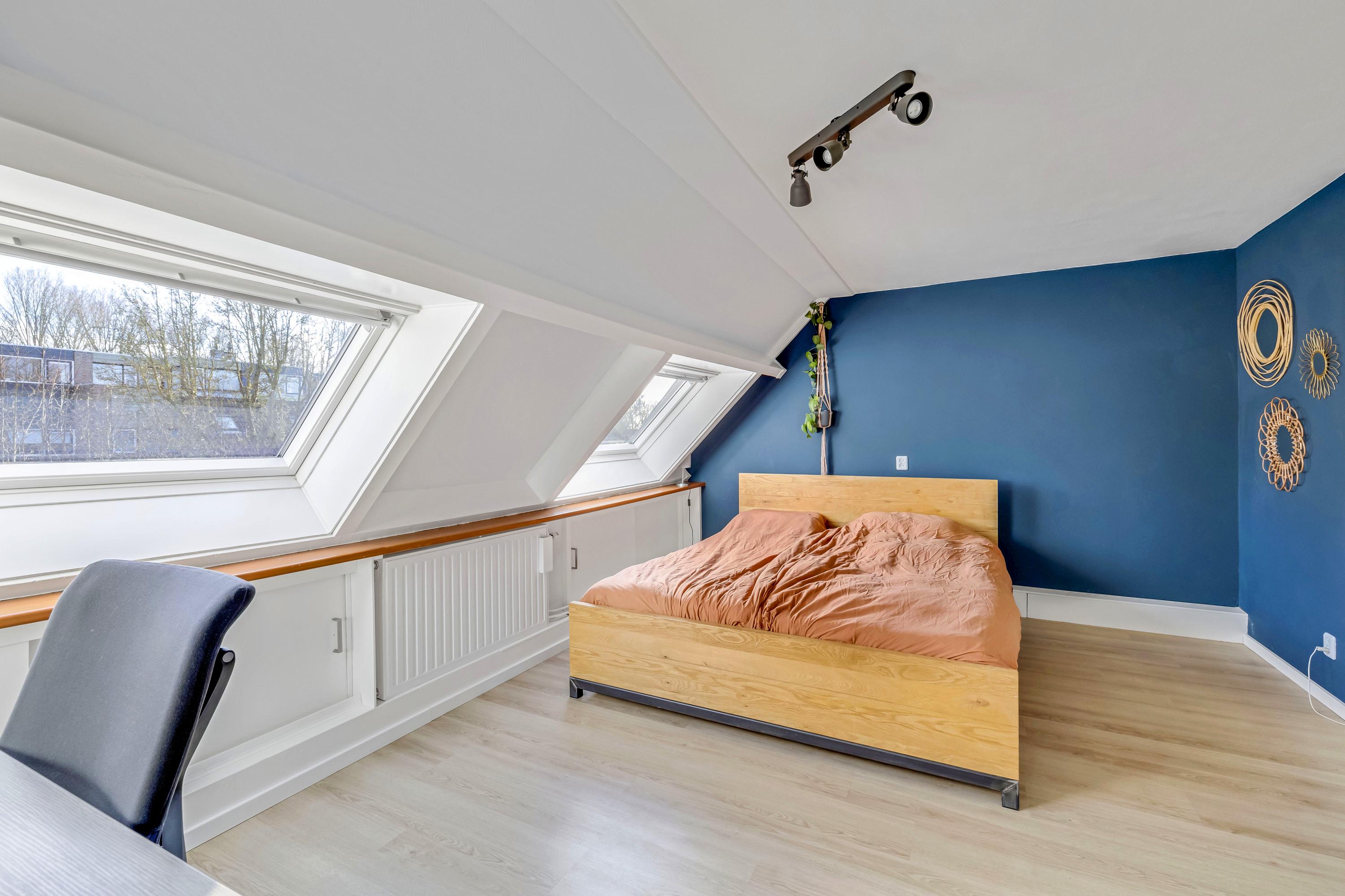 Deze slaapkamer is ruim en beschikt tevens over een dakkapel (2022 Velux modulaire dakkapel), radiator en laminaat.
