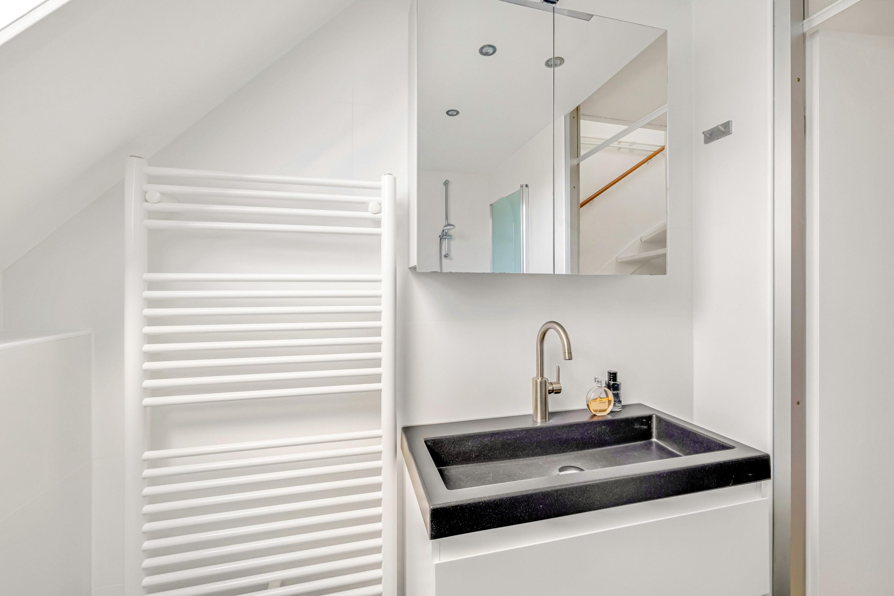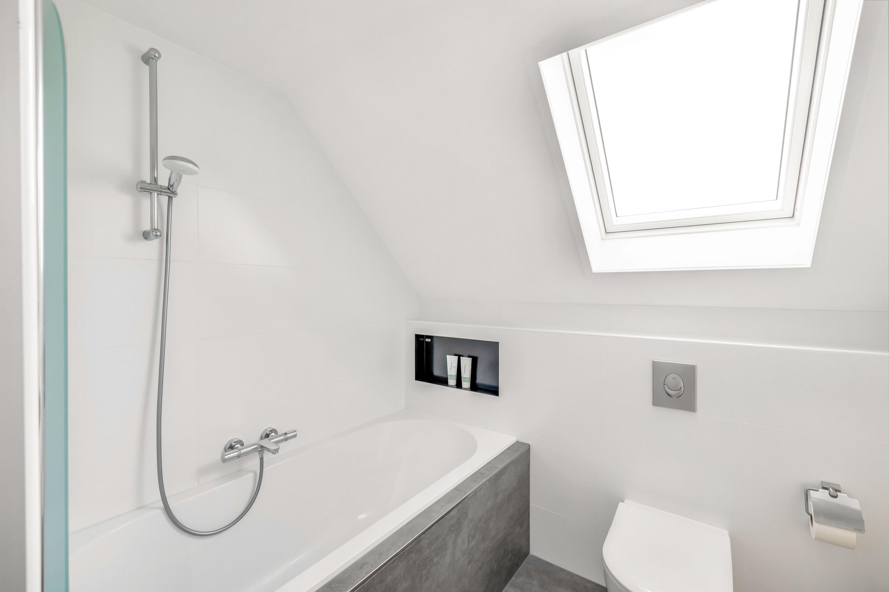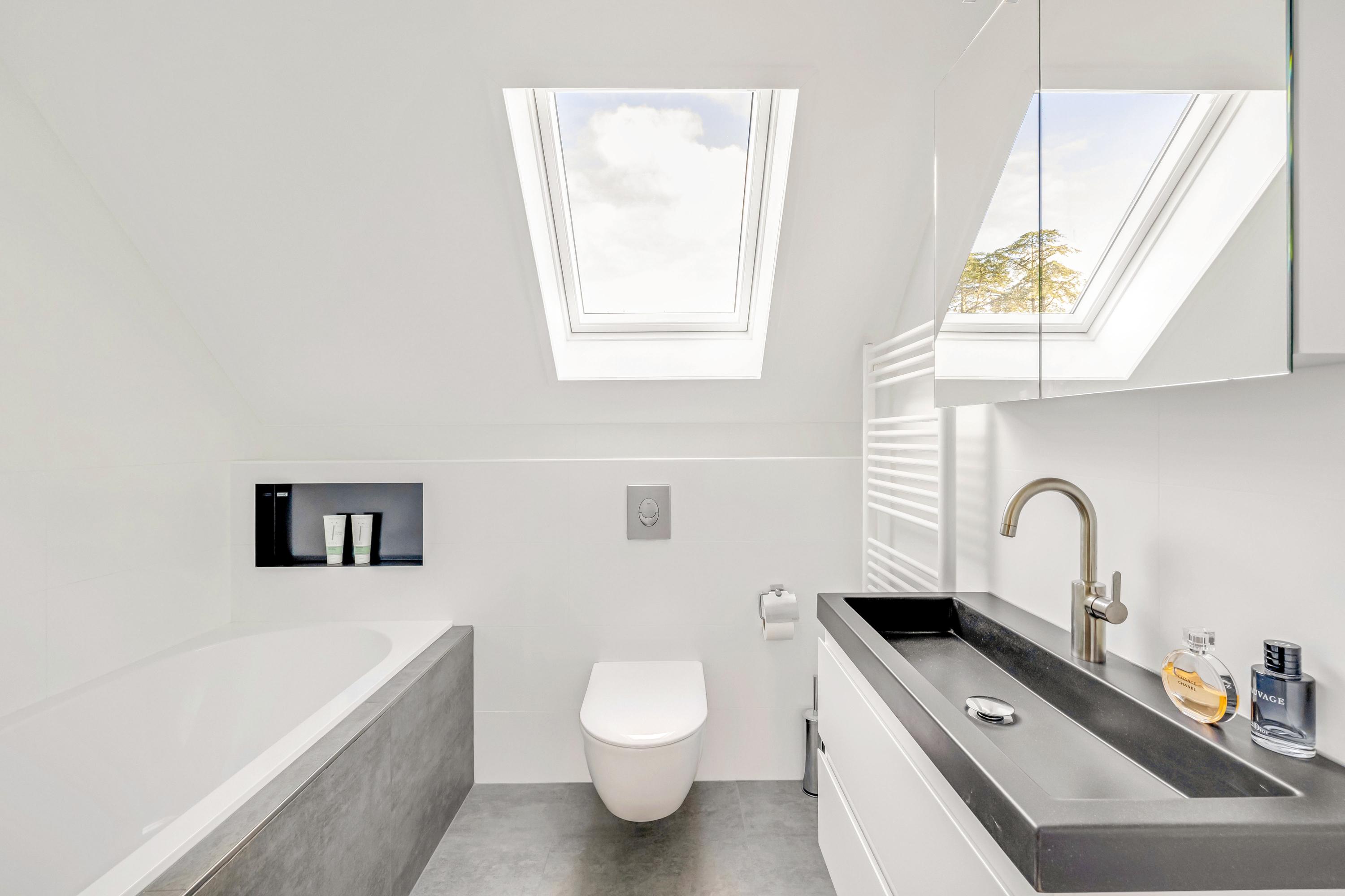 De moderne badkamer (ca. 2020) is uitgevoerd met ligbad met douche, wastafelmeubel, designradiator en dakraam.