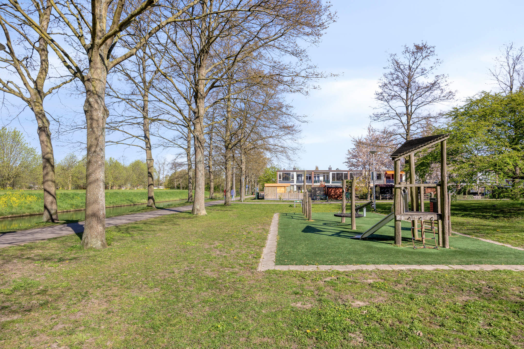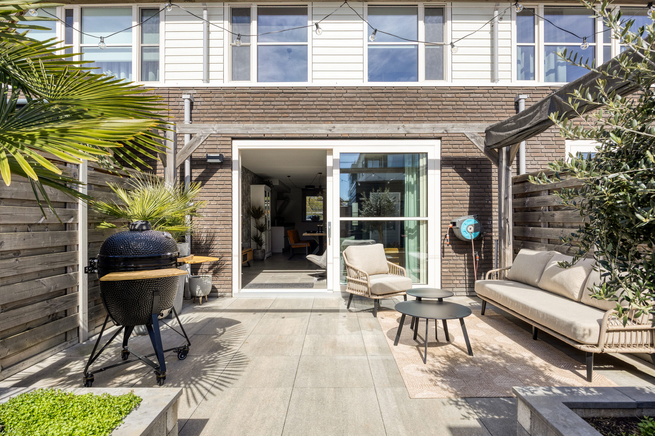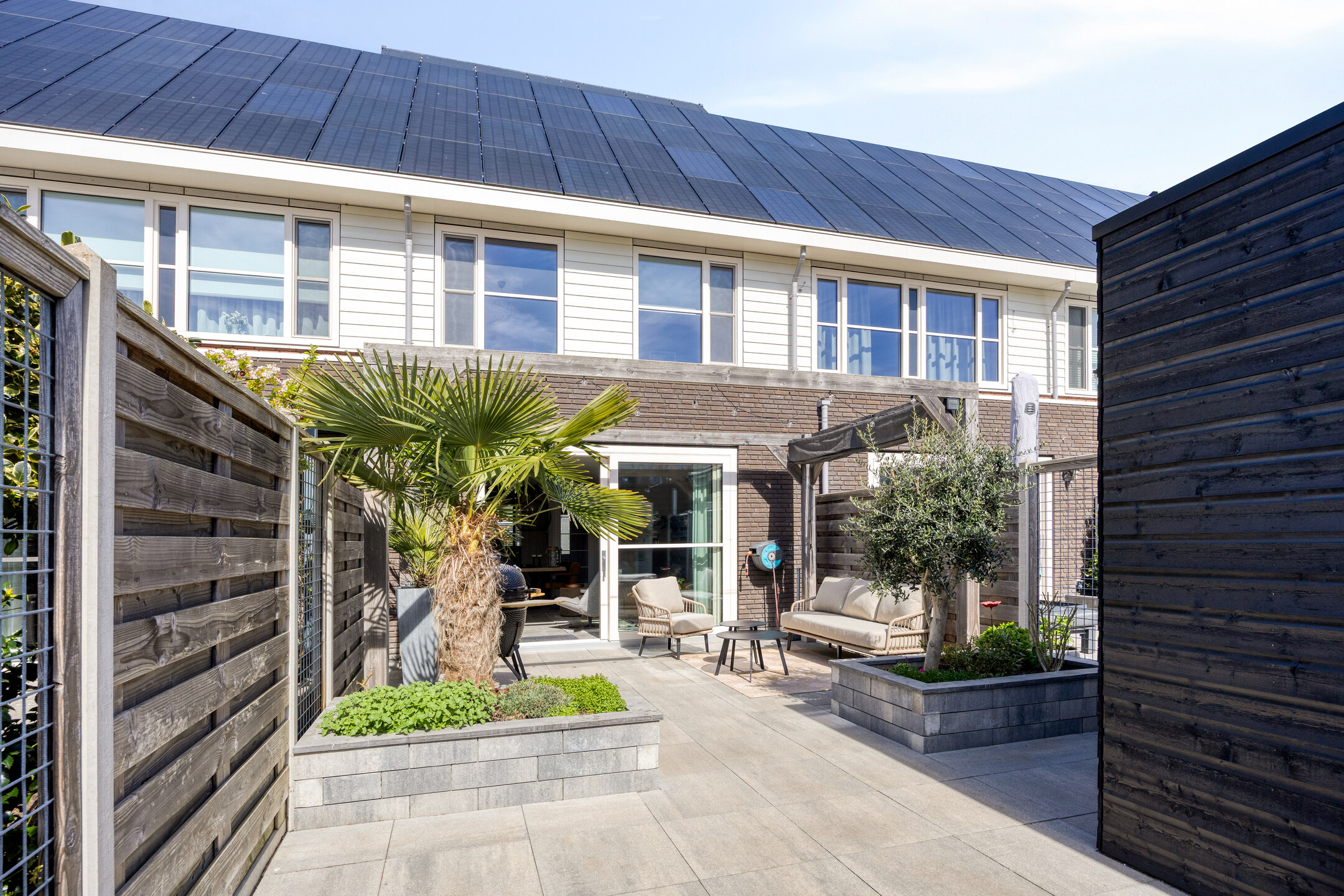 De achtertuin is mooi aangelegd en beschikt over een royaal terras, border, prieel met schaduwdoek en vrijstaande houten berging. Via de poort is er een achterom. Aan het eind van de straat spring je zo het Brielse meer in op warme dagen!